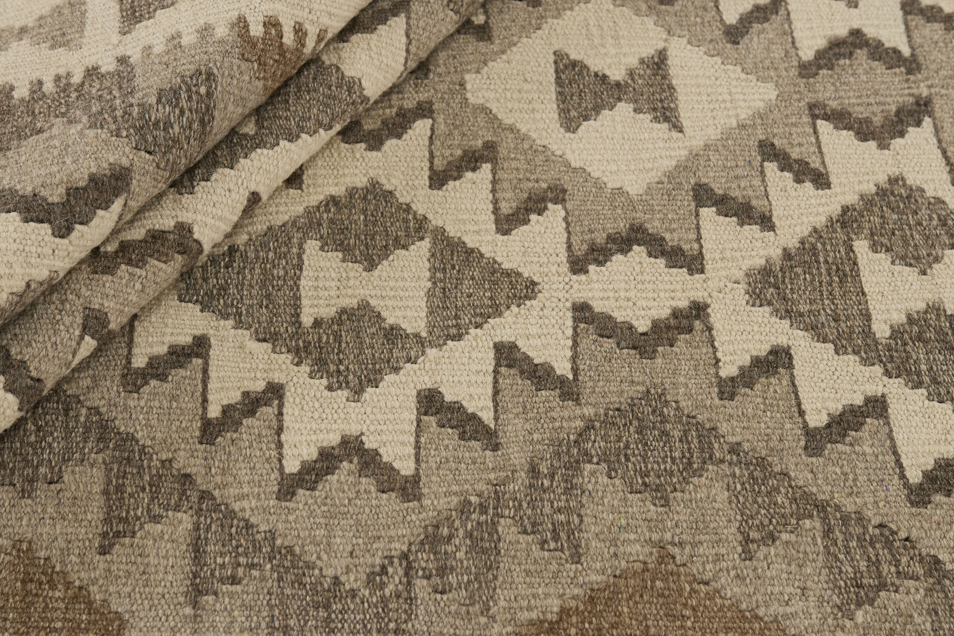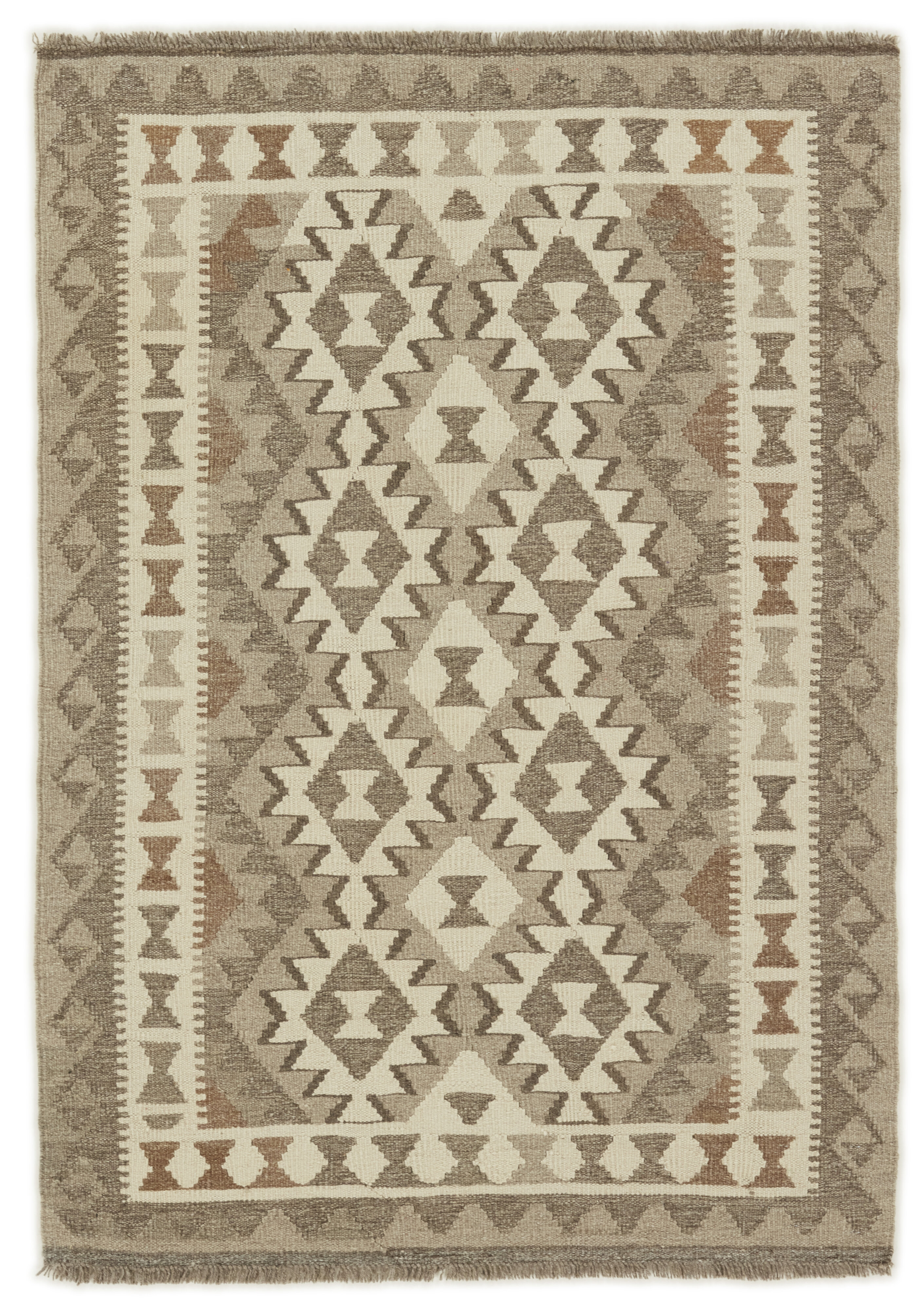 Afghan KelimItem no.: 1517398 Size: 101 cm x 143 cmAfghan Kelim rugs are hand woven by Turkmens in northern Afghanistan. Kelim is the name of a common Persian weave, but also of the technology used in the production. Kelims are primarily produced by nomads and are pile-less rugs, which are also used for bags, as wall decoration, or as curtains for tents. A natural colour scale with geometrical symbols and octagons is used.