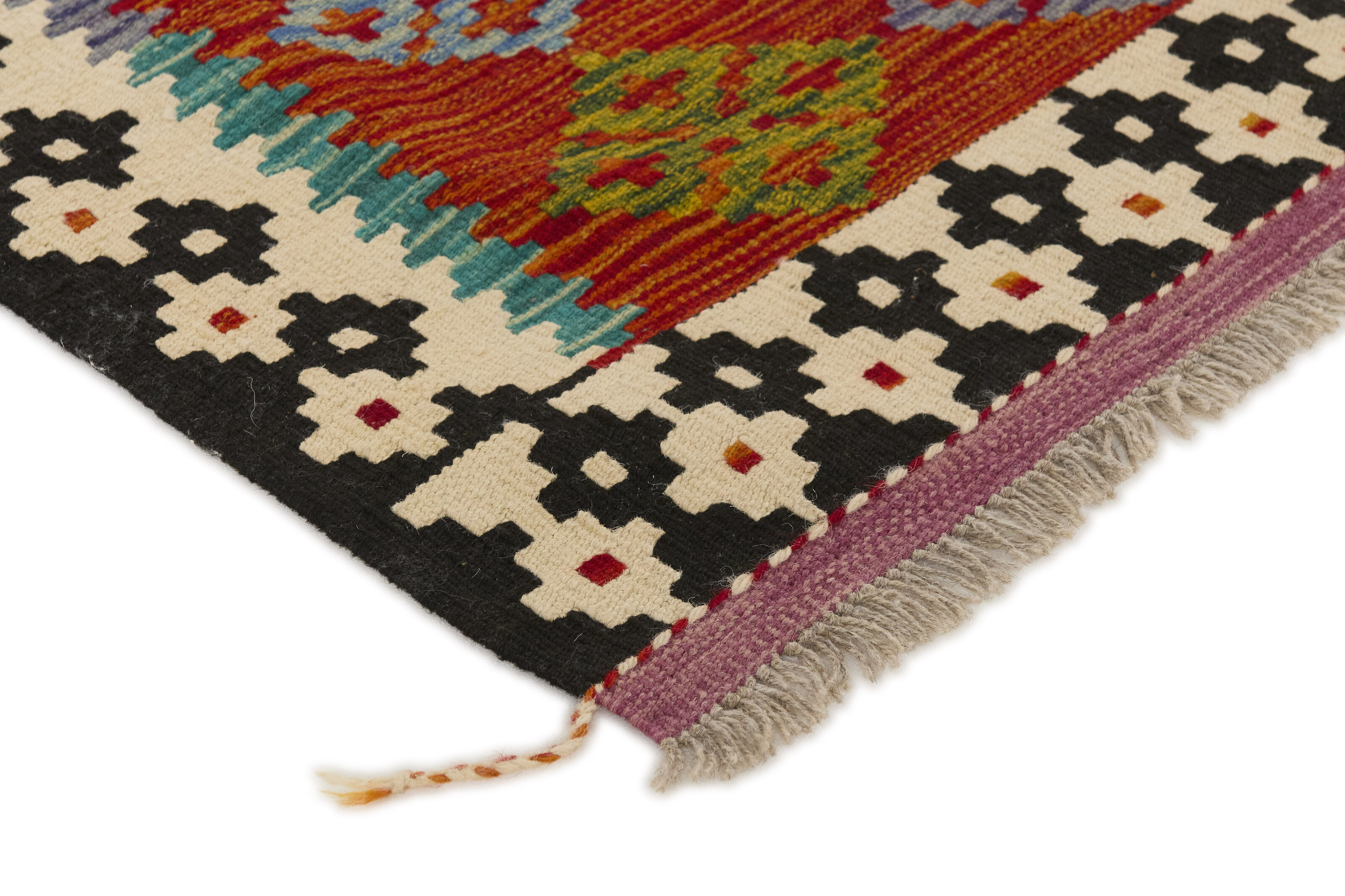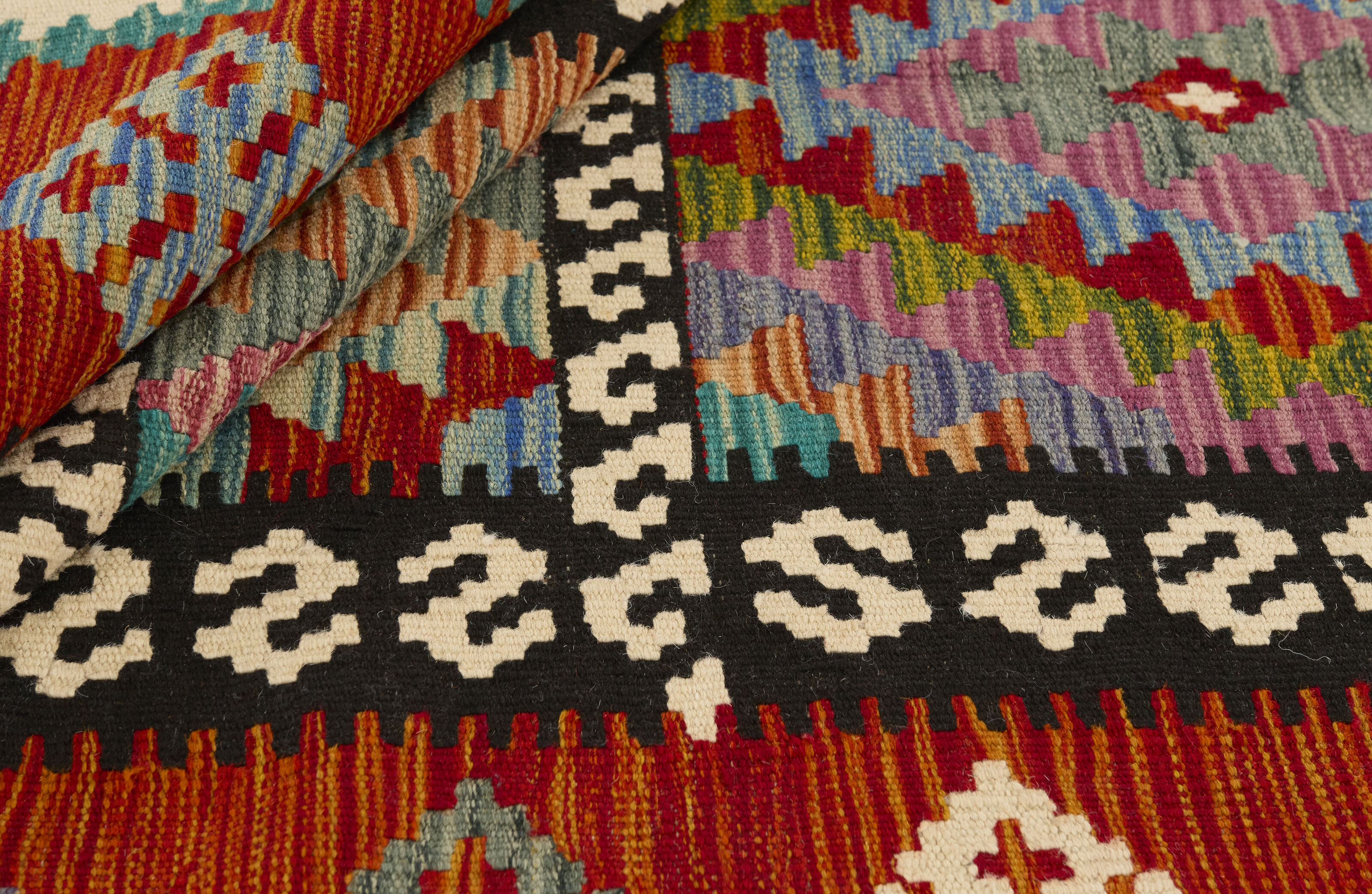 Afghan KelimItem no.: 1519013 Size: 125 cm x 193 cmAfghan Kelim rugs are hand woven by Turkmens in northern Afghanistan. Kelim is the name of a common Persian weave, but also of the technology used in the production. Kelims are primarily produced by nomads and are pile-less rugs, which are also used for bags, as wall decoration, or as curtains for tents. A natural colour scale with geometrical symbols and octagons is used.