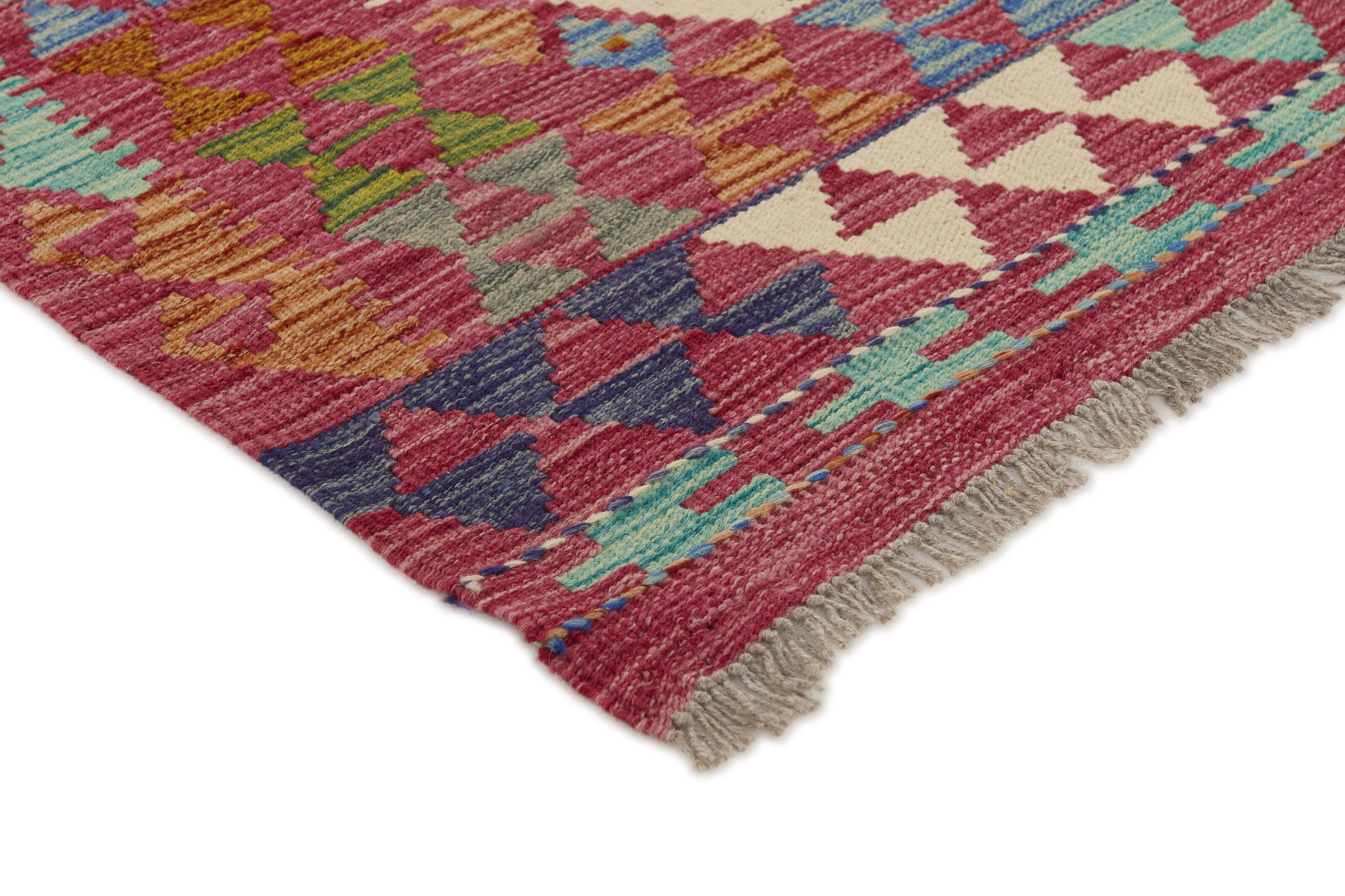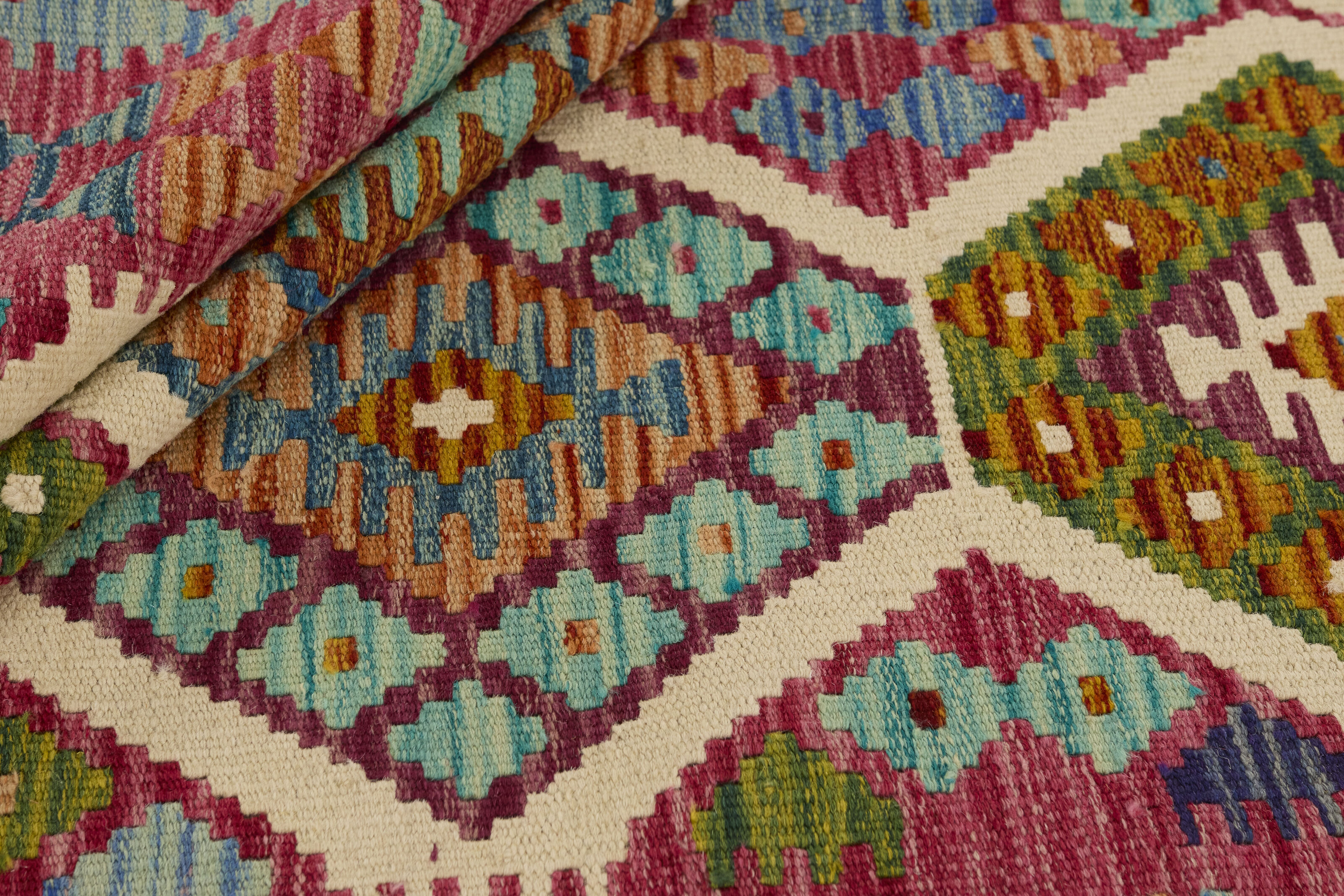 Afghan KelimItem no.: 1519016 Size: 125 cm x 190 cmAfghan Kelim rugs are hand woven by Turkmens in northern Afghanistan. Kelim is the name of a common Persian weave, but also of the technology used in the production. Kelims are primarily produced by nomads and are pile-less rugs, which are also used for bags, as wall decoration, or as curtains for tents. A natural colour scale with geometrical symbols and octagons is used.