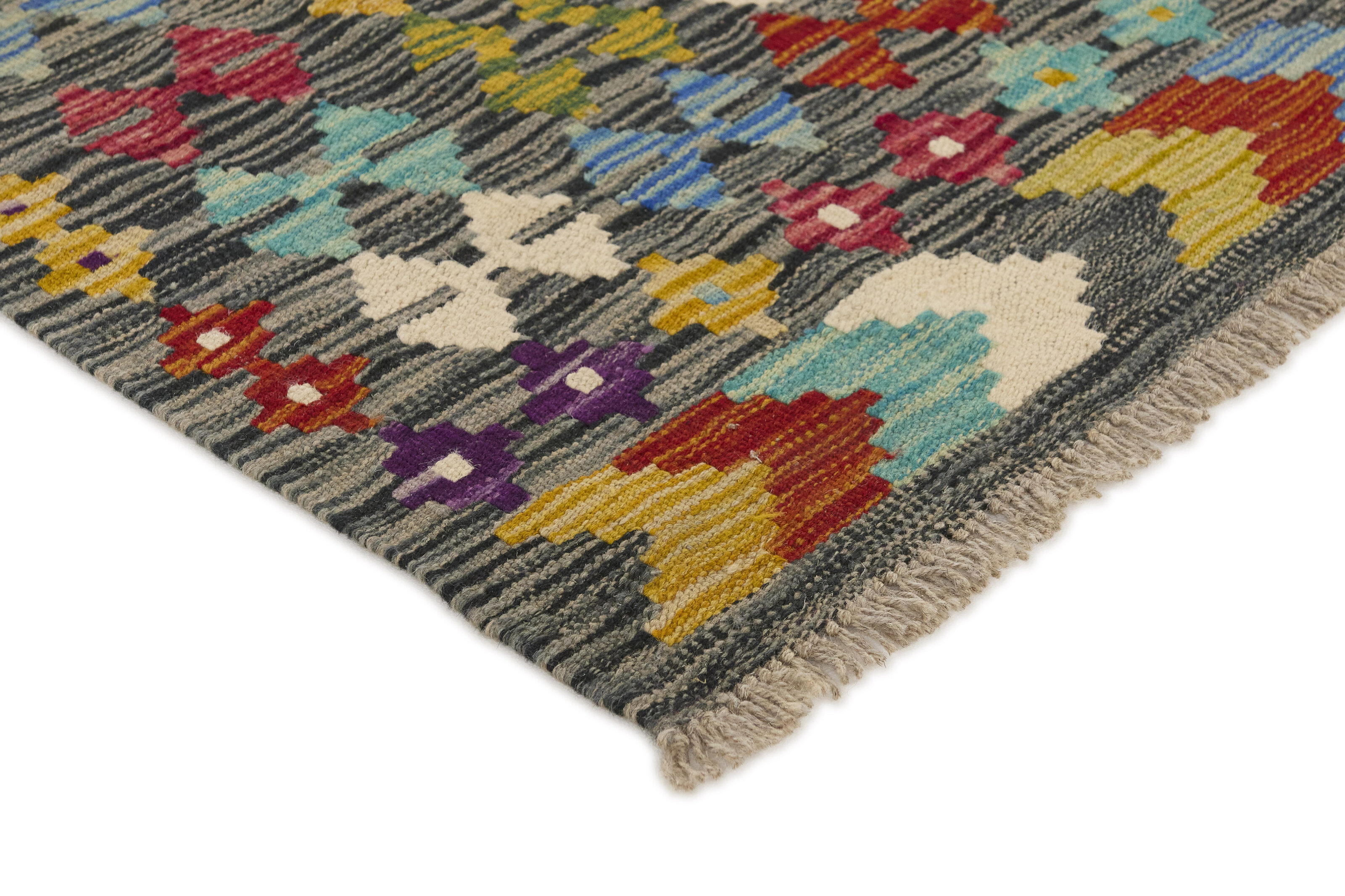 Afghan KelimItem no.: 1519032 Size: 128 cm x 184 cmAfghan Kelim rugs are hand woven by Turkmens in northern Afghanistan. Kelim is the name of a common Persian weave, but also of the technology used in the production. Kelims are primarily produced by nomads and are pile-less rugs, which are also used for bags, as wall decoration, or as curtains for tents. A natural colour scale with geometrical symbols and octagons is used.
