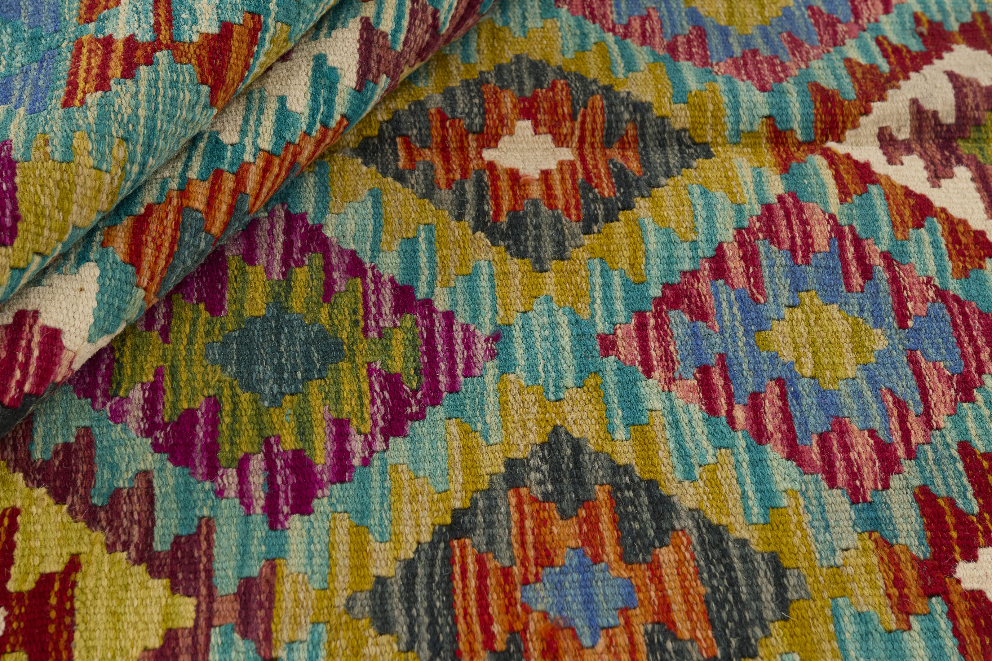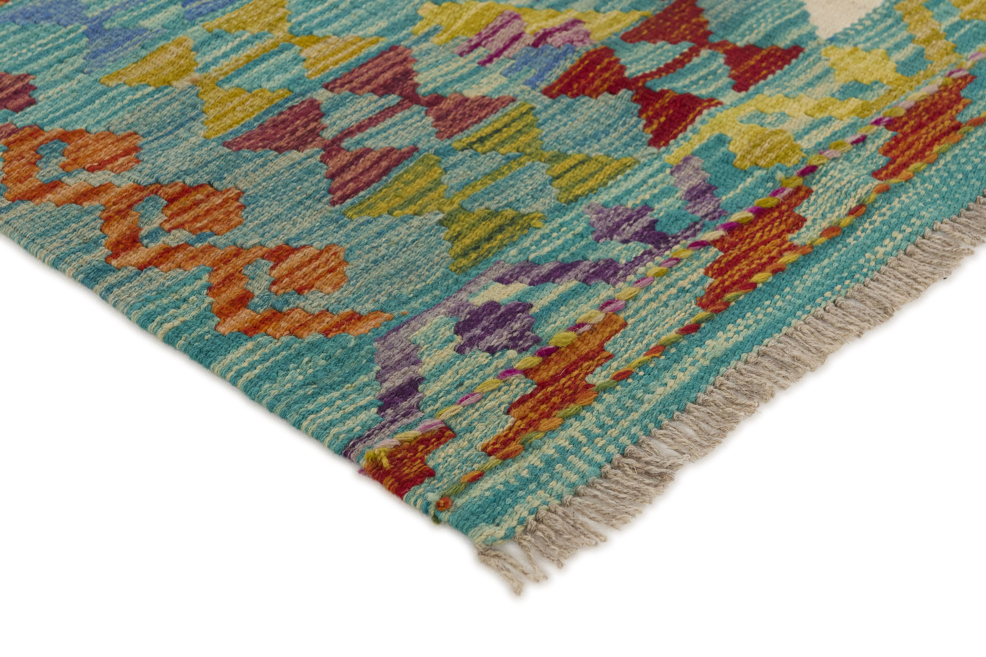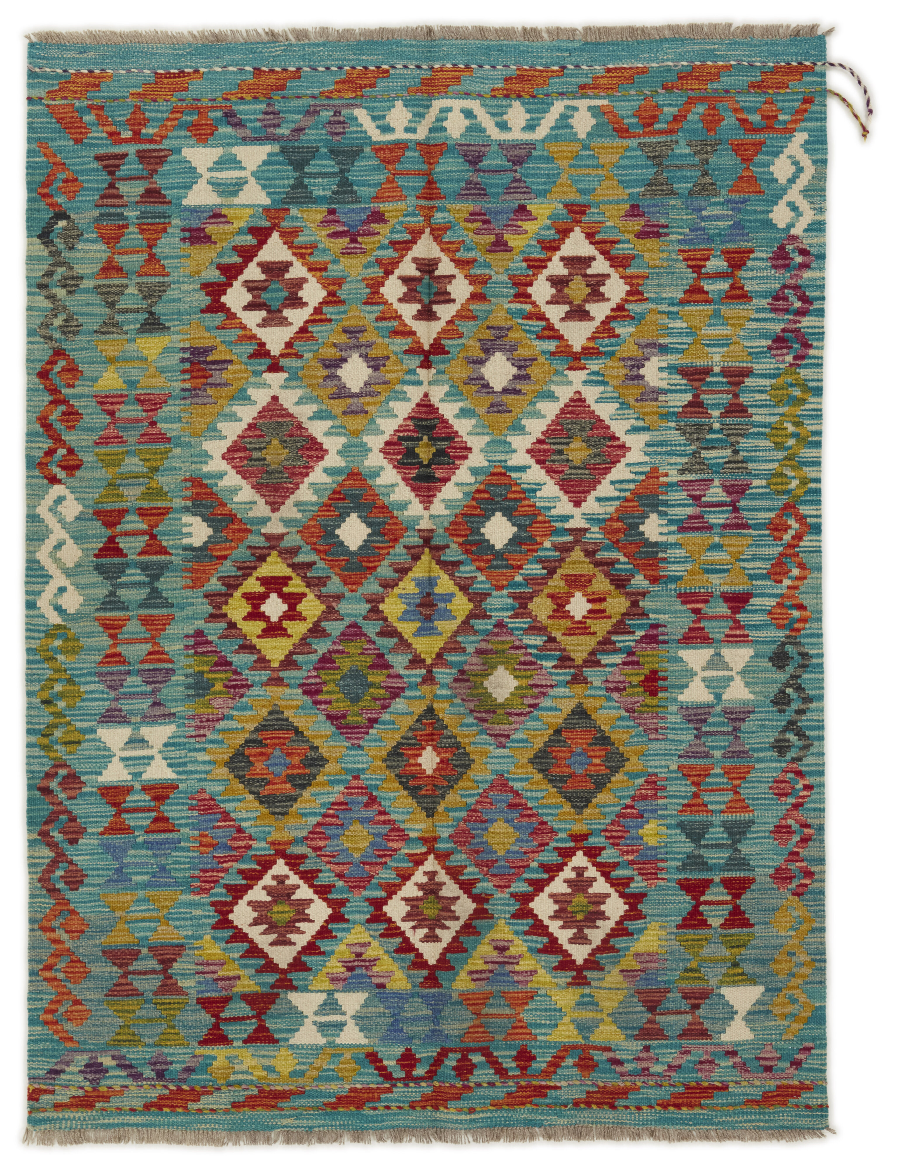 Afghan KelimItem no.: 1519033 Size: 129 cm x 173 cmAfghan Kelim rugs are hand woven by Turkmens in northern Afghanistan. Kelim is the name of a common Persian weave, but also of the technology used in the production. Kelims are primarily produced by nomads and are pile-less rugs, which are also used for bags, as wall decoration, or as curtains for tents. A natural colour scale with geometrical symbols and octagons is used.