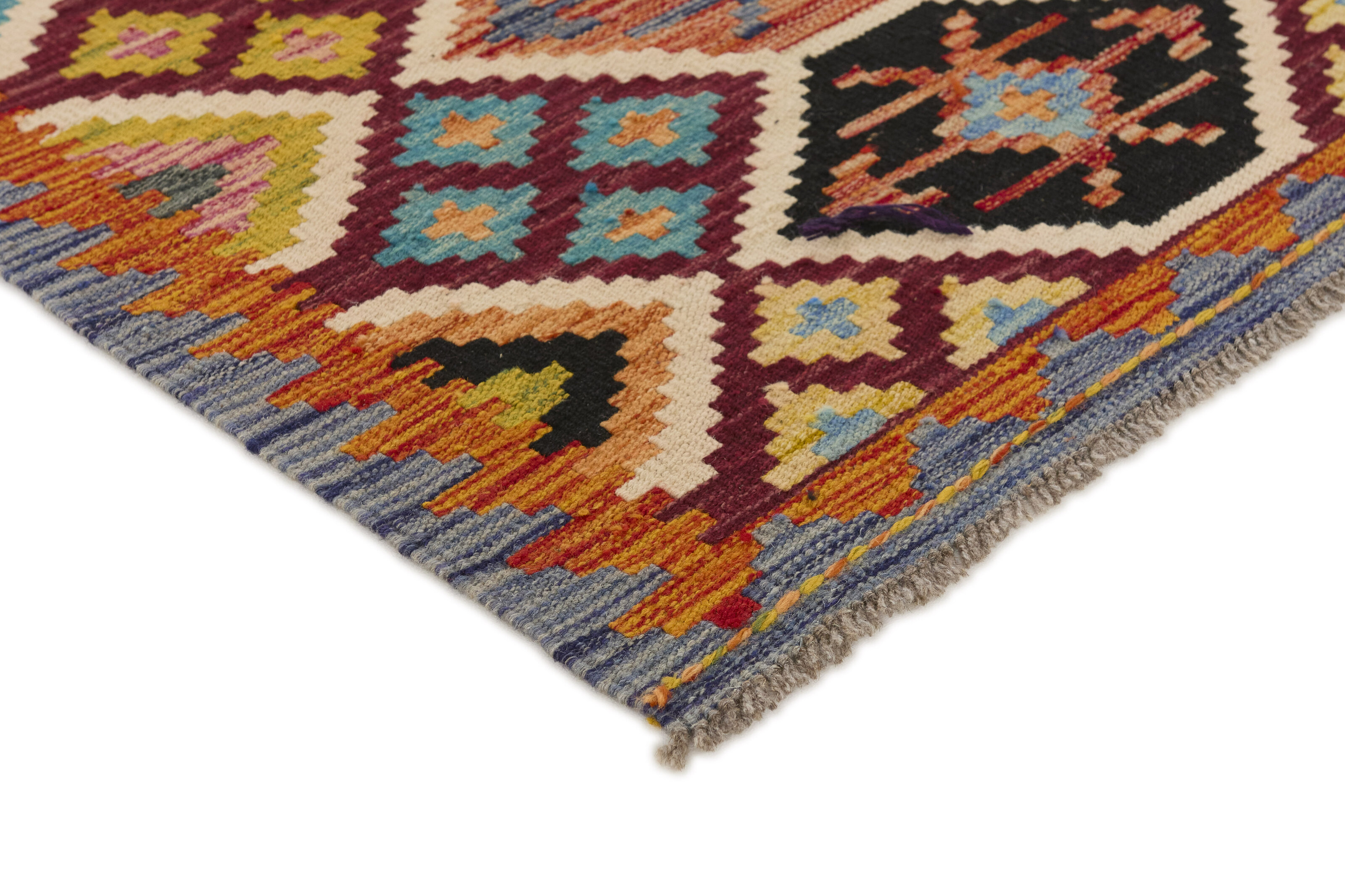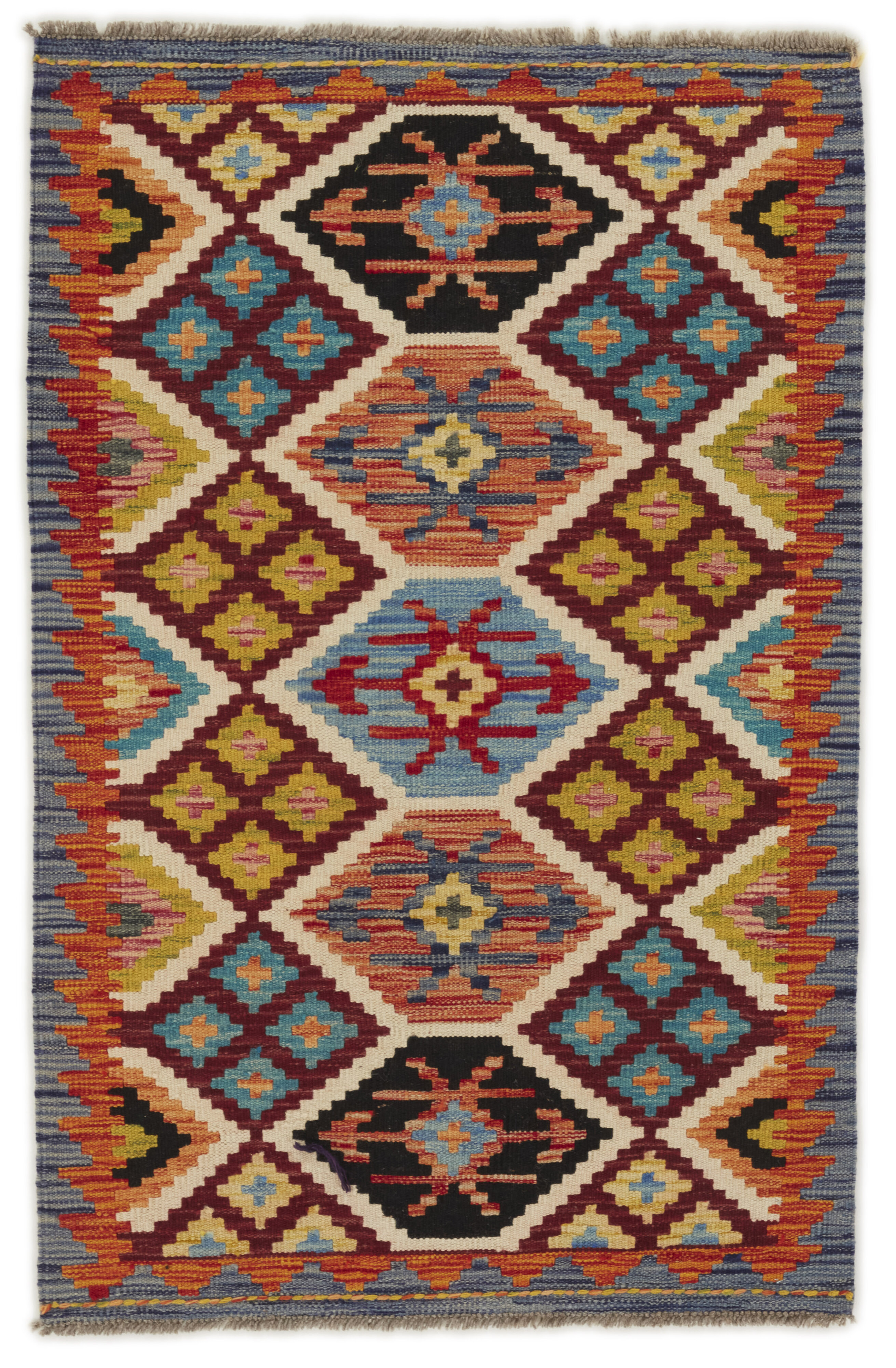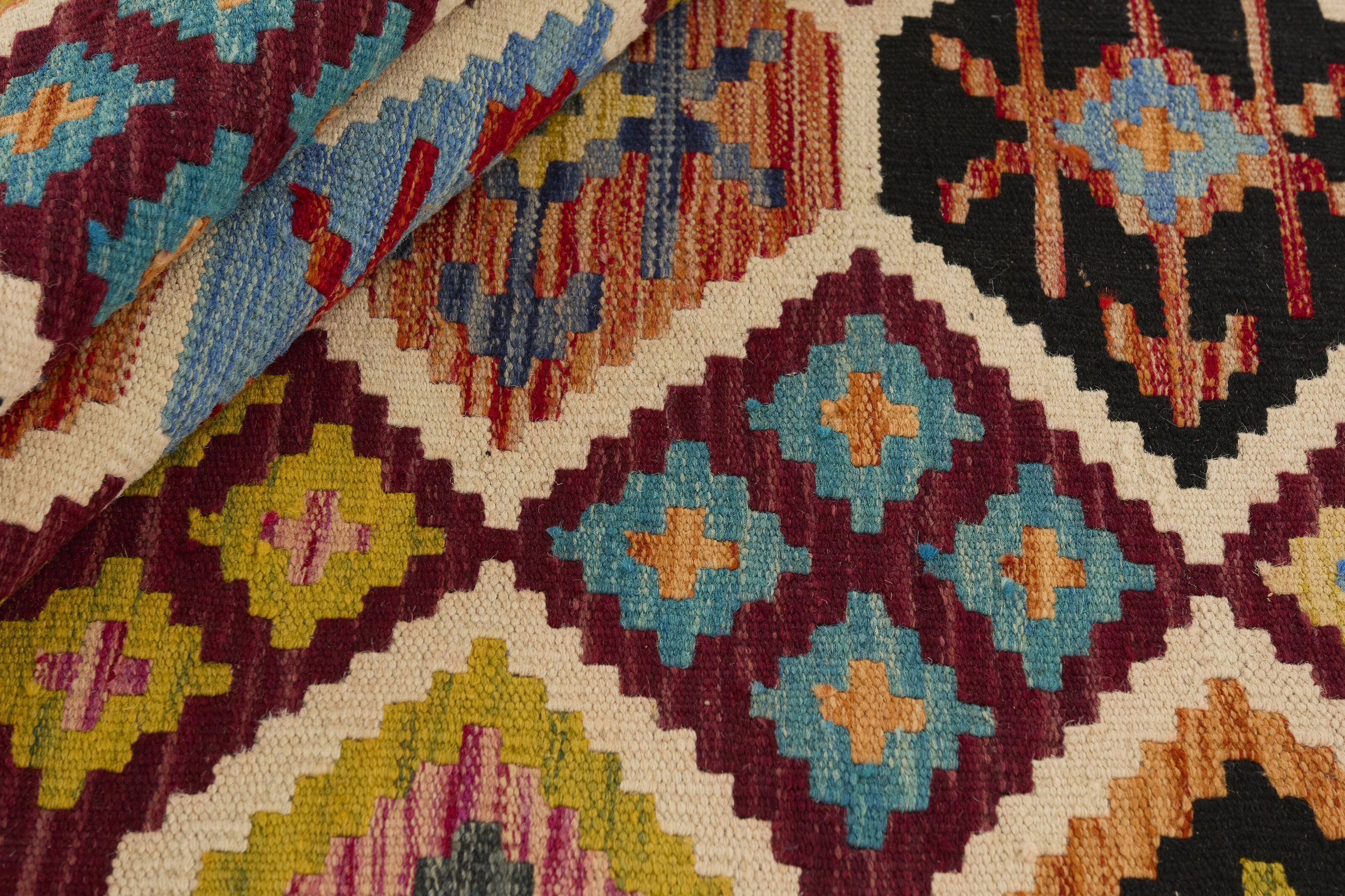 Afghan KelimItem no.: 1520067 Size: 81 cm x 126 cmAfghan Kelim rugs are hand woven by Turkmens in northern Afghanistan. Kelim is the name of a common Persian weave, but also of the technology used in the production. Kelims are primarily produced by nomads and are pile-less rugs, which are also used for bags, as wall decoration, or as curtains for tents. A natural colour scale with geometrical symbols and octagons is used.