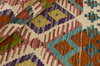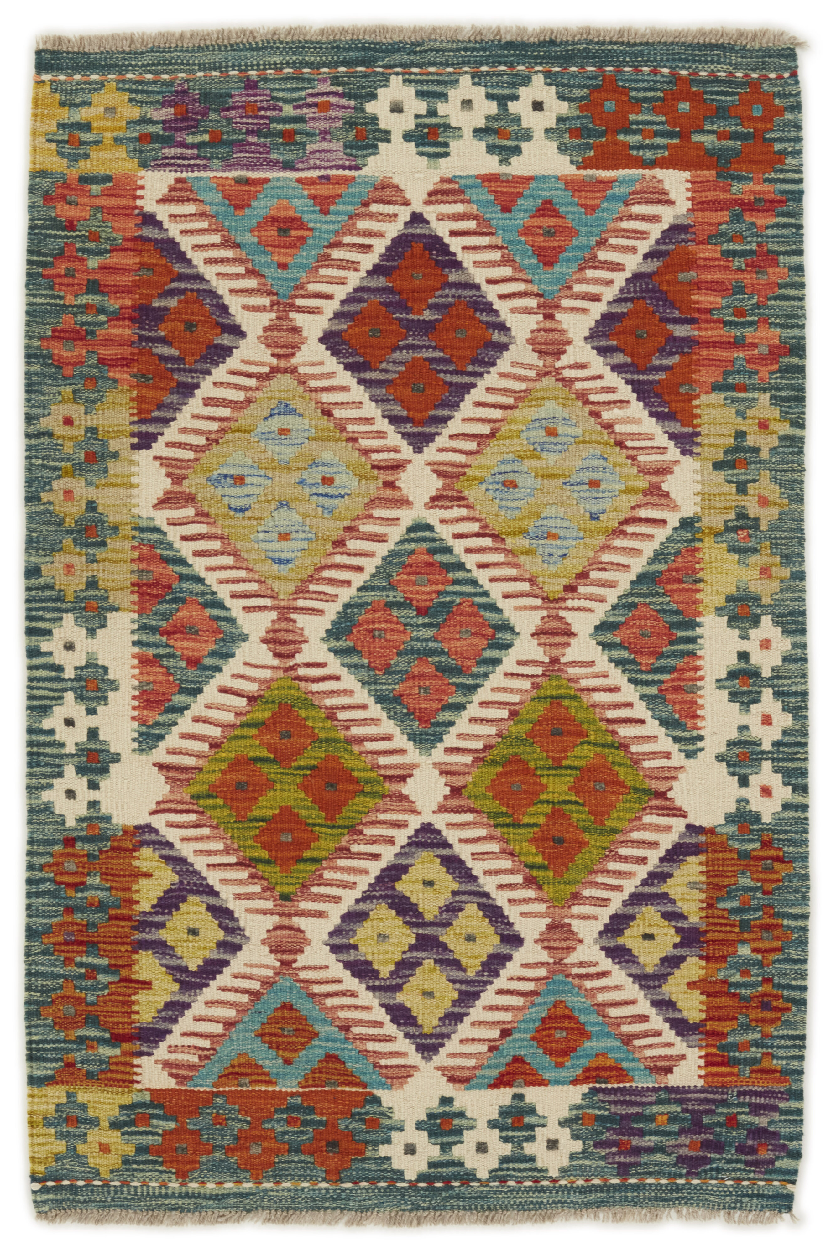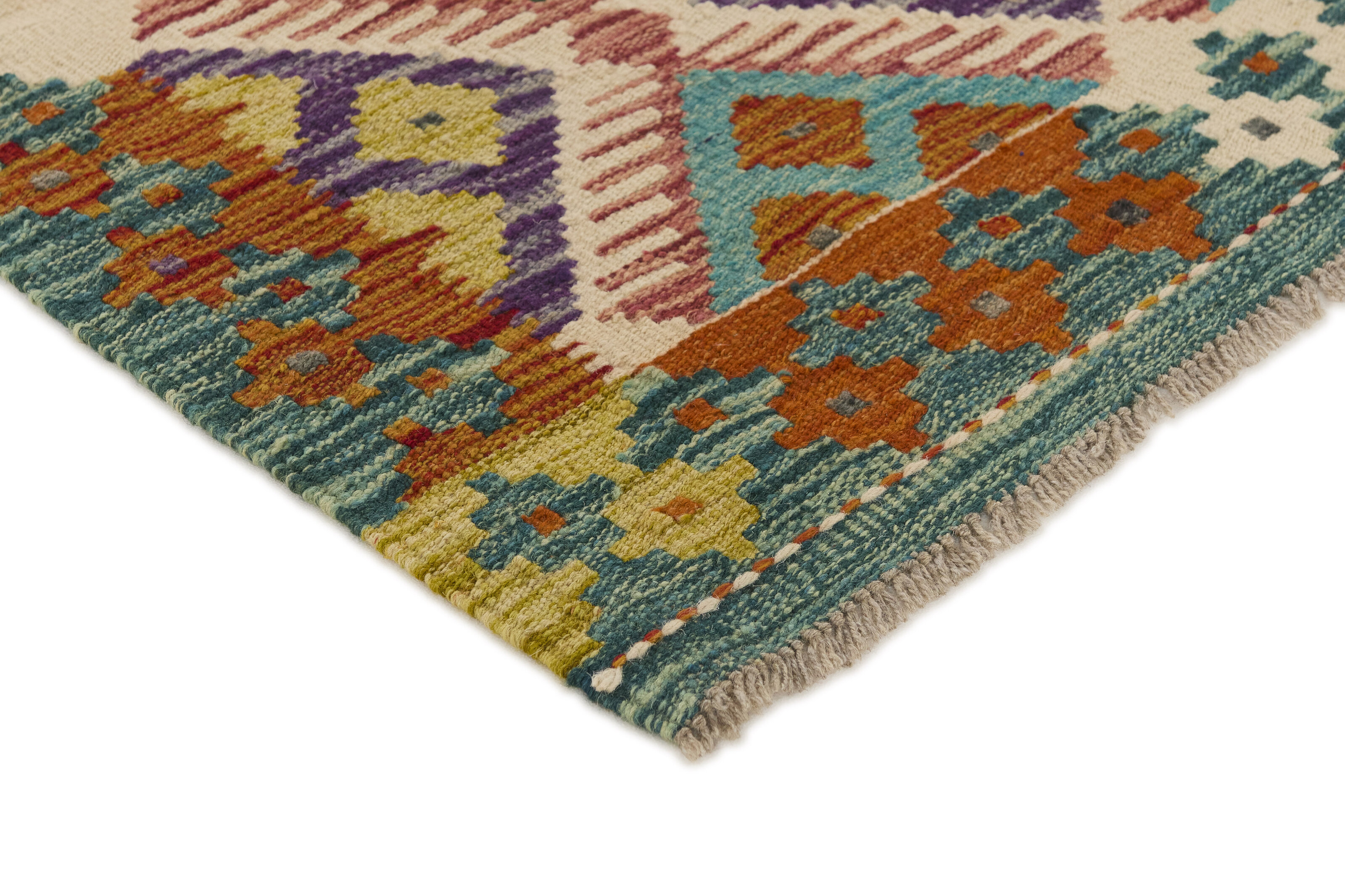 Afghan KelimItem no.: 1520068 Size: 83 cm x 125 cmAfghan Kelim rugs are hand woven by Turkmens in northern Afghanistan. Kelim is the name of a common Persian weave, but also of the technology used in the production. Kelims are primarily produced by nomads and are pile-less rugs, which are also used for bags, as wall decoration, or as curtains for tents. A natural colour scale with geometrical symbols and octagons is used.