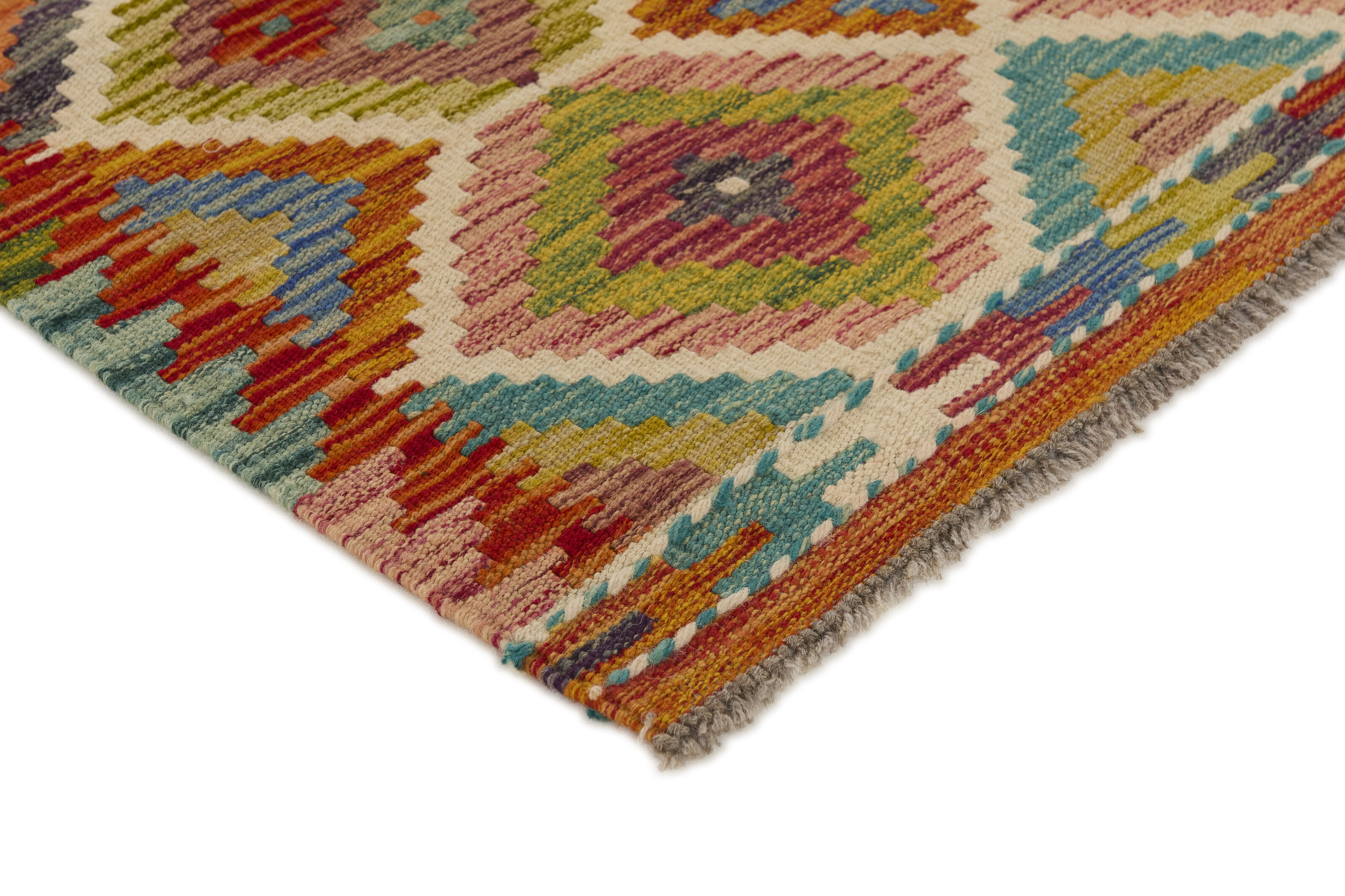 Afghan KelimItem no.: 1520073 Size: 82 cm x 122 cmAfghan Kelim rugs are hand woven by Turkmens in northern Afghanistan. Kelim is the name of a common Persian weave, but also of the technology used in the production. Kelims are primarily produced by nomads and are pile-less rugs, which are also used for bags, as wall decoration, or as curtains for tents. A natural colour scale with geometrical symbols and octagons is used.