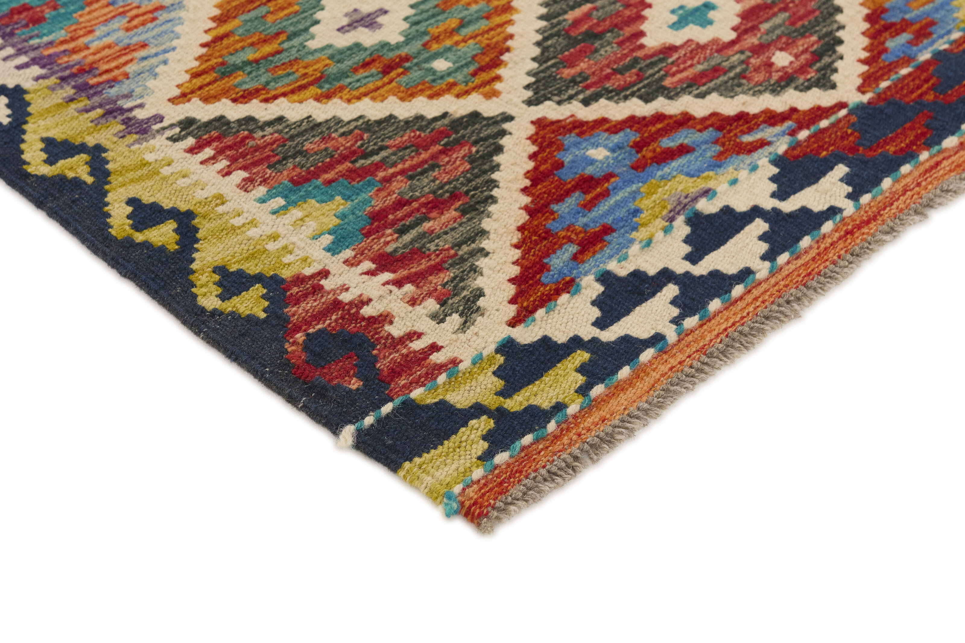 Afghan KelimItem no.: 1520074 Size: 84 cm x 125 cmAfghan Kelim rugs are hand woven by Turkmens in northern Afghanistan. Kelim is the name of a common Persian weave, but also of the technology used in the production. Kelims are primarily produced by nomads and are pile-less rugs, which are also used for bags, as wall decoration, or as curtains for tents. A natural colour scale with geometrical symbols and octagons is used.
