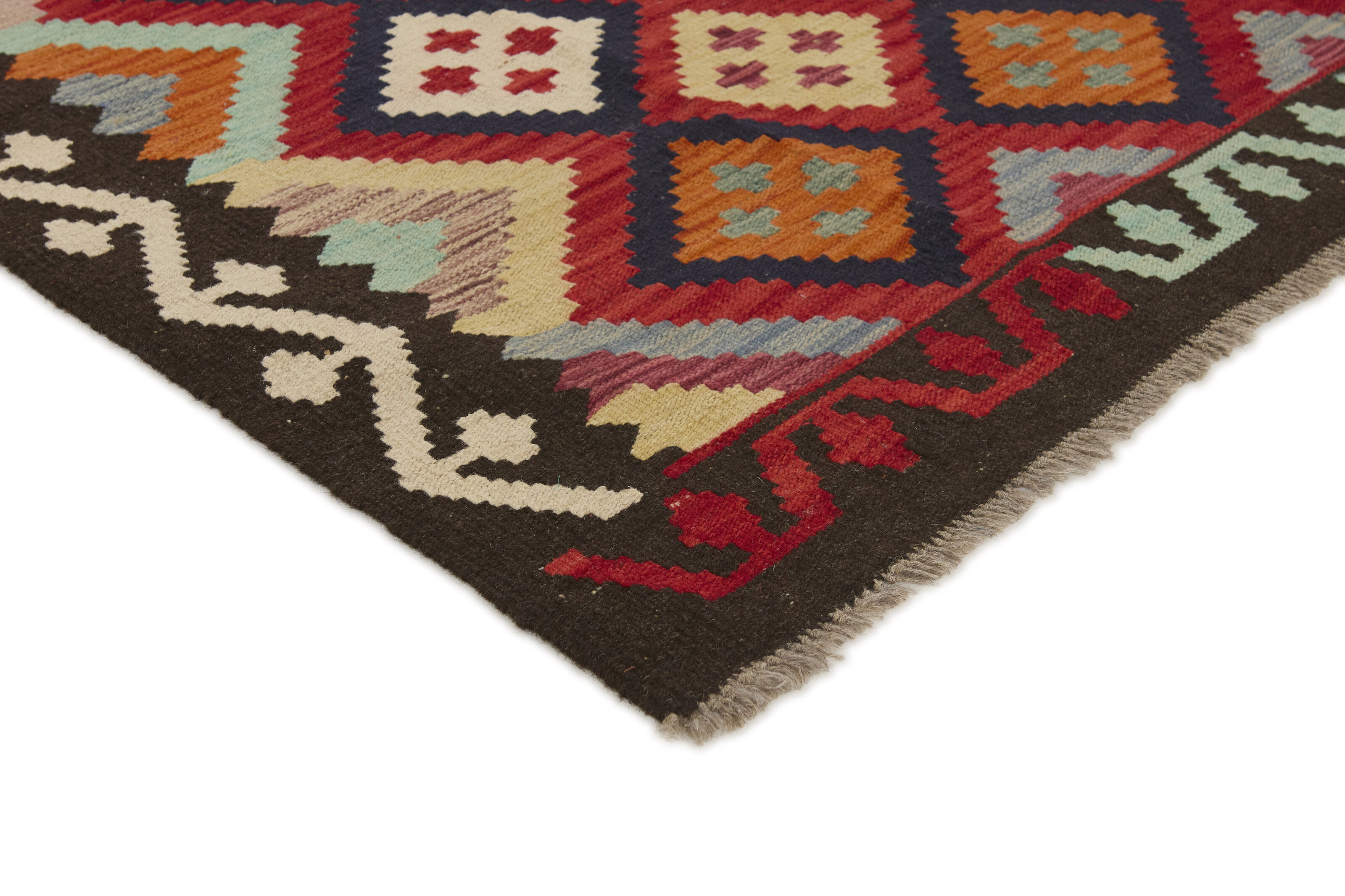 Afghan KelimItem no.: 1520246 Size: 179 cm x 249 cmAfghan Kelim rugs are hand woven by Turkmens in northern Afghanistan. Kelim is the name of a common Persian weave, but also of the technology used in the production. Kelims are primarily produced by nomads and are pile-less rugs, which are also used for bags, as wall decoration, or as curtains for tents. A natural colour scale with geometrical symbols and octagons is used.