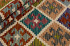 Afghan KelimItem no.: 1520343 Size: 162 cm x 198 cmAfghan Kelim rugs are hand woven by Turkmens in northern Afghanistan. Kelim is the name of a common Persian weave, but also of the technology used in the production. Kelims are primarily produced by nomads and are pile-less rugs, which are also used for bags, as wall decoration, or as curtains for tents. A natural colour scale with geometrical symbols and octagons is used.
