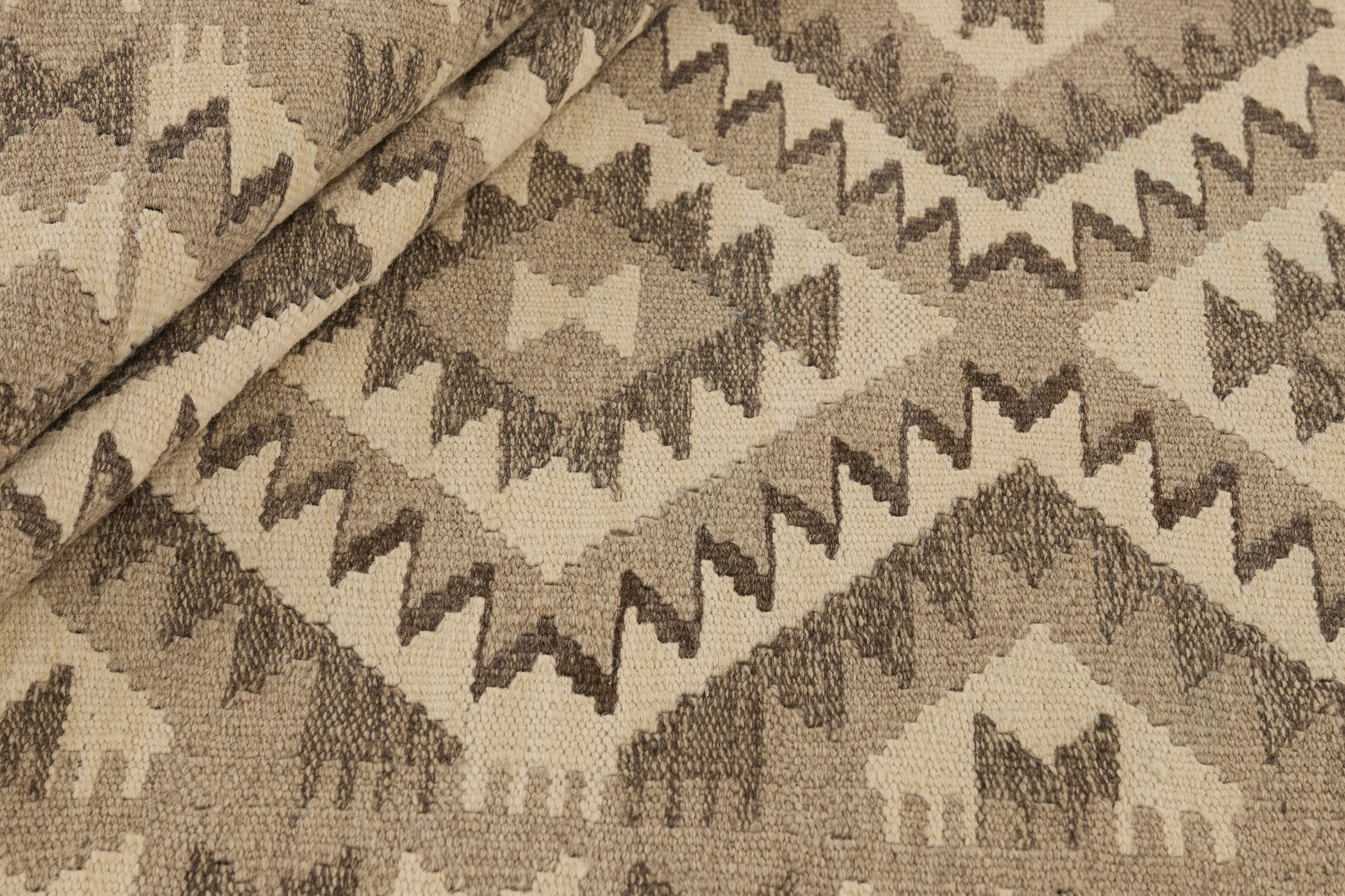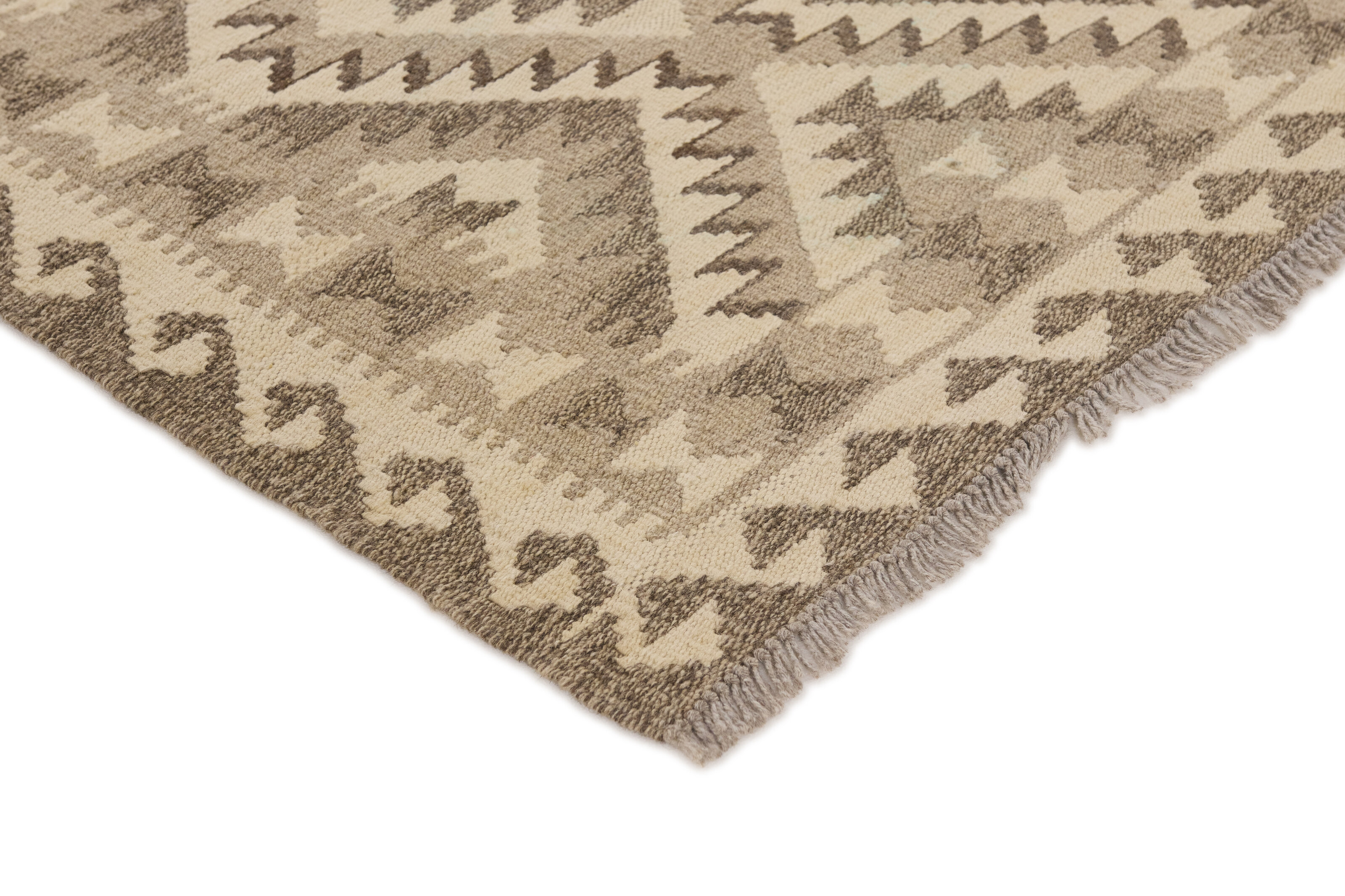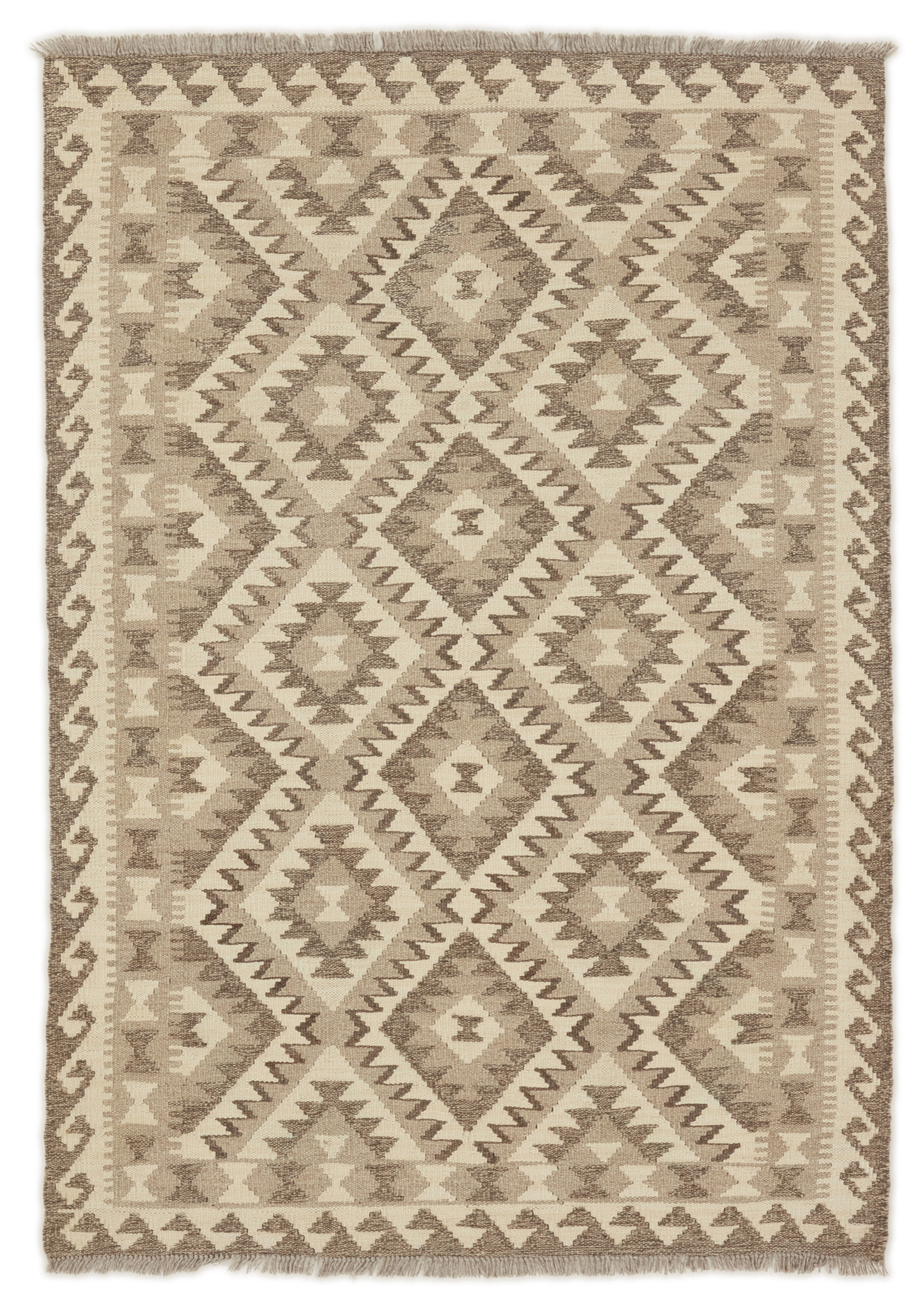 Afghan KelimItem no.: 1520375 Size: 108 cm x 153 cmAfghan Kelim rugs are hand woven by Turkmens in northern Afghanistan. Kelim is the name of a common Persian weave, but also of the technology used in the production. Kelims are primarily produced by nomads and are pile-less rugs, which are also used for bags, as wall decoration, or as curtains for tents. A natural colour scale with geometrical symbols and octagons is used.