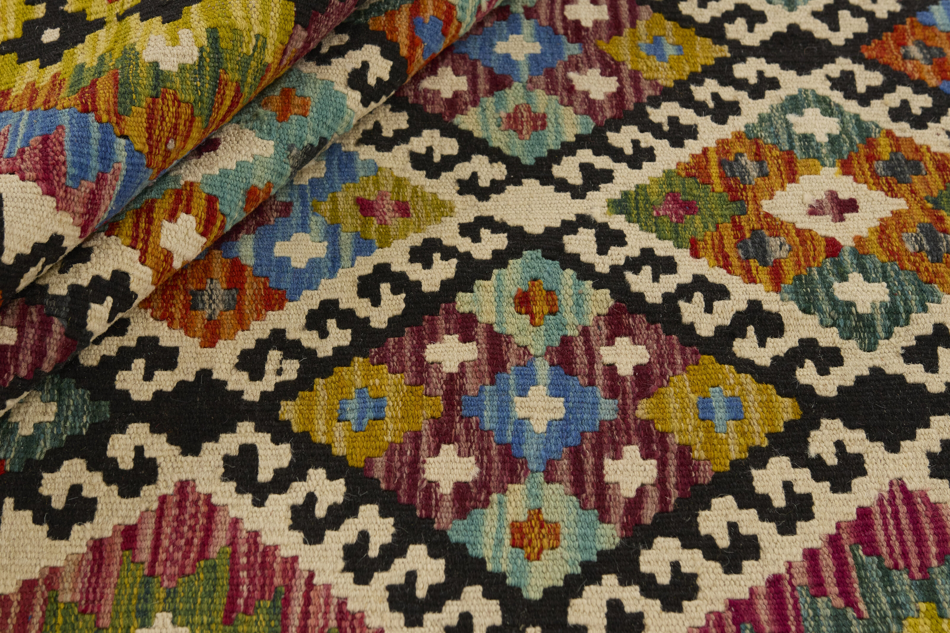 Afghan KelimItem no.: 1520493 Size: 128 cm x 200 cmAfghan Kelim rugs are hand woven by Turkmens in northern Afghanistan. Kelim is the name of a common Persian weave, but also of the technology used in the production. Kelims are primarily produced by nomads and are pile-less rugs, which are also used for bags, as wall decoration, or as curtains for tents. A natural colour scale with geometrical symbols and octagons is used.