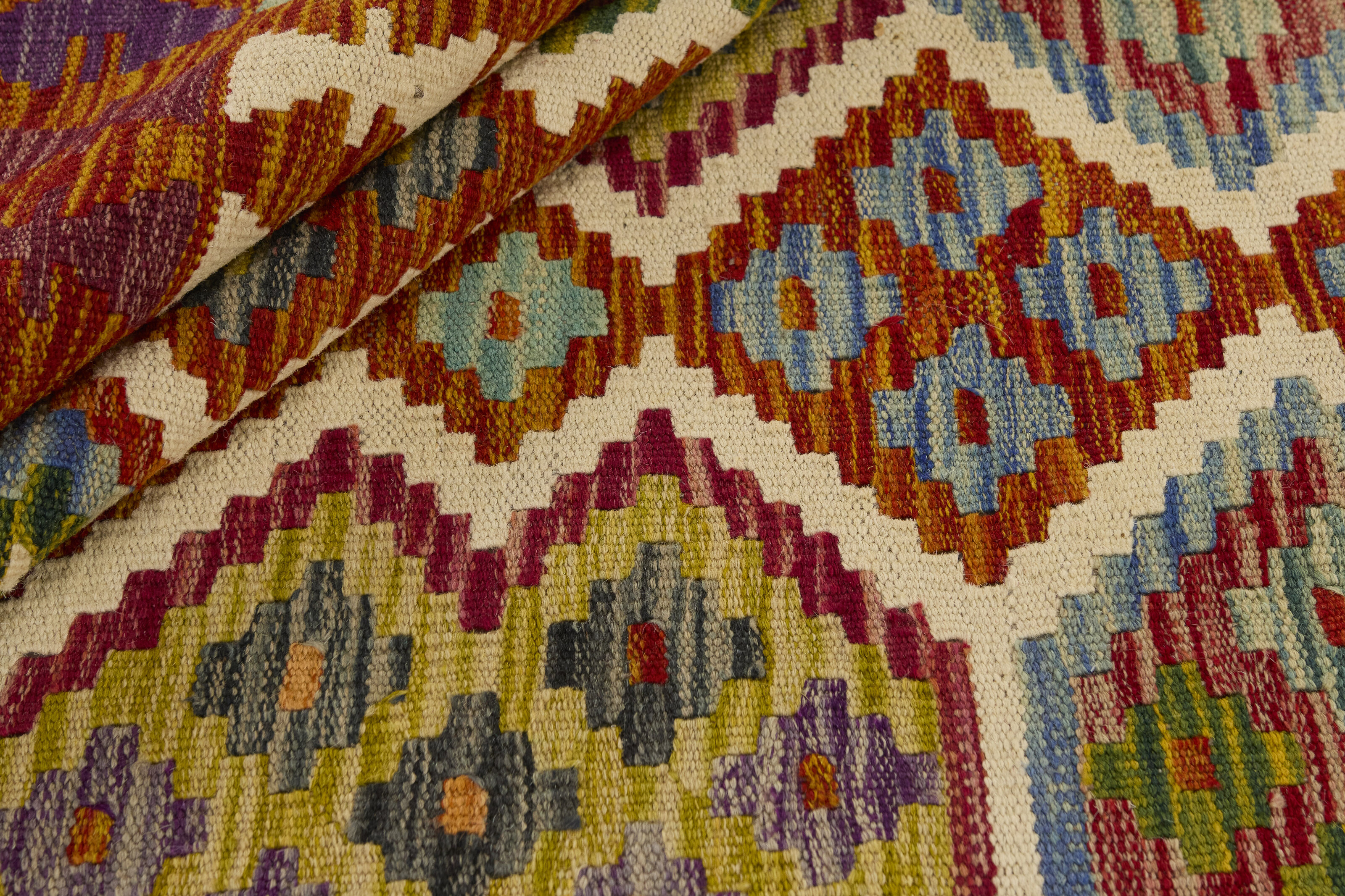 Afghan KelimItem no.: 1520553 Size: 206 cm x 309 cmAfghan Kelim rugs are hand woven by Turkmens in northern Afghanistan. Kelim is the name of a common Persian weave, but also of the technology used in the production. Kelims are primarily produced by nomads and are pile-less rugs, which are also used for bags, as wall decoration, or as curtains for tents. A natural colour scale with geometrical symbols and octagons is used.