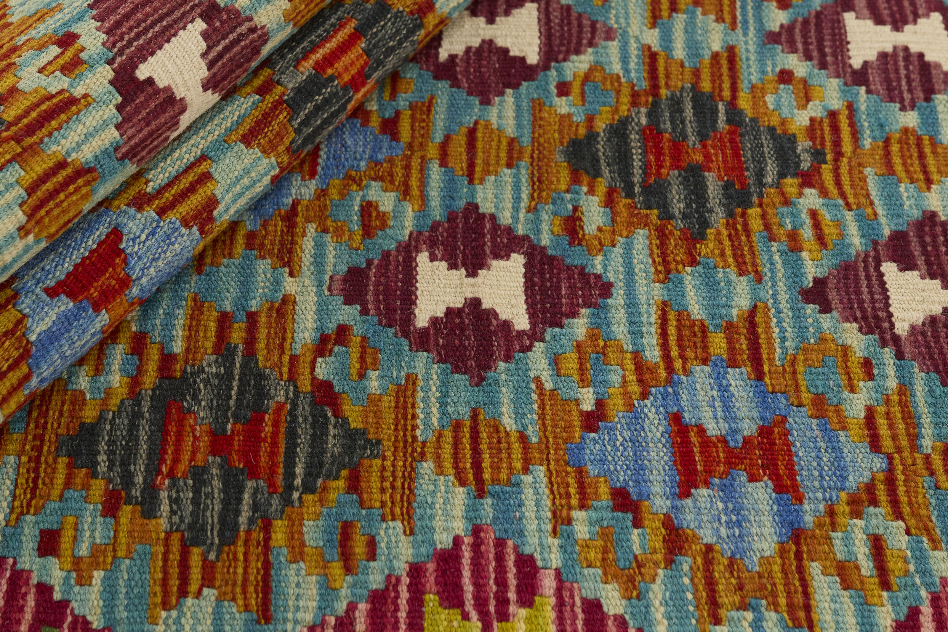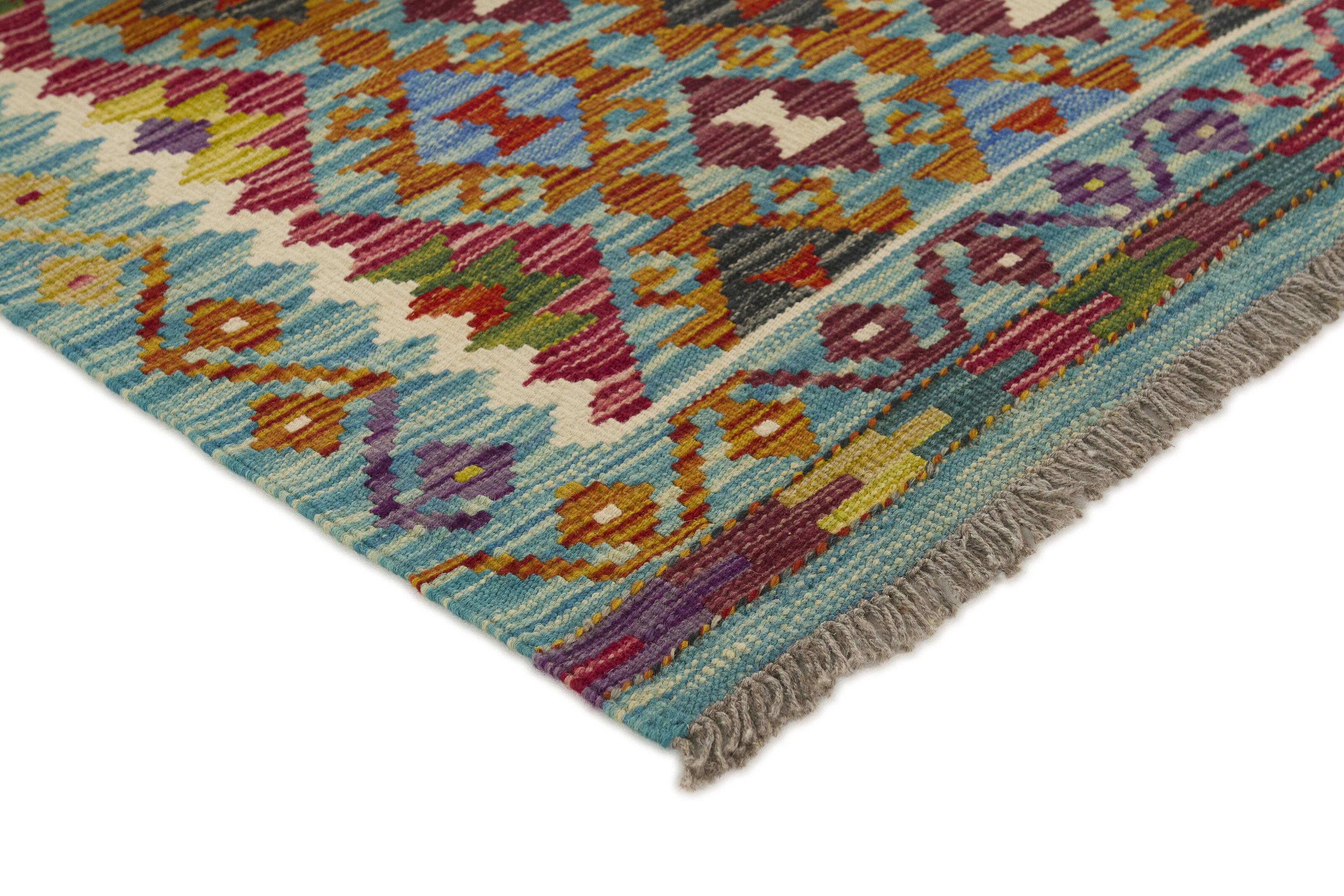 Afghan KelimItem no.: 1520578 Size: 85 cm x 192 cmAfghan Kelim rugs are hand woven by Turkmens in northern Afghanistan. Kelim is the name of a common Persian weave, but also of the technology used in the production. Kelims are primarily produced by nomads and are pile-less rugs, which are also used for bags, as wall decoration, or as curtains for tents. A natural colour scale with geometrical symbols and octagons is used.