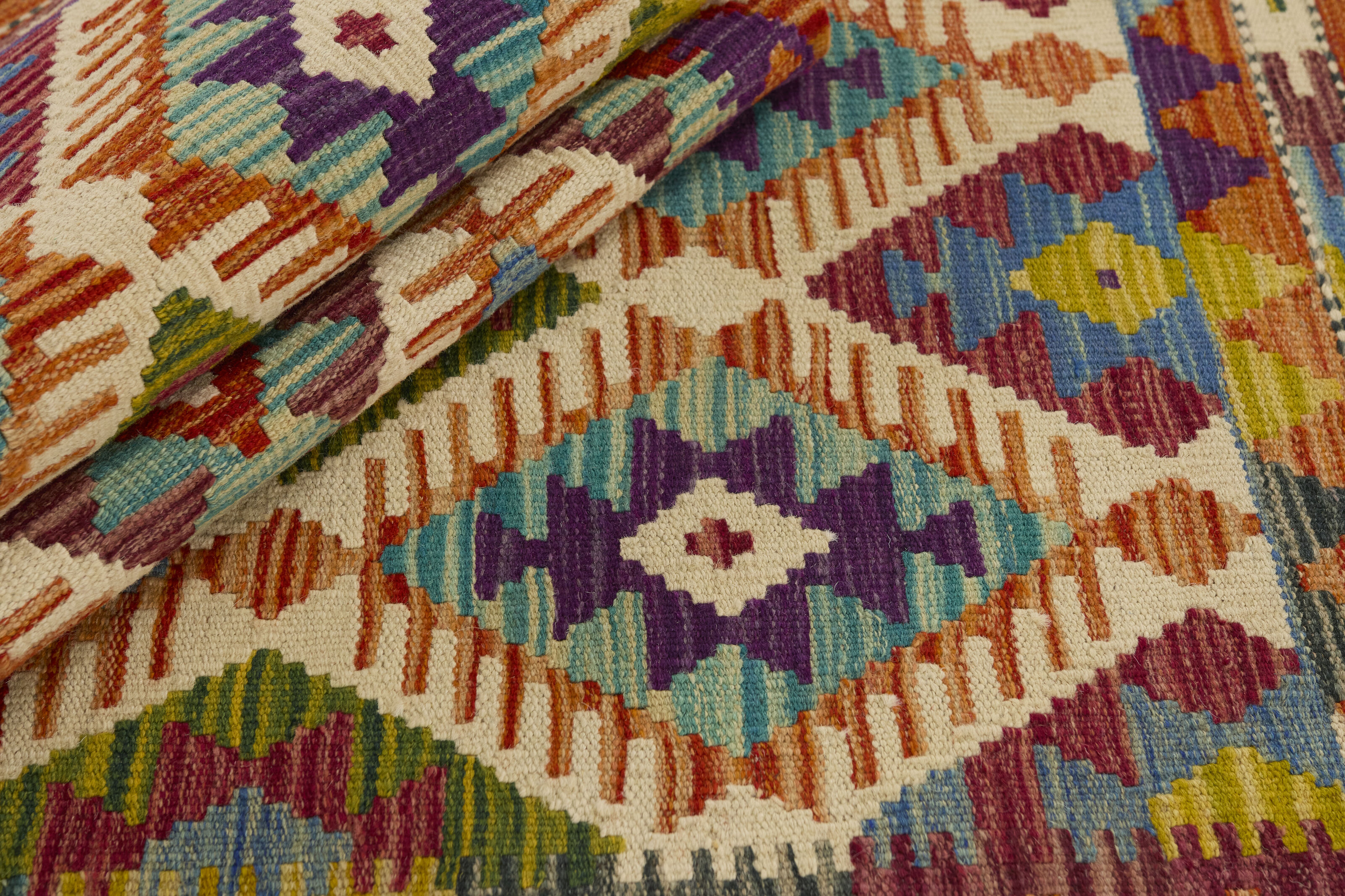 Afghan KelimItem no.: 1520636 Size: 65 cm x 153 cmAfghan Kelim rugs are hand woven by Turkmens in northern Afghanistan. Kelim is the name of a common Persian weave, but also of the technology used in the production. Kelims are primarily produced by nomads and are pile-less rugs, which are also used for bags, as wall decoration, or as curtains for tents. A natural colour scale with geometrical symbols and octagons is used.