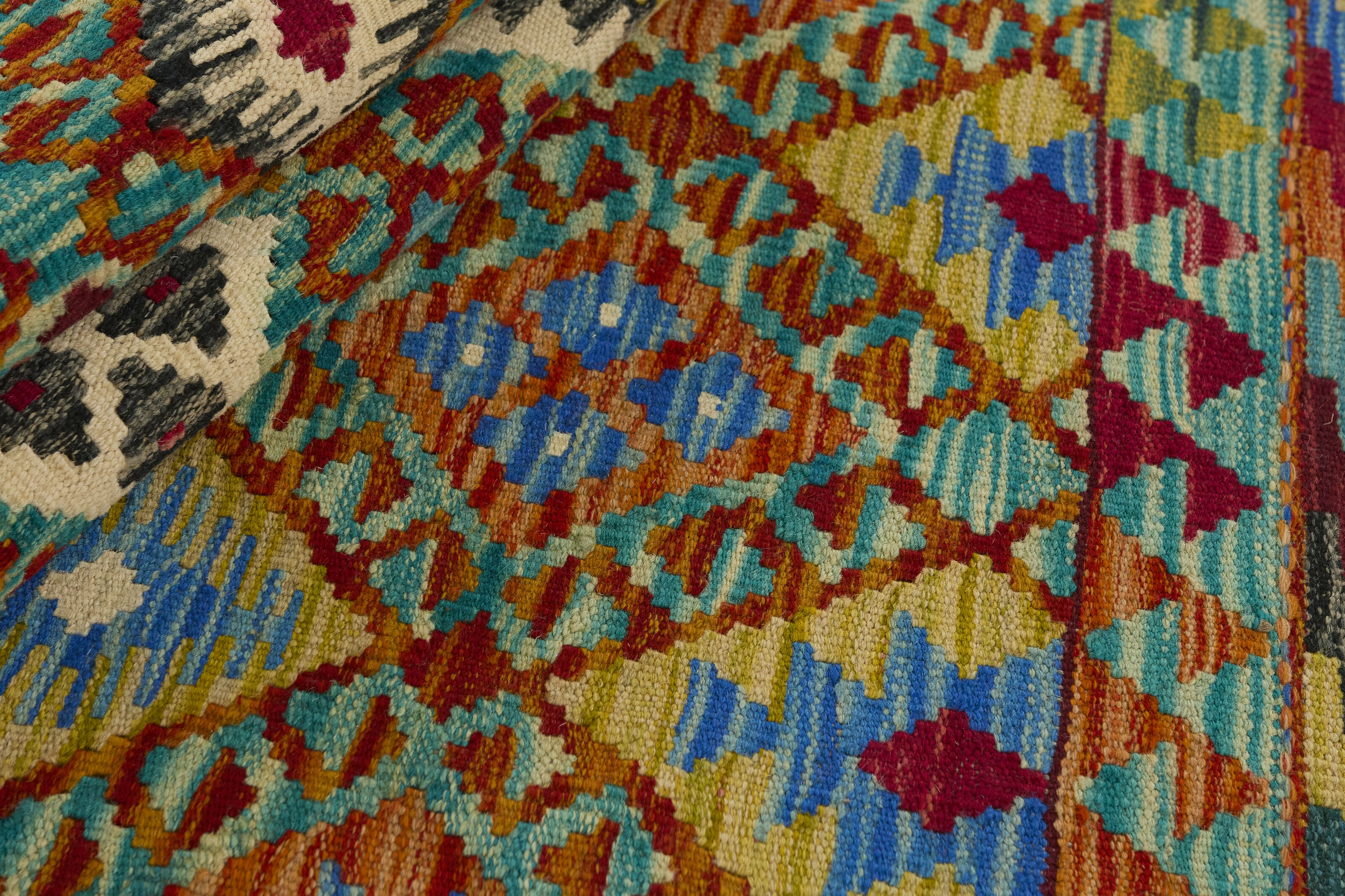 Afghan KelimItem no.: 1520639 Size: 66 cm x 149 cmAfghan Kelim rugs are hand woven by Turkmens in northern Afghanistan. Kelim is the name of a common Persian weave, but also of the technology used in the production. Kelims are primarily produced by nomads and are pile-less rugs, which are also used for bags, as wall decoration, or as curtains for tents. A natural colour scale with geometrical symbols and octagons is used.