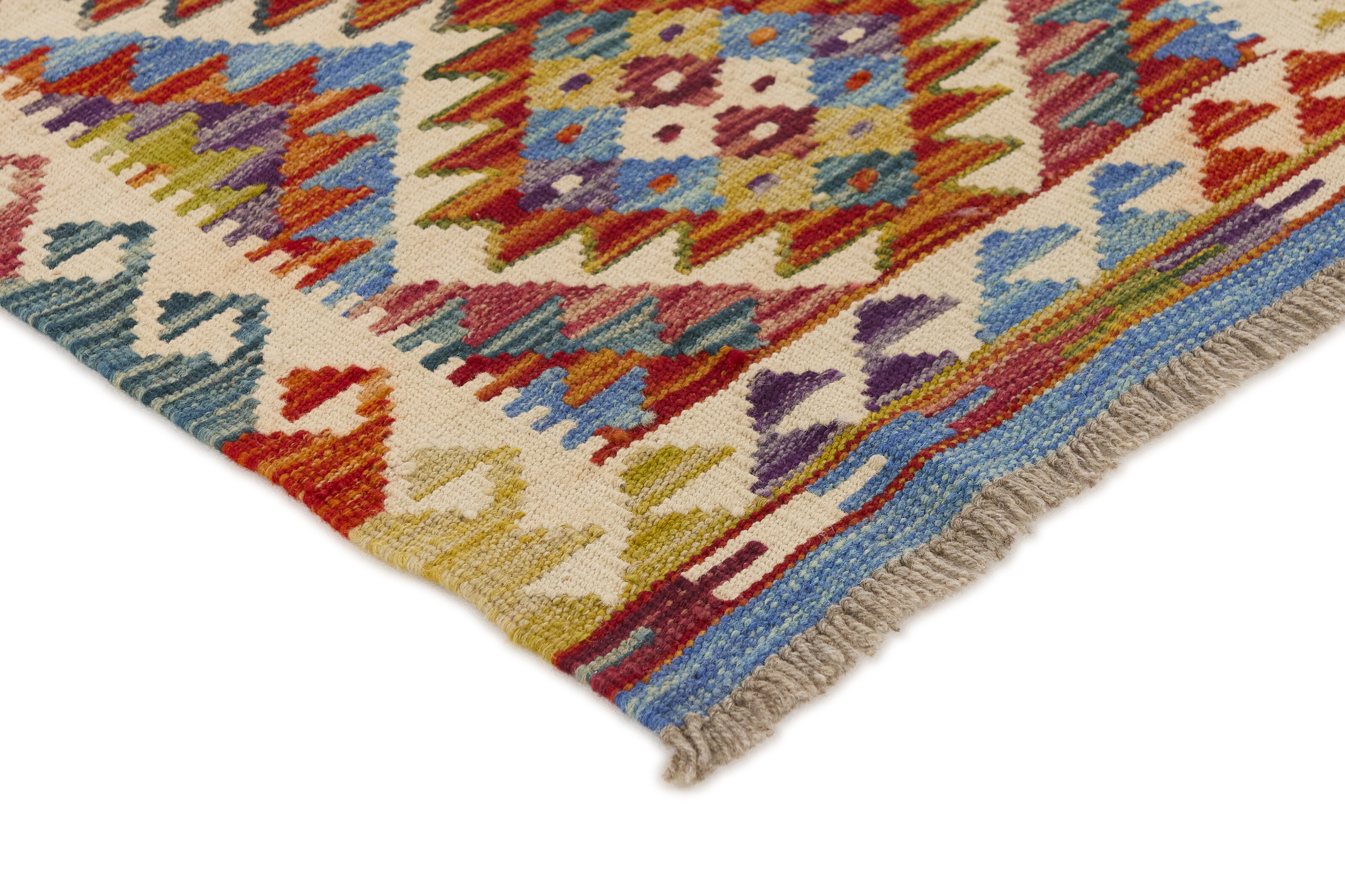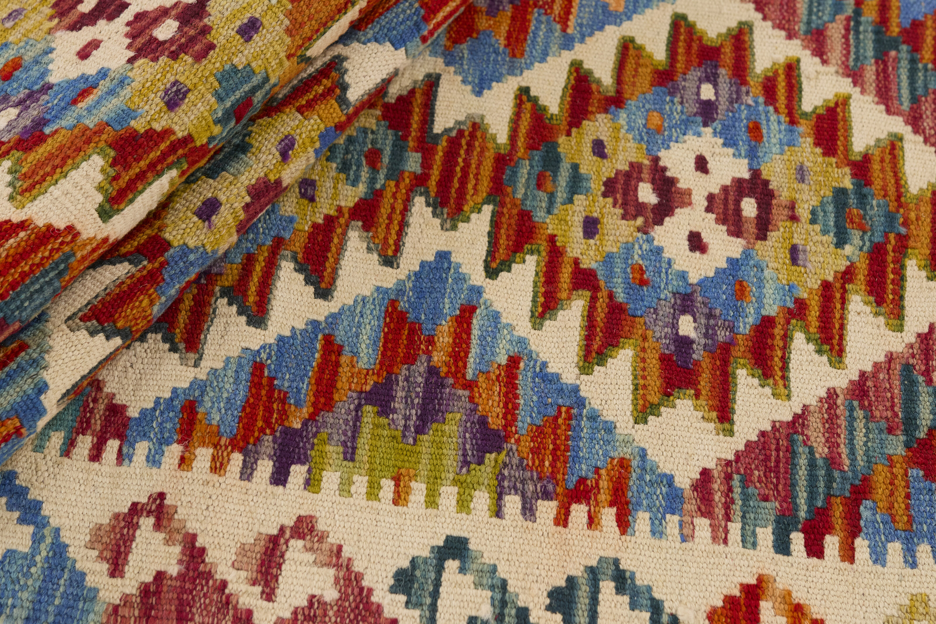 Afghan KelimItem no.: 1520853 Size: 50 cm x 138 cmAfghan Kelim rugs are hand woven by Turkmens in northern Afghanistan. Kelim is the name of a common Persian weave, but also of the technology used in the production. Kelims are primarily produced by nomads and are pile-less rugs, which are also used for bags, as wall decoration, or as curtains for tents. A natural colour scale with geometrical symbols and octagons is used.