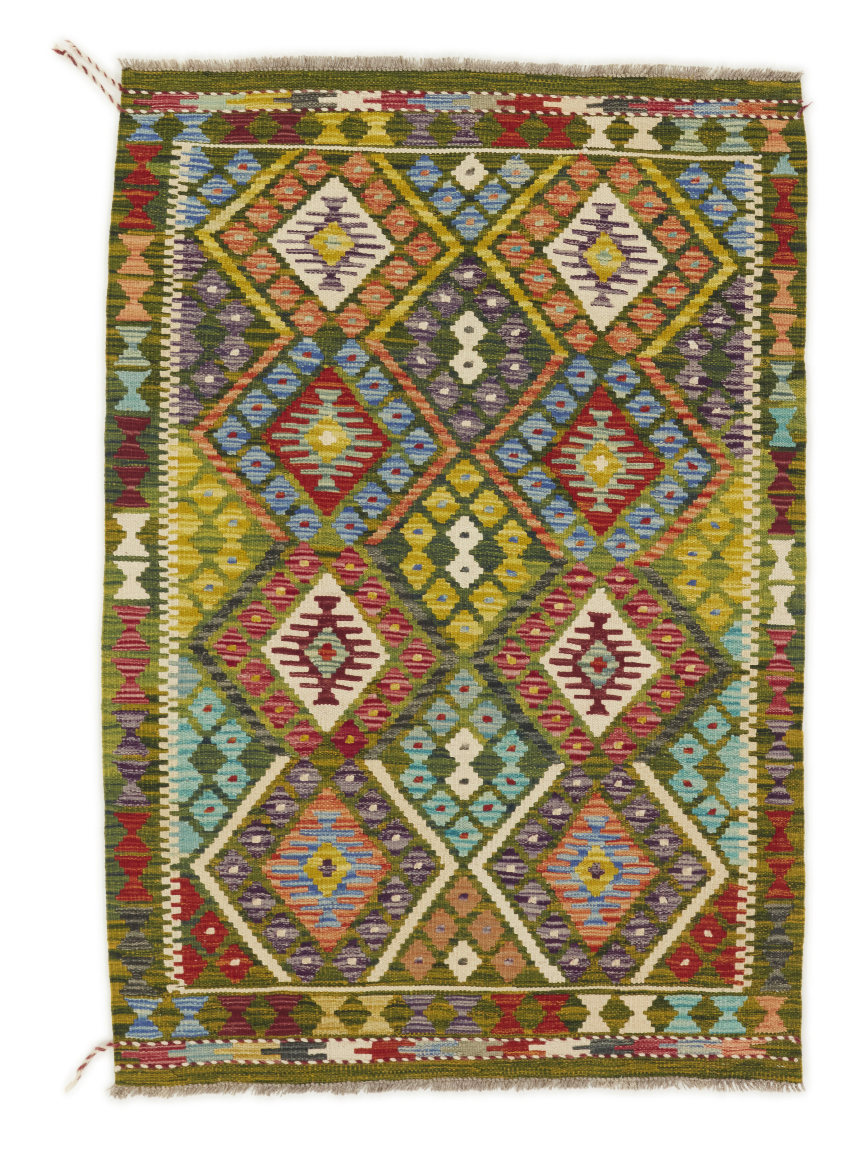 Afghan KelimItem no.: 1520878 Size: 106 cm x 150 cmAfghan Kelim rugs are hand woven by Turkmens in northern Afghanistan. Kelim is the name of a common Persian weave, but also of the technology used in the production. Kelims are primarily produced by nomads and are pile-less rugs, which are also used for bags, as wall decoration, or as curtains for tents. A natural colour scale with geometrical symbols and octagons is used.