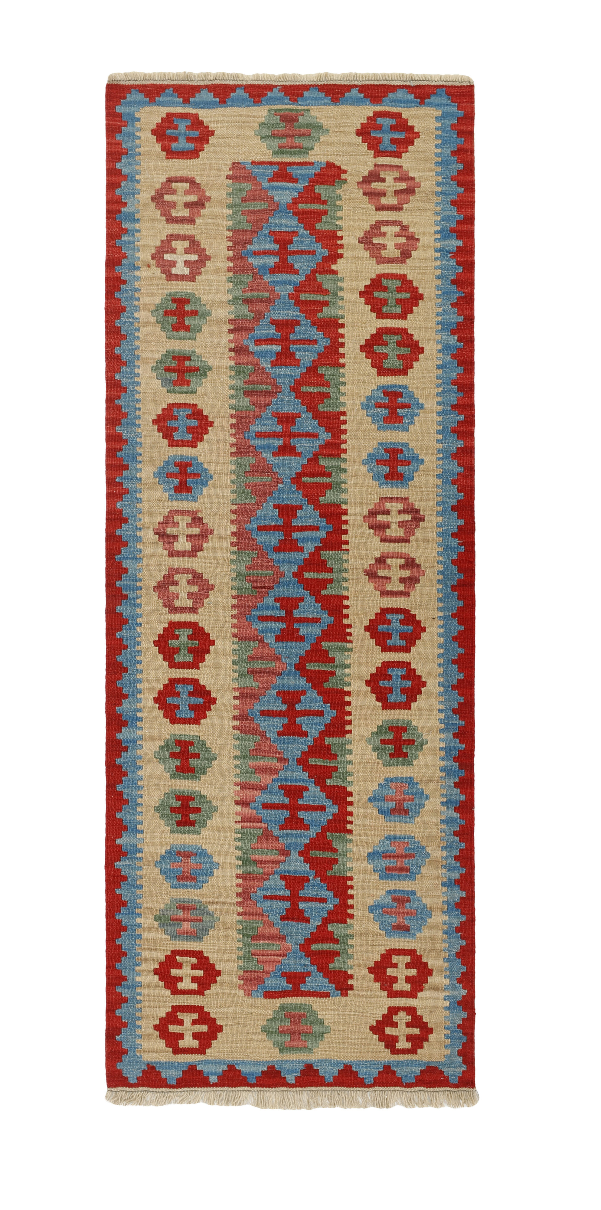 KelimItem no.: 1519219 Size: 85 cm x 251 cmThese Kelims are flat woven rugs, woven by nomads in western Persia. A special weaving technique is used, giving the rug a thinner, flatter surface, with no pile. Kelims are also quicker to produce, compared to common Oriental rugs. The colours are natural and no two rugs are alike. Kelims are produced in several regions and under many names, but the most well known Kelim types are Seneh, Sumak, Fars, and Kelim Gashghai.