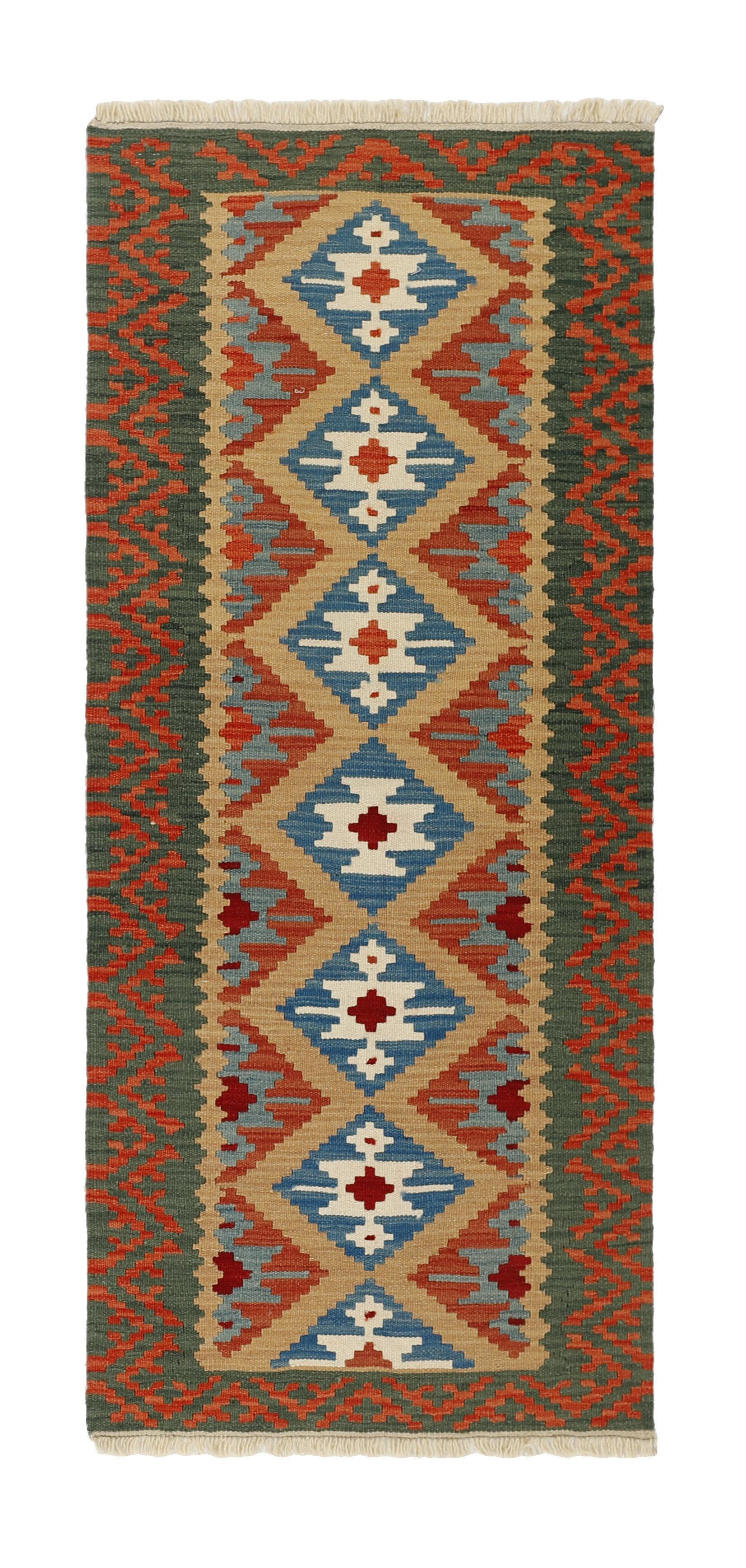 KelimItem no.: 1519223 Size: 82 cm x 199 cmThese Kelims are flat woven rugs, woven by nomads in western Persia. A special weaving technique is used, giving the rug a thinner, flatter surface, with no pile. Kelims are also quicker to produce, compared to common Oriental rugs. The colours are natural and no two rugs are alike. Kelims are produced in several regions and under many names, but the most well known Kelim types are Seneh, Sumak, Fars, and Kelim Gashghai.