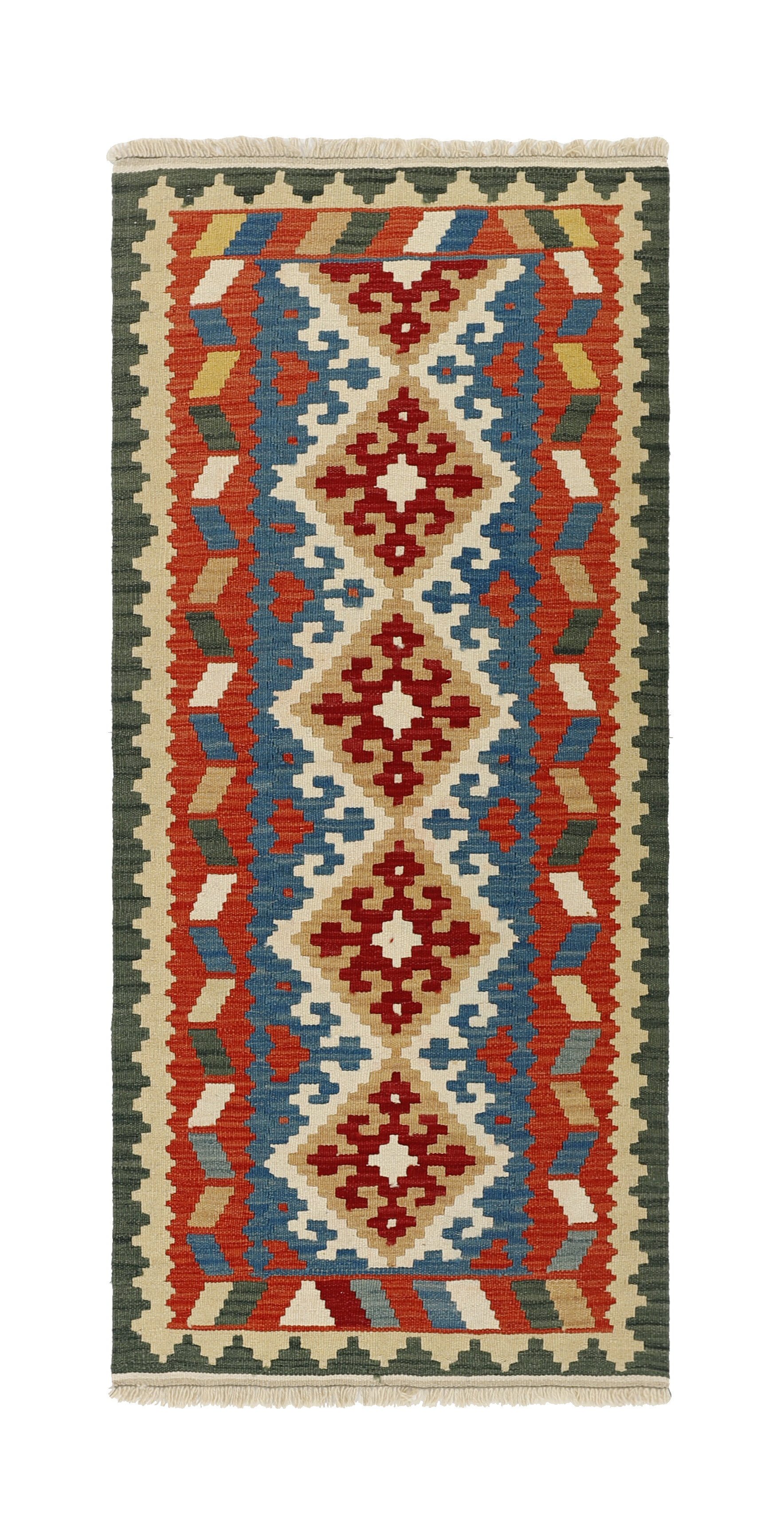 KelimItem no.: 1519225 Size: 83 cm x 194 cmThese Kelims are flat woven rugs, woven by nomads in western Persia. A special weaving technique is used, giving the rug a thinner, flatter surface, with no pile. Kelims are also quicker to produce, compared to common Oriental rugs. The colours are natural and no two rugs are alike. Kelims are produced in several regions and under many names, but the most well known Kelim types are Seneh, Sumak, Fars, and Kelim Gashghai.