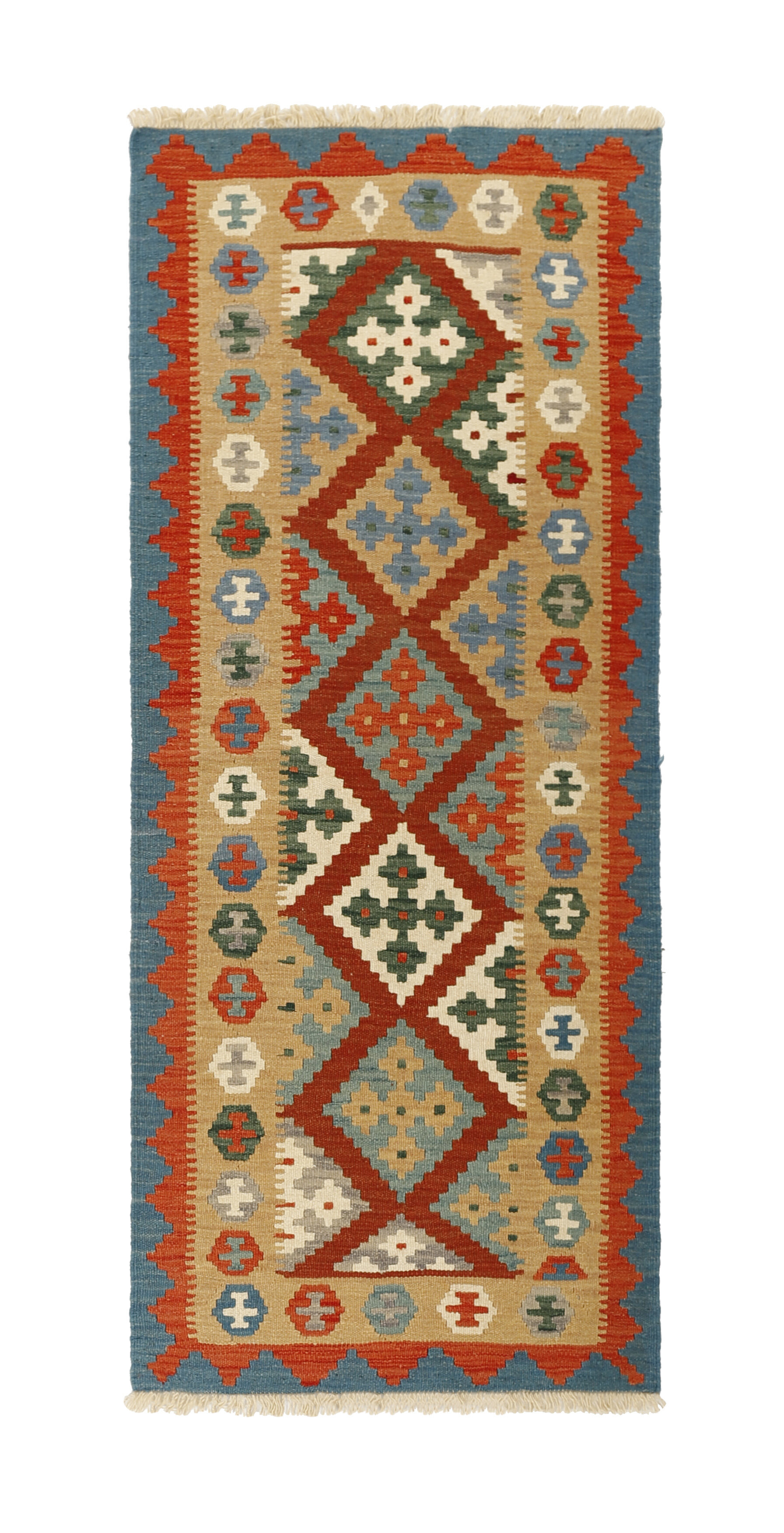 KelimItem no.: 1519229 Size: 81 cm x 197 cmThese Kelims are flat woven rugs, woven by nomads in western Persia. A special weaving technique is used, giving the rug a thinner, flatter surface, with no pile. Kelims are also quicker to produce, compared to common Oriental rugs. The colours are natural and no two rugs are alike. Kelims are produced in several regions and under many names, but the most well known Kelim types are Seneh, Sumak, Fars, and Kelim Gashghai.