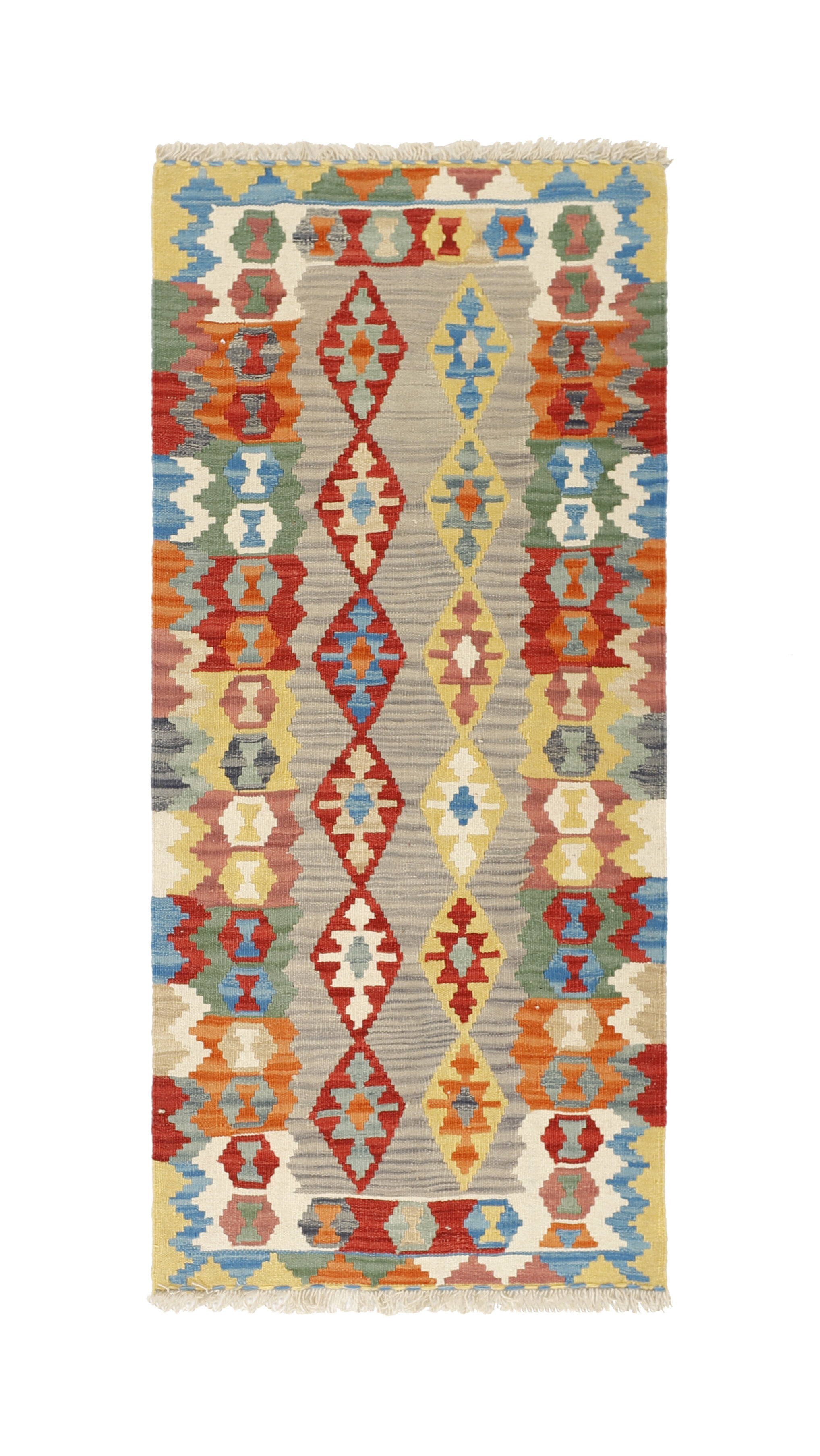 KelimItem no.: 1519230 Size: 84 cm x 187 cmThese Kelims are flat woven rugs, woven by nomads in western Persia. A special weaving technique is used, giving the rug a thinner, flatter surface, with no pile. Kelims are also quicker to produce, compared to common Oriental rugs. The colours are natural and no two rugs are alike. Kelims are produced in several regions and under many names, but the most well known Kelim types are Seneh, Sumak, Fars, and Kelim Gashghai.