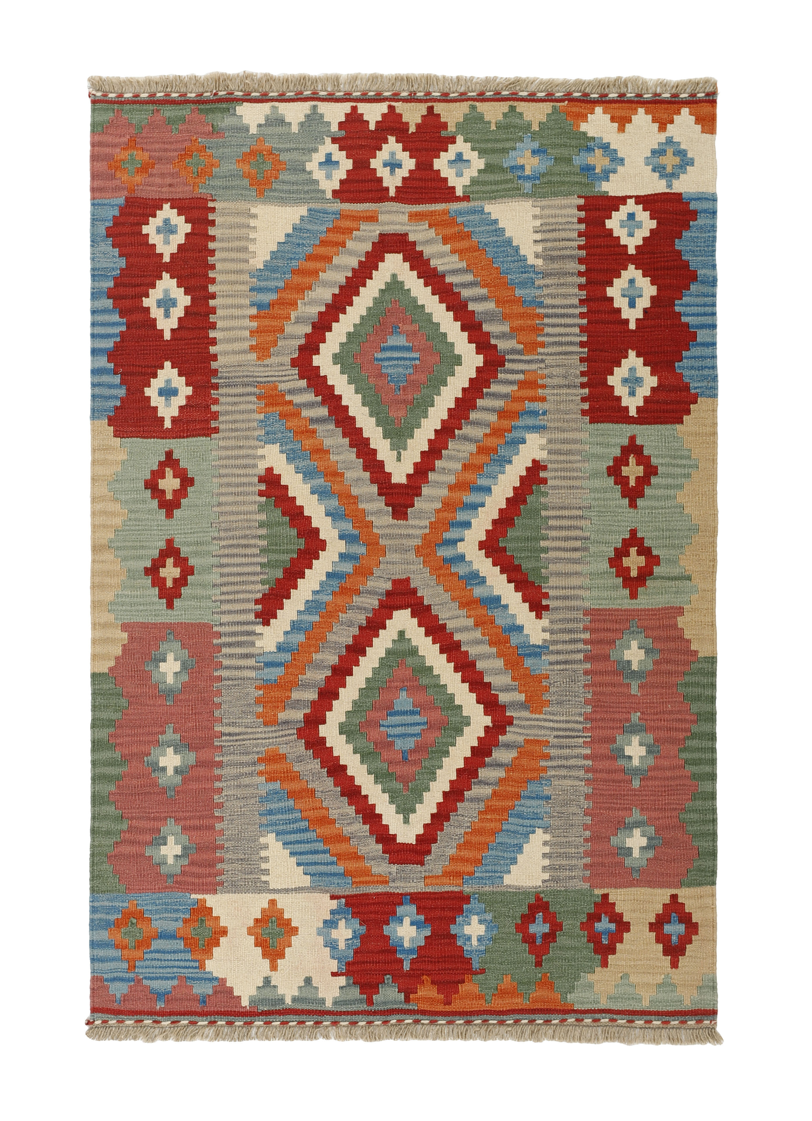 KelimItem no.: 1519253 Size: 123 cm x 184 cmThese Kelims are flat woven rugs, woven by nomads in western Persia. A special weaving technique is used, giving the rug a thinner, flatter surface, with no pile. Kelims are also quicker to produce, compared to common Oriental rugs. The colours are natural and no two rugs are alike. Kelims are produced in several regions and under many names, but the most well known Kelim types are Seneh, Sumak, Fars, and Kelim Gashghai.