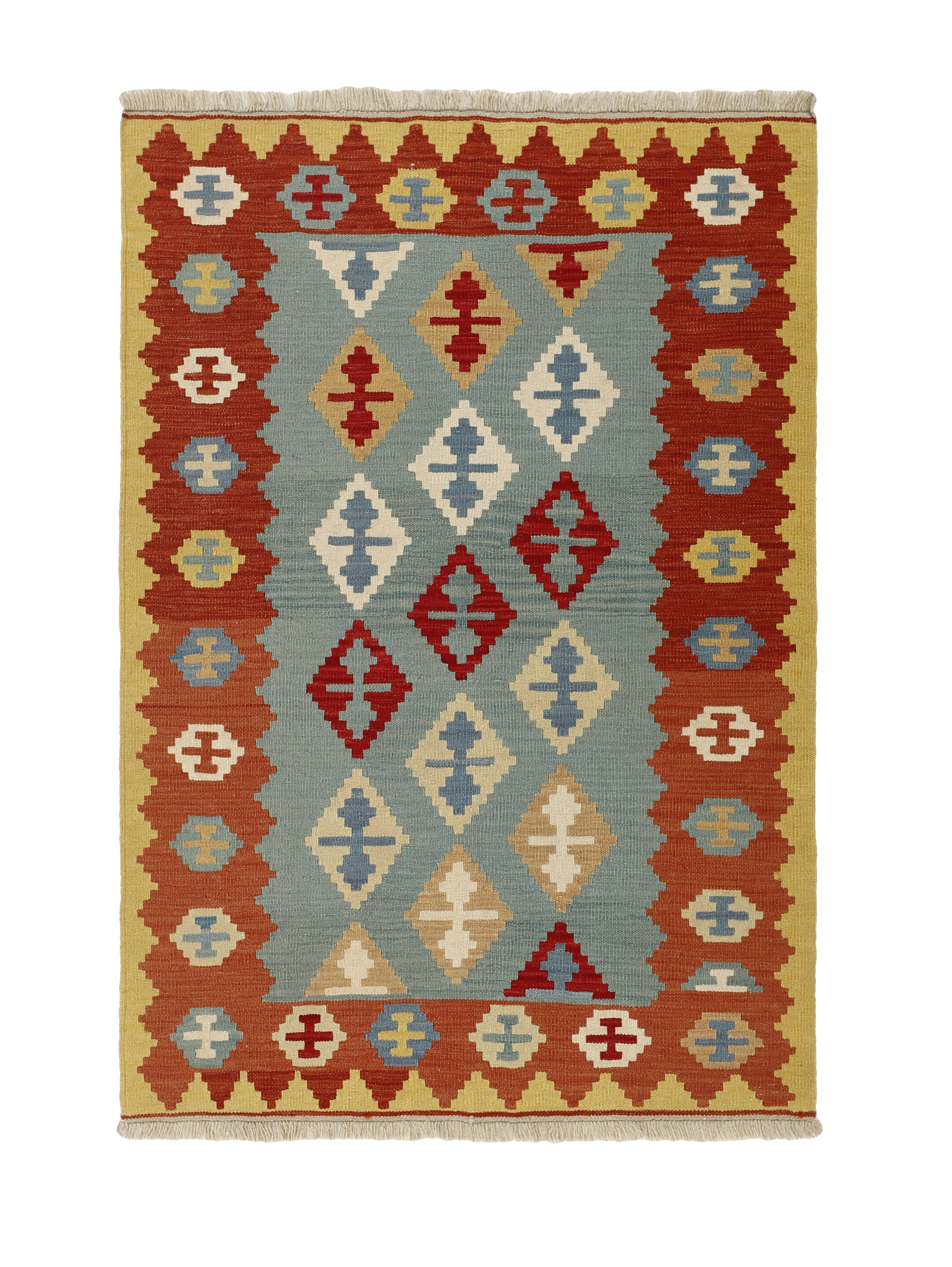 KelimItem no.: 1519264 Size: 123 cm x 179 cmThese Kelims are flat woven rugs, woven by nomads in western Persia. A special weaving technique is used, giving the rug a thinner, flatter surface, with no pile. Kelims are also quicker to produce, compared to common Oriental rugs. The colours are natural and no two rugs are alike. Kelims are produced in several regions and under many names, but the most well known Kelim types are Seneh, Sumak, Fars, and Kelim Gashghai.