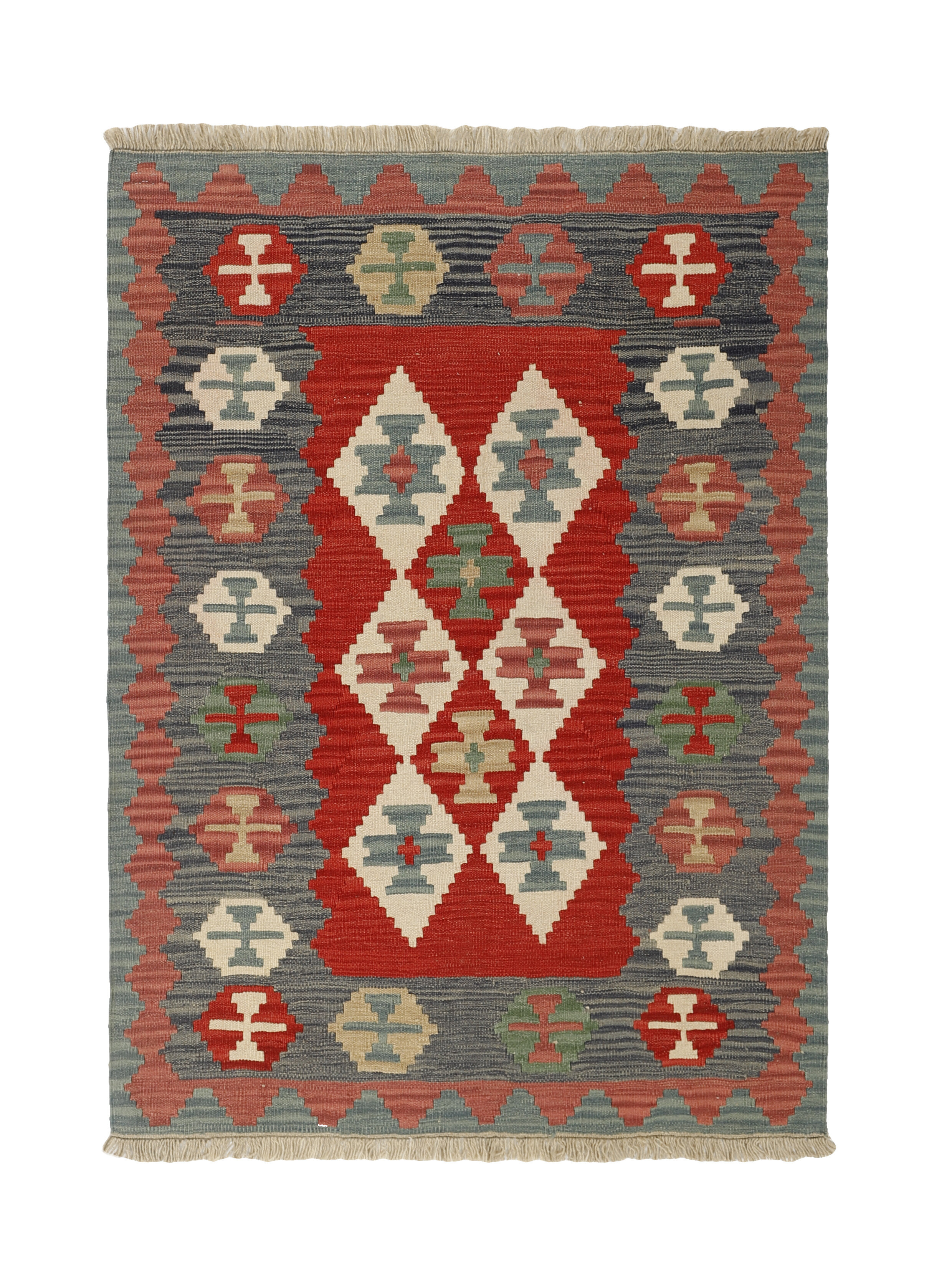 KelimItem no.: 1519281 Size: 130 cm x 177 cmThese Kelims are flat woven rugs, woven by nomads in western Persia. A special weaving technique is used, giving the rug a thinner, flatter surface, with no pile. Kelims are also quicker to produce, compared to common Oriental rugs. The colours are natural and no two rugs are alike. Kelims are produced in several regions and under many names, but the most well known Kelim types are Seneh, Sumak, Fars, and Kelim Gashghai.