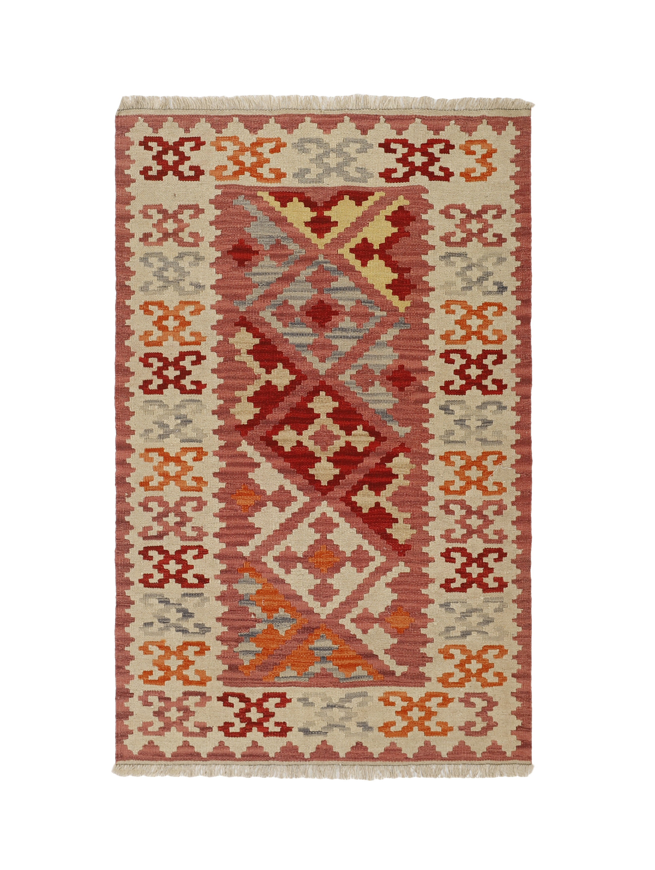 KelimItem no.: 1519283 Size: 116 cm x 183 cmThese Kelims are flat woven rugs, woven by nomads in western Persia. A special weaving technique is used, giving the rug a thinner, flatter surface, with no pile. Kelims are also quicker to produce, compared to common Oriental rugs. The colours are natural and no two rugs are alike. Kelims are produced in several regions and under many names, but the most well known Kelim types are Seneh, Sumak, Fars, and Kelim Gashghai.