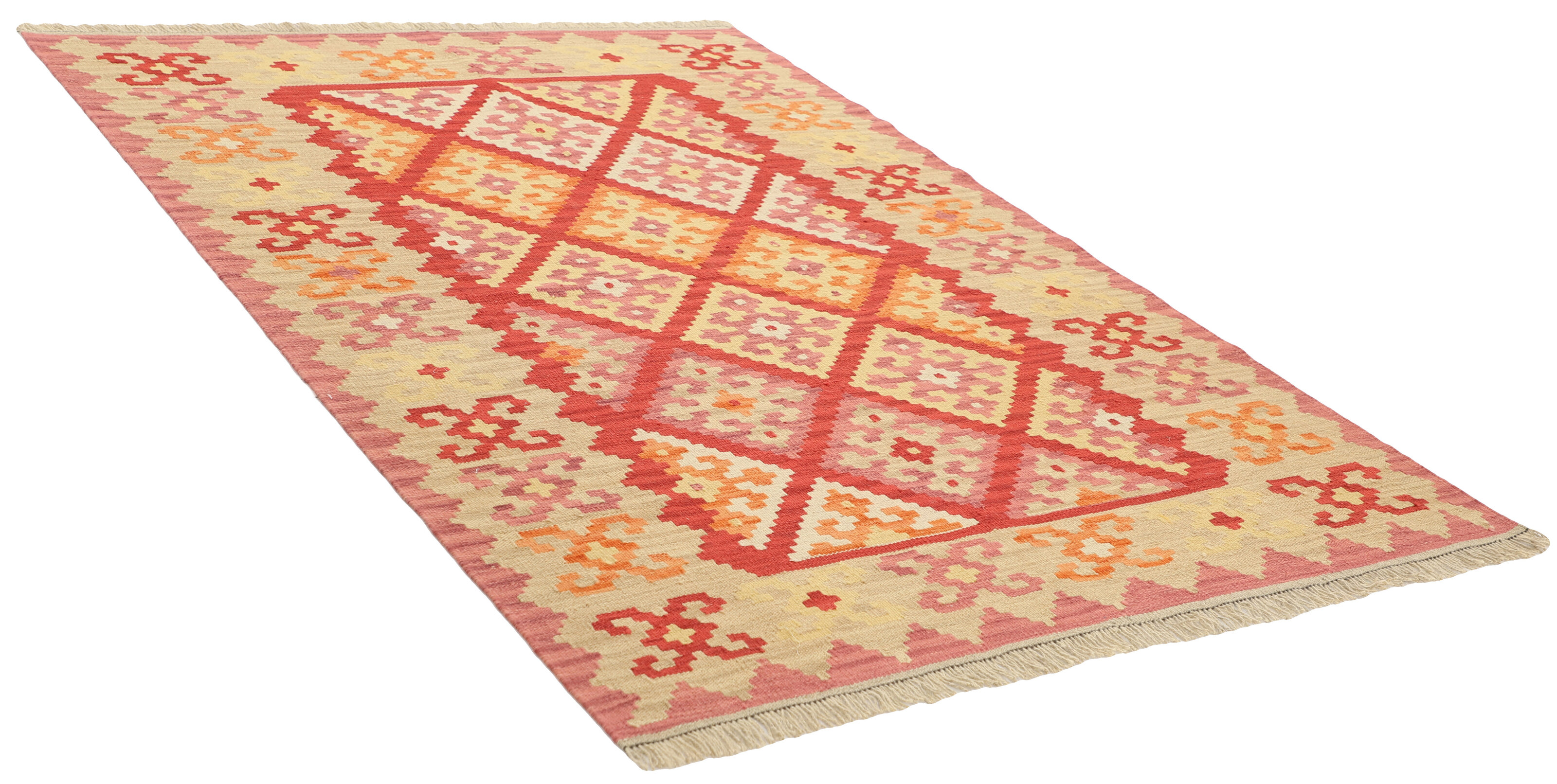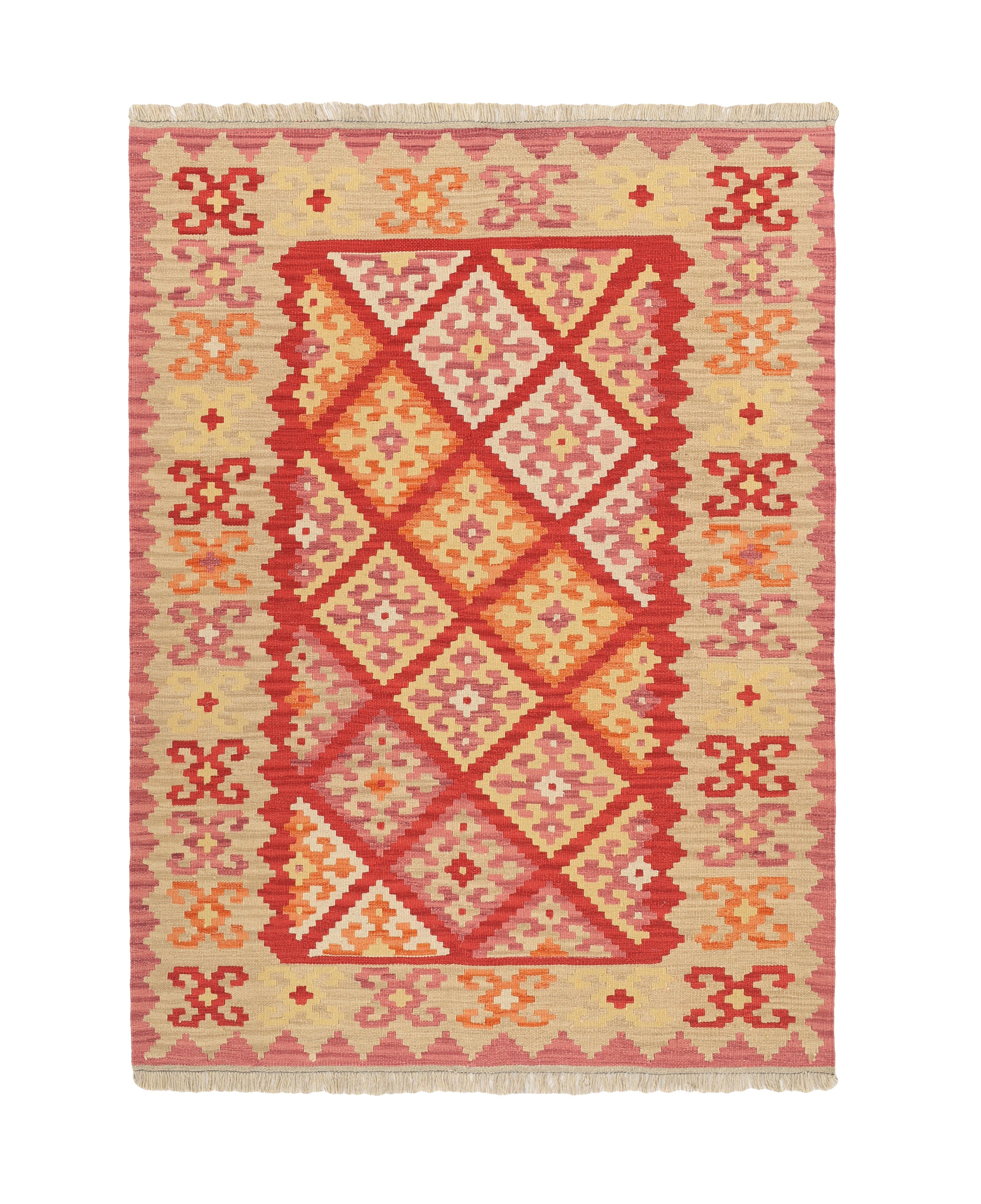 KelimItem no.: 1519361 Size: 155 cm x 206 cmThese Kelims are flat woven rugs, woven by nomads in western Persia. A special weaving technique is used, giving the rug a thinner, flatter surface, with no pile. Kelims are also quicker to produce, compared to common Oriental rugs. The colours are natural and no two rugs are alike. Kelims are produced in several regions and under many names, but the most well known Kelim types are Seneh, Sumak, Fars, and Kelim Gashghai.
