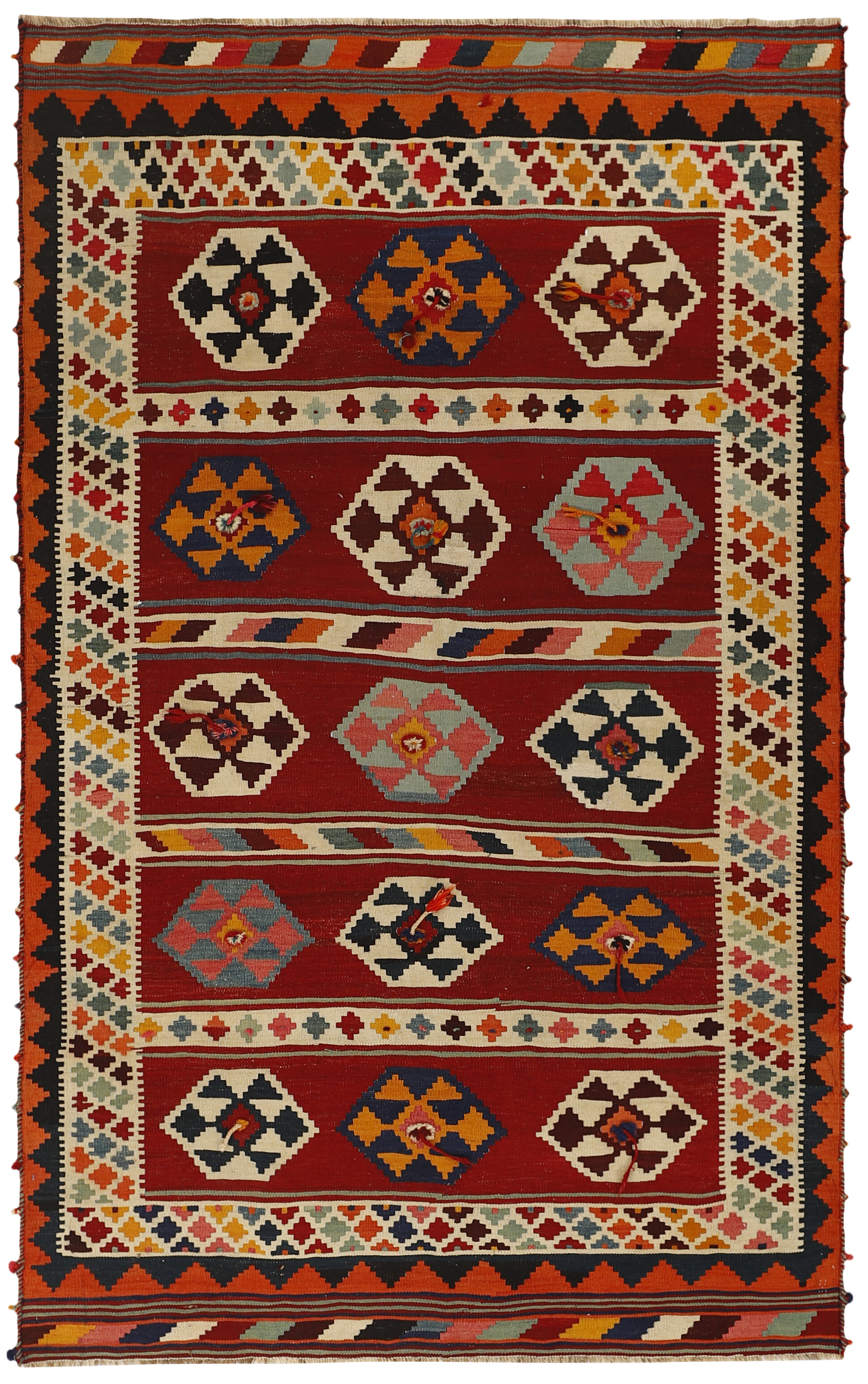 Kelim OldItem no.: 1514866 Size: 153 cm x 253 cmPersian Kelim Old are often oblong, and were originally used in tents by the nomads. Kelim rugs are often placed on top of other rugs as insulation. The rugs are often up to 50 years old, sometimes more than 80 years. The nomads knot or weave the rugs they need themselves, and use them for many different purposes, such as saddlebags for camels and donkeys, but they are mostly used for motorbikes, storing clothes, for sitting on, and as sleeping blankets.