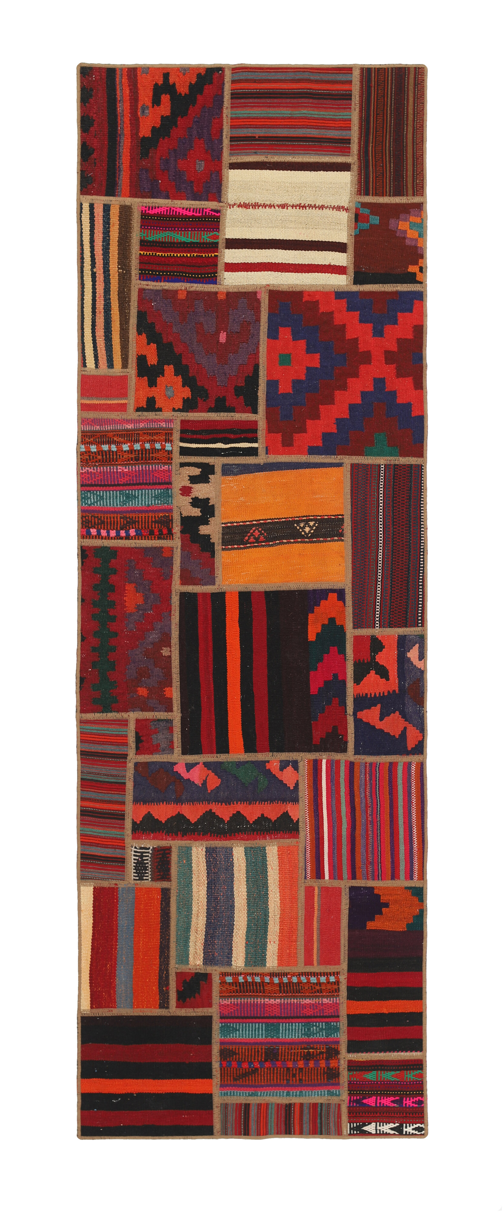 Tekkeh KelimItem no.: 1519402 Size: 80 cm x 250 cmTekkeh Kelims are produced from older Kelims that have been cut into smaller pieces, sewn together, and given a back cover. Tekkeh means piece, so Tekkeh Kelim means a patchwork rug where many pieces have been sewn together. Tekkeh Kelims are available in many sizes and have thoroughly unique patterns. The rugs are produced from 20-50 year old Kelims. Kelim rugs are hand woven rugs that are made using a special weaving technique, giving the rugs a thinner, felt-like quality. Tekkeh Kelim is produced of older kelim, cut into smaller pieces, sown together and with a backside applied. Tekkeh is the Oriental name for pieces, and Tekkeh kelim is an expression for a patchwork rug, where several pieces are sown together. Tekkeh Kelim is available in many sizes and all pieces has unique patterns. used a special weaving technique, that gives the rug a thinner and felt like quality.