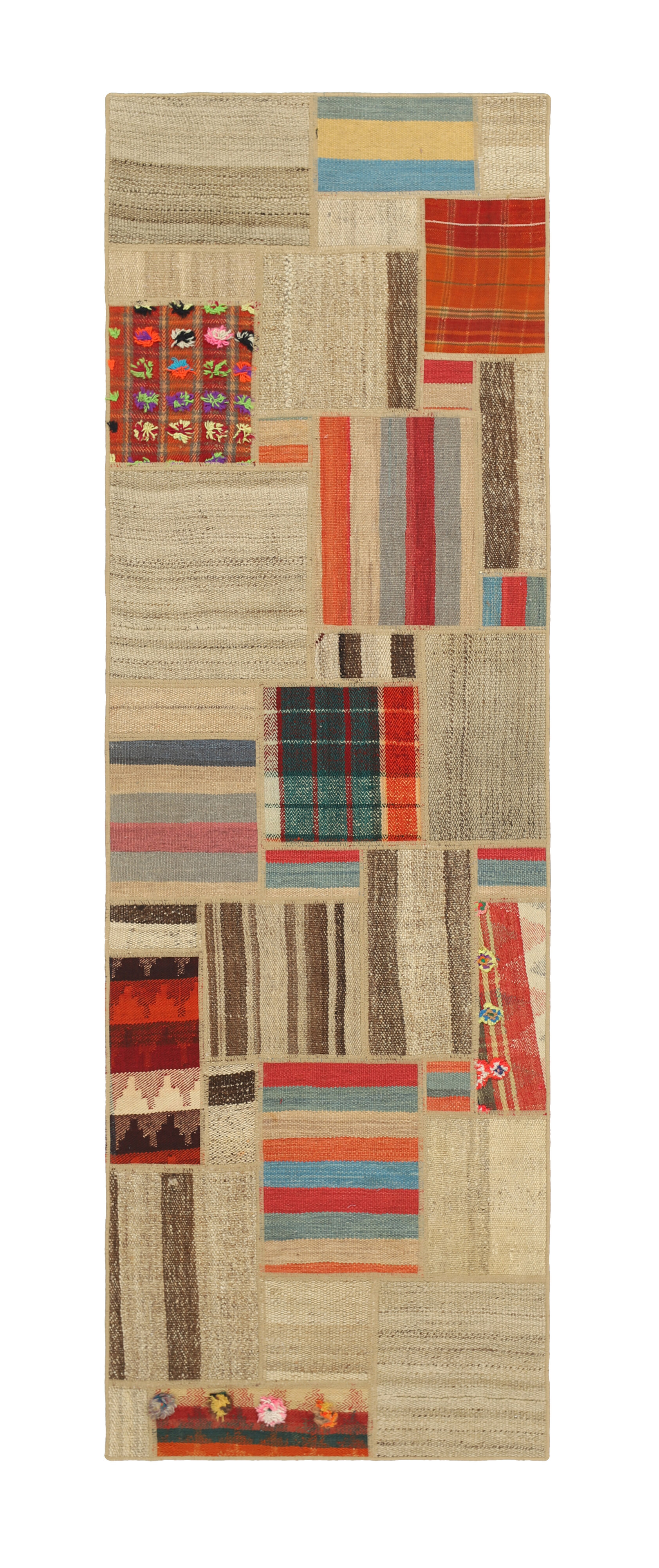 Tekkeh KelimItem no.: 1519403 Size: 80 cm x 250 cmTekkeh Kelims are produced from older Kelims that have been cut into smaller pieces, sewn together, and given a back cover. Tekkeh means piece, so Tekkeh Kelim means a patchwork rug where many pieces have been sewn together. Tekkeh Kelims are available in many sizes and have thoroughly unique patterns. The rugs are produced from 20-50 year old Kelims. Kelim rugs are hand woven rugs that are made using a special weaving technique, giving the rugs a thinner, felt-like quality. Tekkeh Kelim is produced of older kelim, cut into smaller pieces, sown together and with a backside applied. Tekkeh is the Oriental name for pieces, and Tekkeh kelim is an expression for a patchwork rug, where several pieces are sown together. Tekkeh Kelim is available in many sizes and all pieces has unique patterns. used a special weaving technique, that gives the rug a thinner and felt like quality.