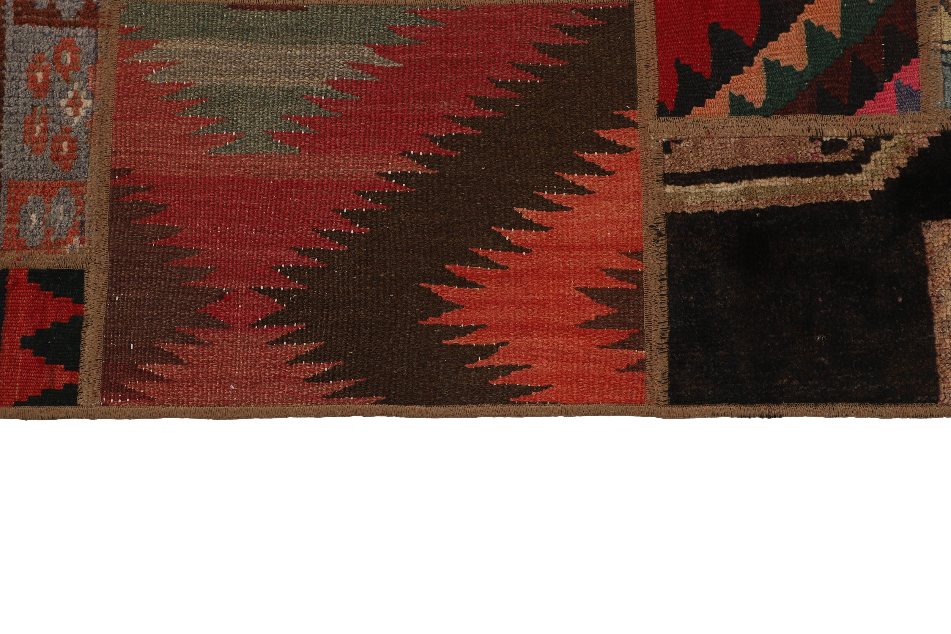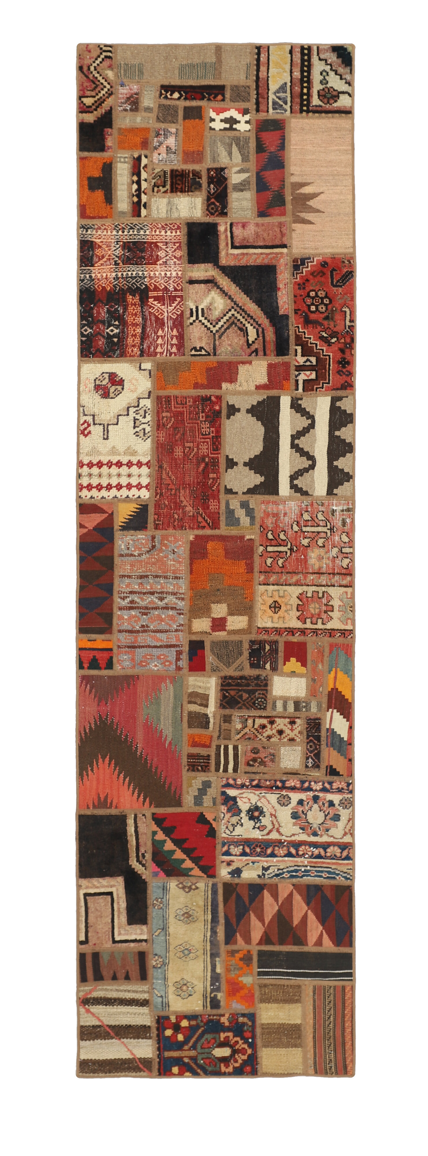 Tekkeh KelimItem no.: 1519409 Size: 80 cm x 300 cmTekkeh Kelims are produced from older Kelims that have been cut into smaller pieces, sewn together, and given a back cover. Tekkeh means piece, so Tekkeh Kelim means a patchwork rug where many pieces have been sewn together. Tekkeh Kelims are available in many sizes and have thoroughly unique patterns. The rugs are produced from 20-50 year old Kelims. Kelim rugs are hand woven rugs that are made using a special weaving technique, giving the rugs a thinner, felt-like quality. Tekkeh Kelim is produced of older kelim, cut into smaller pieces, sown together and with a backside applied. Tekkeh is the Oriental name for pieces, and Tekkeh kelim is an expression for a patchwork rug, where several pieces are sown together. Tekkeh Kelim is available in many sizes and all pieces has unique patterns. used a special weaving technique, that gives the rug a thinner and felt like quality.