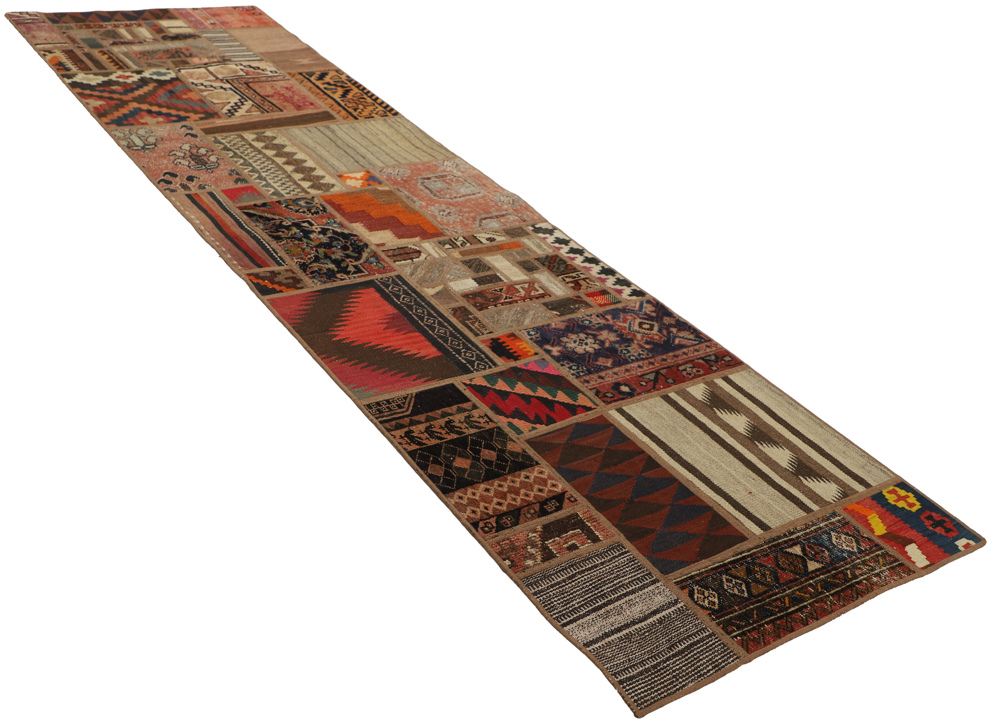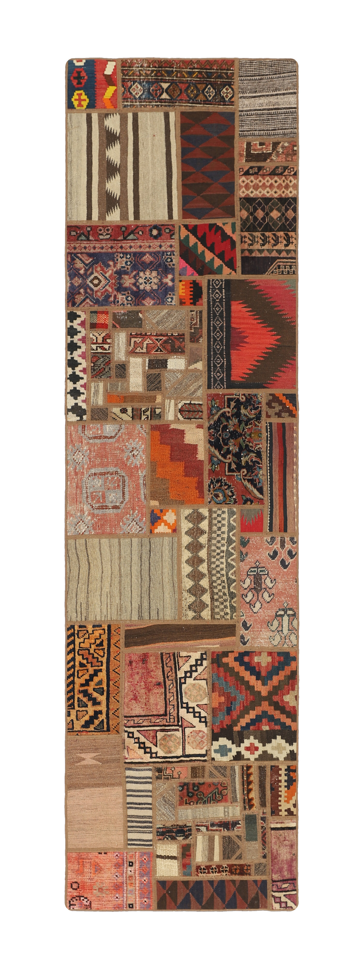 Tekkeh KelimItem no.: 1519414 Size: 80 cm x 300 cmTekkeh Kelims are produced from older Kelims that have been cut into smaller pieces, sewn together, and given a back cover. Tekkeh means piece, so Tekkeh Kelim means a patchwork rug where many pieces have been sewn together. Tekkeh Kelims are available in many sizes and have thoroughly unique patterns. The rugs are produced from 20-50 year old Kelims. Kelim rugs are hand woven rugs that are made using a special weaving technique, giving the rugs a thinner, felt-like quality. Tekkeh Kelim is produced of older kelim, cut into smaller pieces, sown together and with a backside applied. Tekkeh is the Oriental name for pieces, and Tekkeh kelim is an expression for a patchwork rug, where several pieces are sown together. Tekkeh Kelim is available in many sizes and all pieces has unique patterns. used a special weaving technique, that gives the rug a thinner and felt like quality.