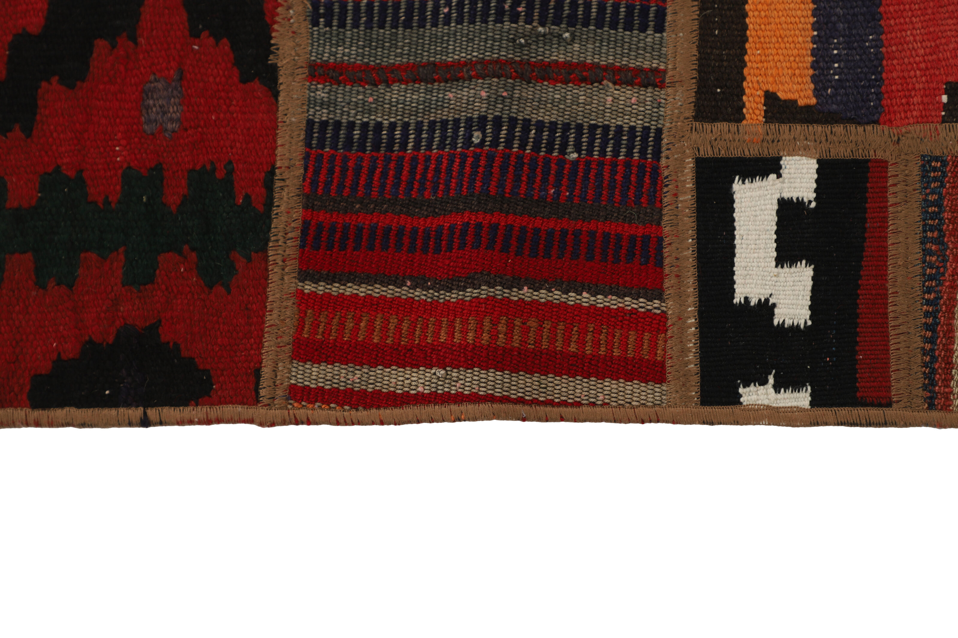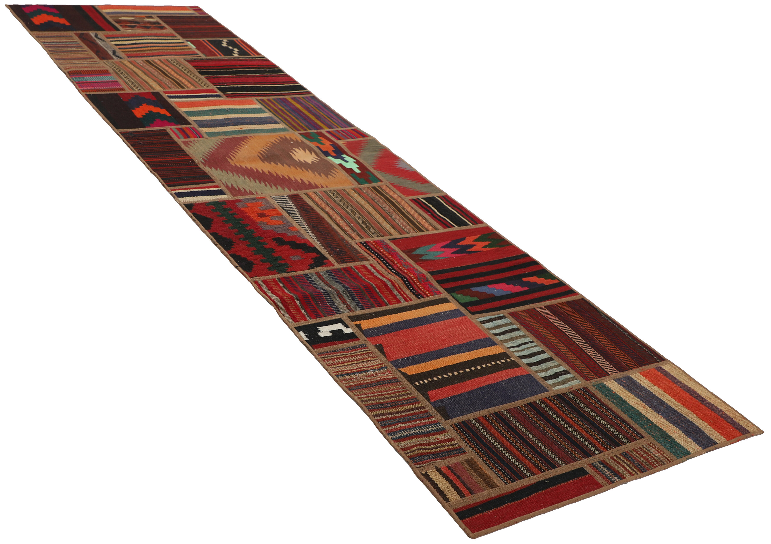Tekkeh KelimItem no.: 1519421 Size: 80 cm x 300 cmTekkeh Kelims are produced from older Kelims that have been cut into smaller pieces, sewn together, and given a back cover. Tekkeh means piece, so Tekkeh Kelim means a patchwork rug where many pieces have been sewn together. Tekkeh Kelims are available in many sizes and have thoroughly unique patterns. The rugs are produced from 20-50 year old Kelims. Kelim rugs are hand woven rugs that are made using a special weaving technique, giving the rugs a thinner, felt-like quality. Tekkeh Kelim is produced of older kelim, cut into smaller pieces, sown together and with a backside applied. Tekkeh is the Oriental name for pieces, and Tekkeh kelim is an expression for a patchwork rug, where several pieces are sown together. Tekkeh Kelim is available in many sizes and all pieces has unique patterns. used a special weaving technique, that gives the rug a thinner and felt like quality.