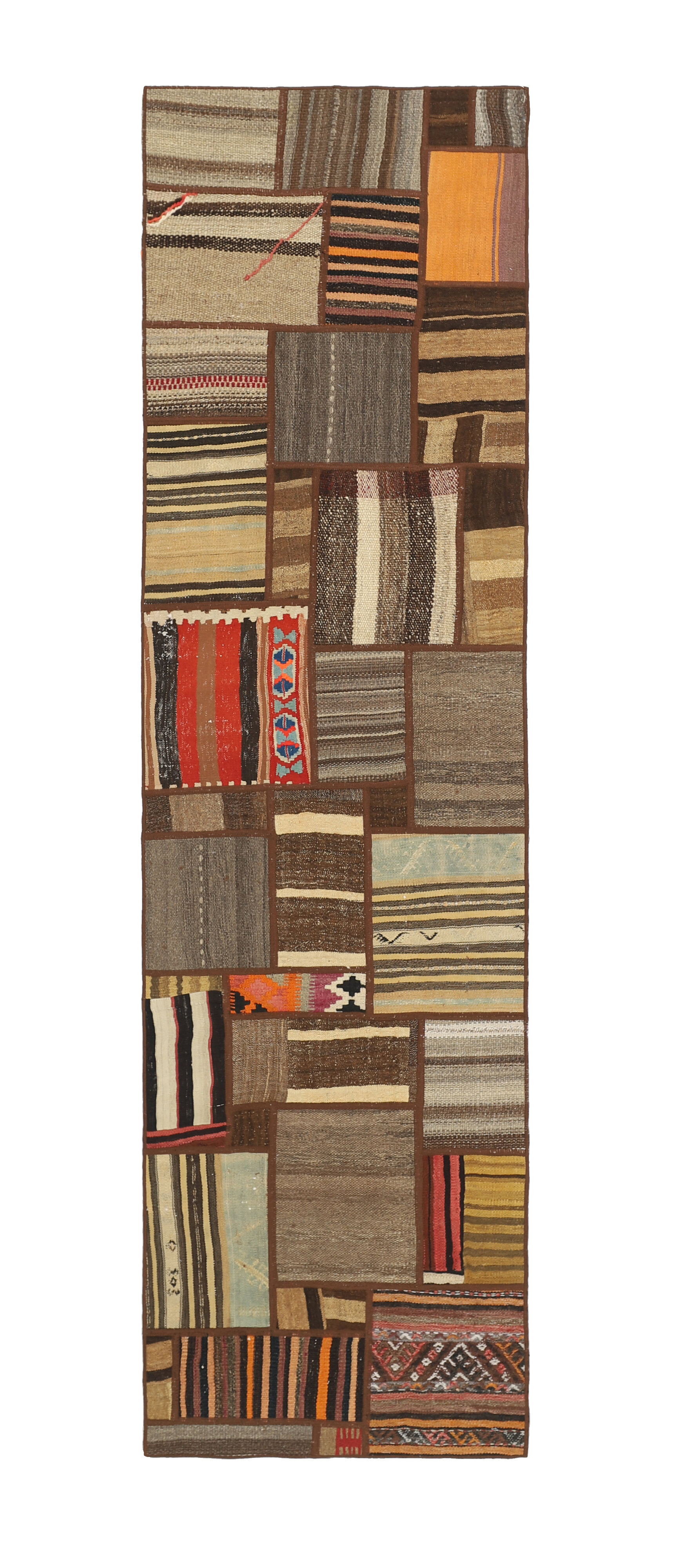 Tekkeh KelimItem no.: 1519422 Size: 80 cm x 300 cmTekkeh Kelims are produced from older Kelims that have been cut into smaller pieces, sewn together, and given a back cover. Tekkeh means piece, so Tekkeh Kelim means a patchwork rug where many pieces have been sewn together. Tekkeh Kelims are available in many sizes and have thoroughly unique patterns. The rugs are produced from 20-50 year old Kelims. Kelim rugs are hand woven rugs that are made using a special weaving technique, giving the rugs a thinner, felt-like quality. Tekkeh Kelim is produced of older kelim, cut into smaller pieces, sown together and with a backside applied. Tekkeh is the Oriental name for pieces, and Tekkeh kelim is an expression for a patchwork rug, where several pieces are sown together. Tekkeh Kelim is available in many sizes and all pieces has unique patterns. used a special weaving technique, that gives the rug a thinner and felt like quality.