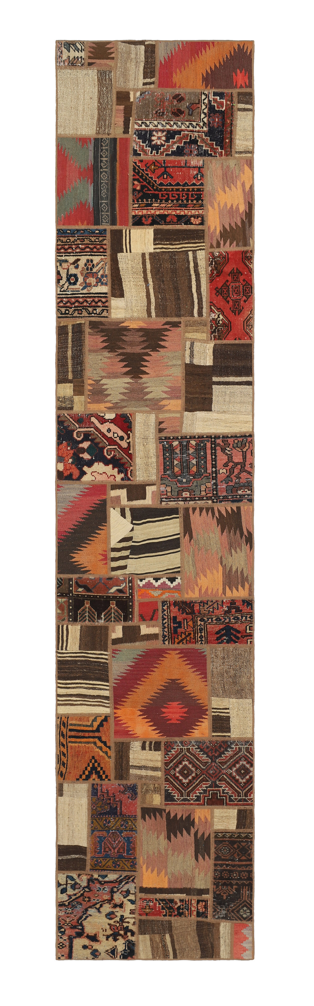 Tekkeh KelimItem no.: 1519426 Size: 80 cm x 400 cmTekkeh Kelims are produced from older Kelims that have been cut into smaller pieces, sewn together, and given a back cover. Tekkeh means piece, so Tekkeh Kelim means a patchwork rug where many pieces have been sewn together. Tekkeh Kelims are available in many sizes and have thoroughly unique patterns. The rugs are produced from 20-50 year old Kelims. Kelim rugs are hand woven rugs that are made using a special weaving technique, giving the rugs a thinner, felt-like quality. Tekkeh Kelim is produced of older kelim, cut into smaller pieces, sown together and with a backside applied. Tekkeh is the Oriental name for pieces, and Tekkeh kelim is an expression for a patchwork rug, where several pieces are sown together. Tekkeh Kelim is available in many sizes and all pieces has unique patterns. used a special weaving technique, that gives the rug a thinner and felt like quality.