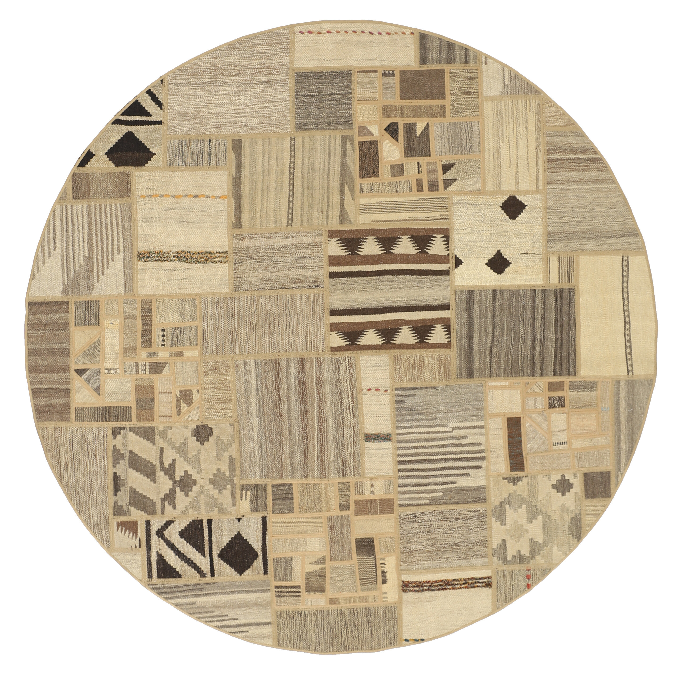 Tekkeh KelimItem no.: 1519434 Size: 200 cm x 200 cmTekkeh Kelims are produced from older Kelims that have been cut into smaller pieces, sewn together, and given a back cover. Tekkeh means piece, so Tekkeh Kelim means a patchwork rug where many pieces have been sewn together. Tekkeh Kelims are available in many sizes and have thoroughly unique patterns. The rugs are produced from 20-50 year old Kelims. Kelim rugs are hand woven rugs that are made using a special weaving technique, giving the rugs a thinner, felt-like quality. Tekkeh Kelim is produced of older kelim, cut into smaller pieces, sown together and with a backside applied. Tekkeh is the Oriental name for pieces, and Tekkeh kelim is an expression for a patchwork rug, where several pieces are sown together. Tekkeh Kelim is available in many sizes and all pieces has unique patterns. used a special weaving technique, that gives the rug a thinner and felt like quality.