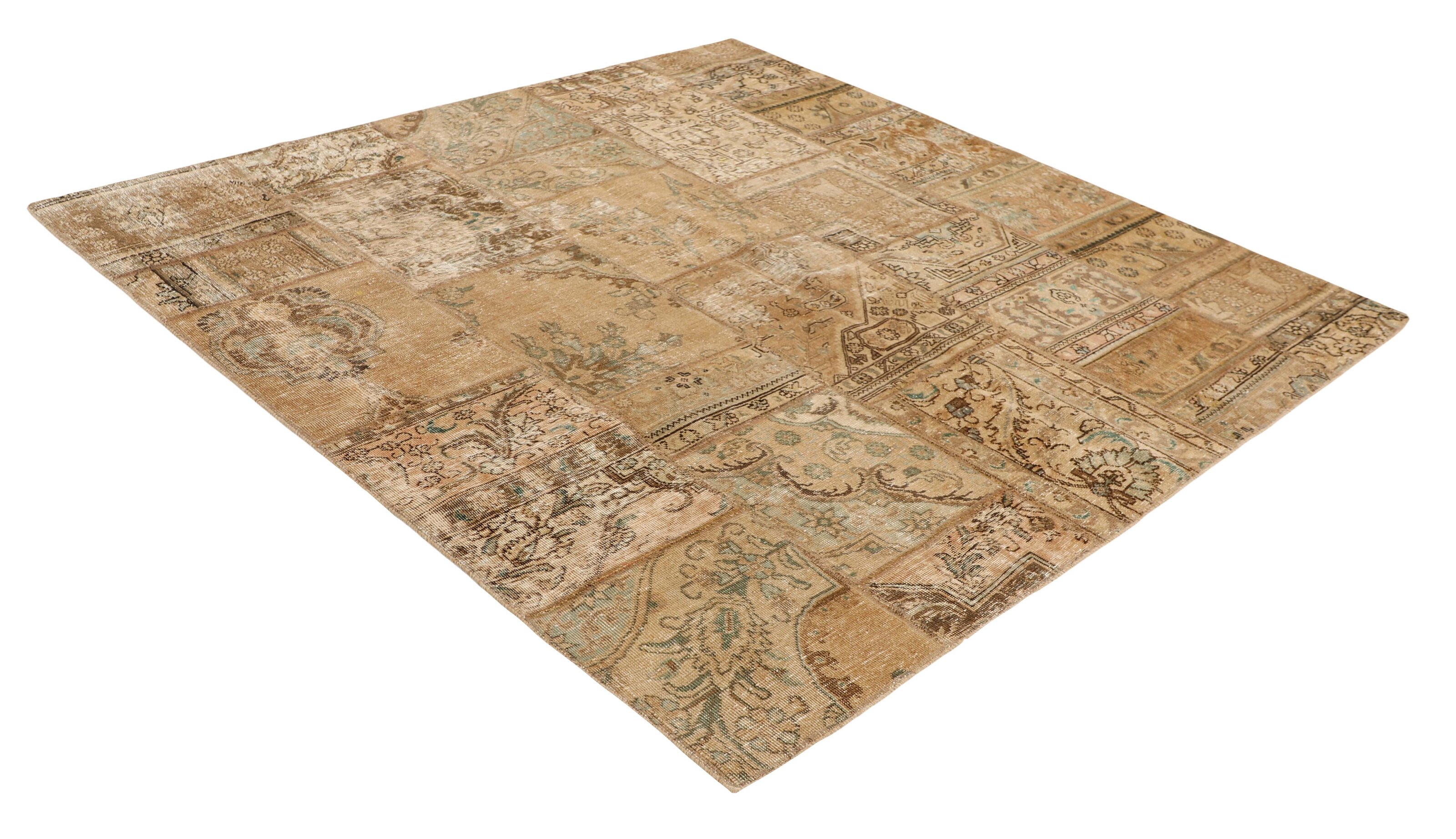 Vintage PatchworkItem no.: 1515905 Size: 201 cm x 201 cmVintage Royals are antique hand knotted rugs of Persian origin. The Patchwork Collection consists of old rugs that have been beyond repair, and instead cut into smaller pieces and used for patchwork. The Patchwork pieces are stonewashed and recoloured in light, dark, or bright colours, with the old pattern just being visible. The Patchwork rug forms a whole new and unique design. The rugs are of a very high quality and are available in large sizes. With the Vintage Royal Patchwork Collection, you do not just get a rug; you adorn your home with a unique piece of antique, Persian handcraft.
