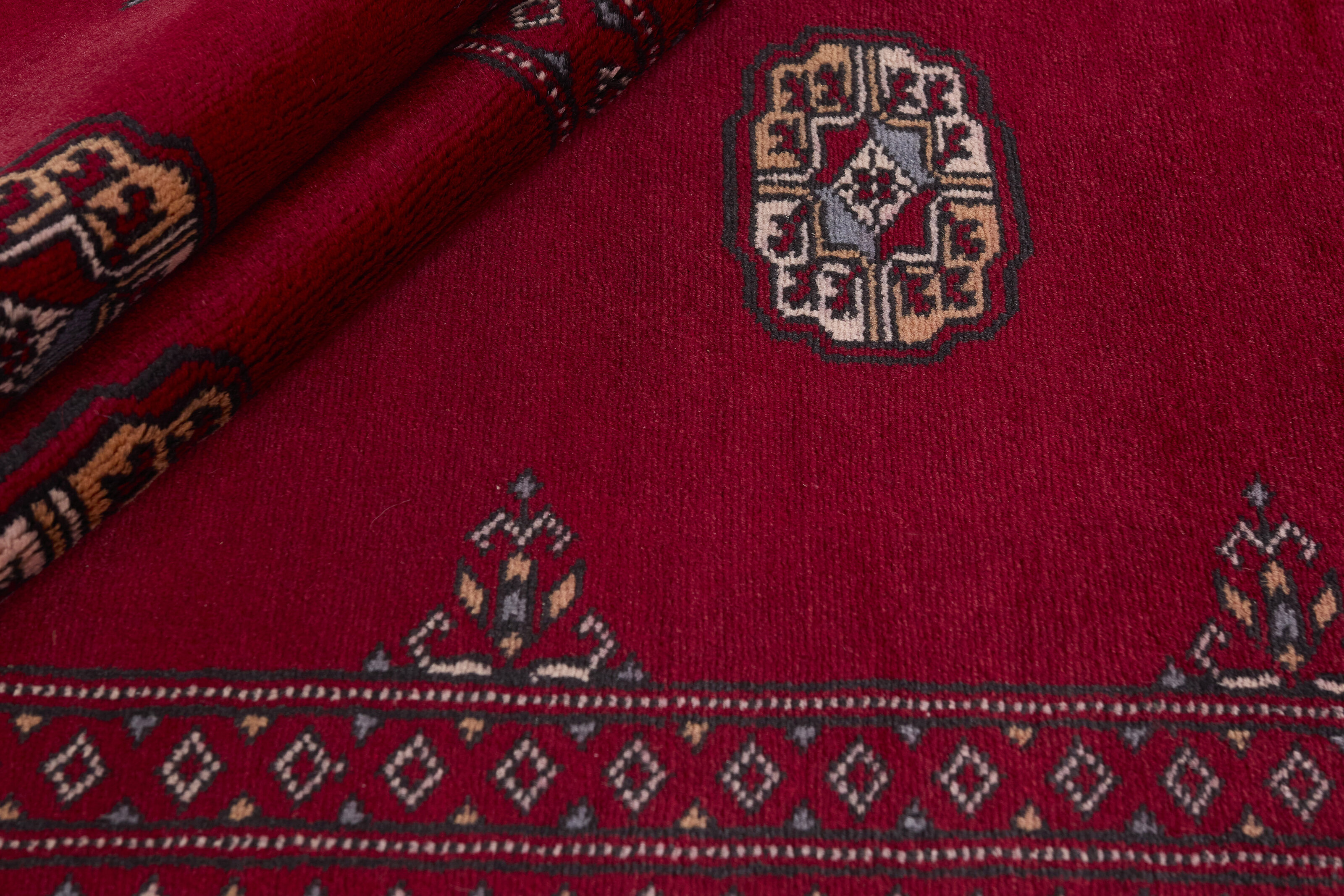 The 2-Ply rugs are produced in Lahore, Pakistan’s second largest city, which is also is the centre of the country’s hand knotted rug production. The rugs most often have the Tekke and Bokara patterns, which were originally inspired by patterns from Turkmenistan. The people of the Tekke Tribe, which was the largest nomadic tribe in Turkmenistan, were known as very industrious rug producers. The term Ply indicates the number of threads wound together to produce the yarn itself; 2-Ply thus guarantees that two threads were wound together during the knotting to make the yarn. The quality of wool is particularly soft and shining, and the warm-coloured patterns are simple and harmonious.