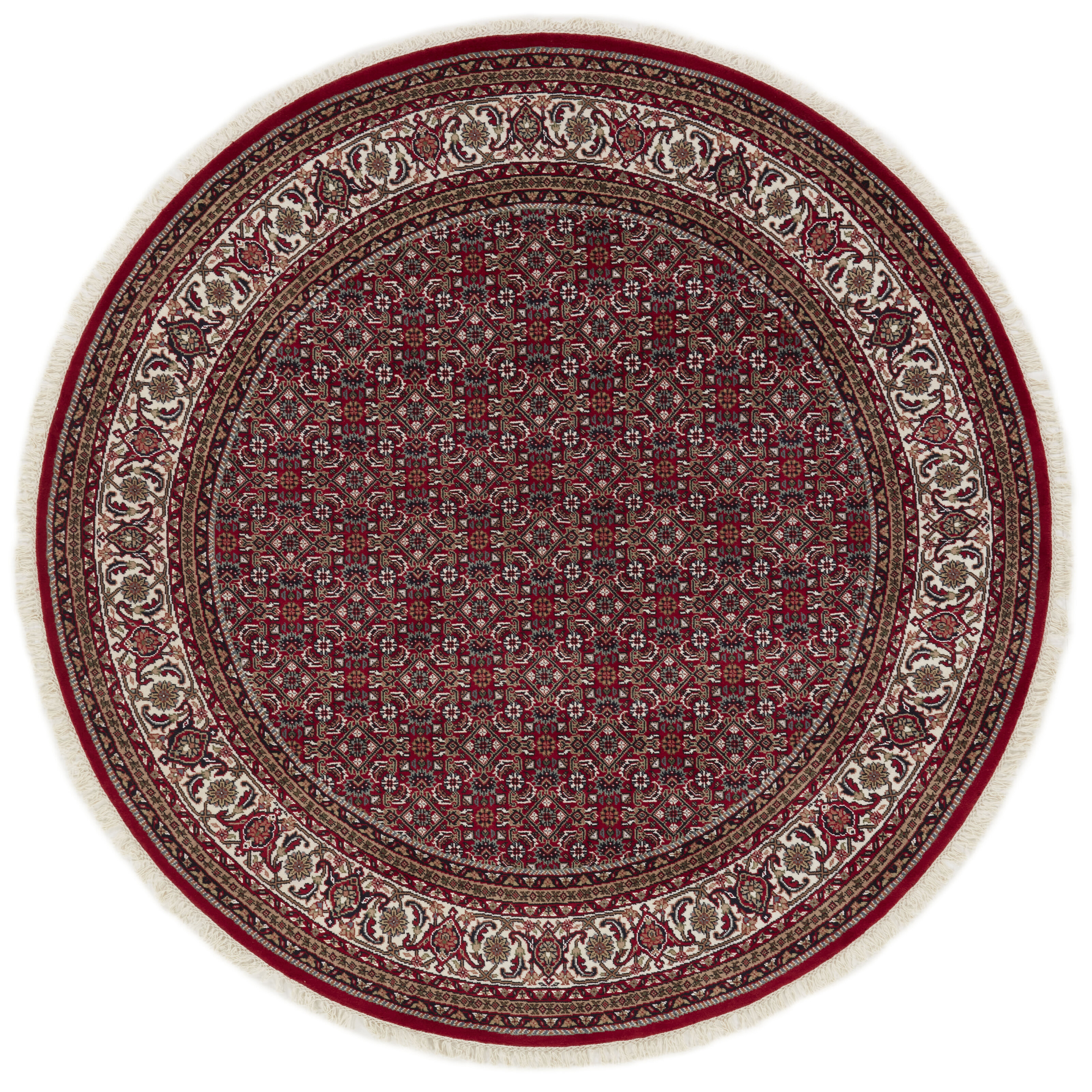 Bidjar IndiItem no.: 1512516 Size: 203 cm x 203 cmBidjar Indis are classical hand knotted rugs from India, with designs inspired by the original Persian Bidjar rugs. The colours are red and the patterns are hexagonal, often with a large central medallion surrounded by two other hexagons. The trimmings are decorated with rosettes and flowers. There is some difference in quality between Royals and Indis, but it is not easily observable.