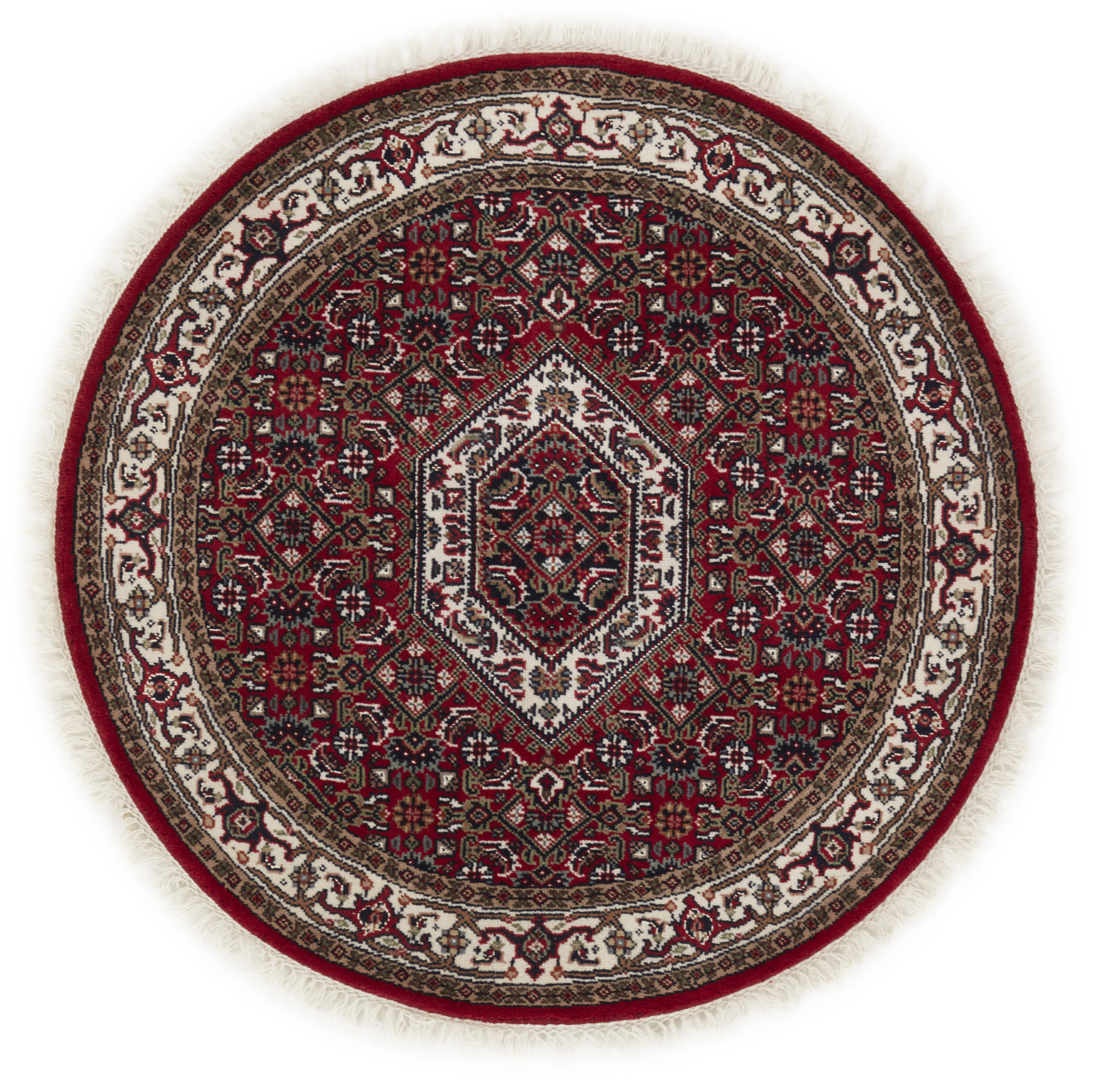 Bidjar IndiItem no.: 1516296 Size: 153 cm x 153 cmBidjar Indis are classical hand knotted rugs from India, with designs inspired by the original Persian Bidjar rugs. The colours are red and the patterns are hexagonal, often with a large central medallion surrounded by two other hexagons. The trimmings are decorated with rosettes and flowers. There is some difference in quality between Royals and Indis, but it is not easily observable.