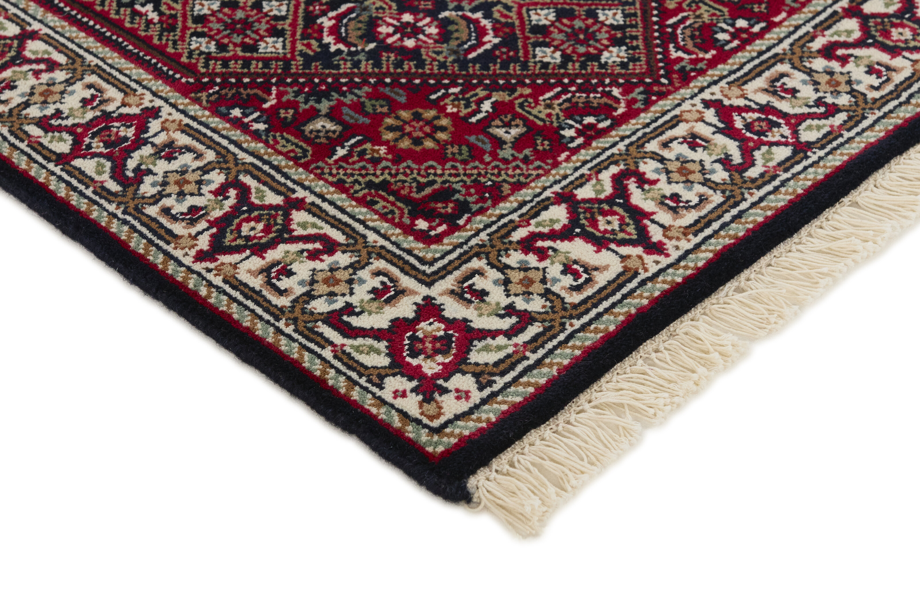 Bidjar IndiItem no.: 1516771 Size: 62 cm x 94 cmBidjar Indis are classical hand knotted rugs from India, with designs inspired by the original Persian Bidjar rugs. The colours are red and the patterns are hexagonal, often with a large central medallion surrounded by two other hexagons. The trimmings are decorated with rosettes and flowers. There is some difference in quality between Royals and Indis, but it is not easily observable.