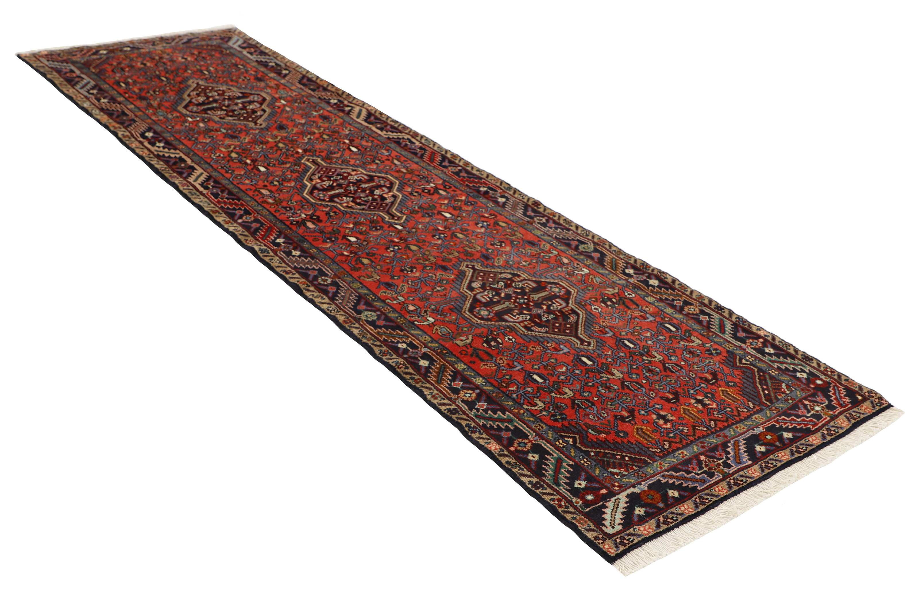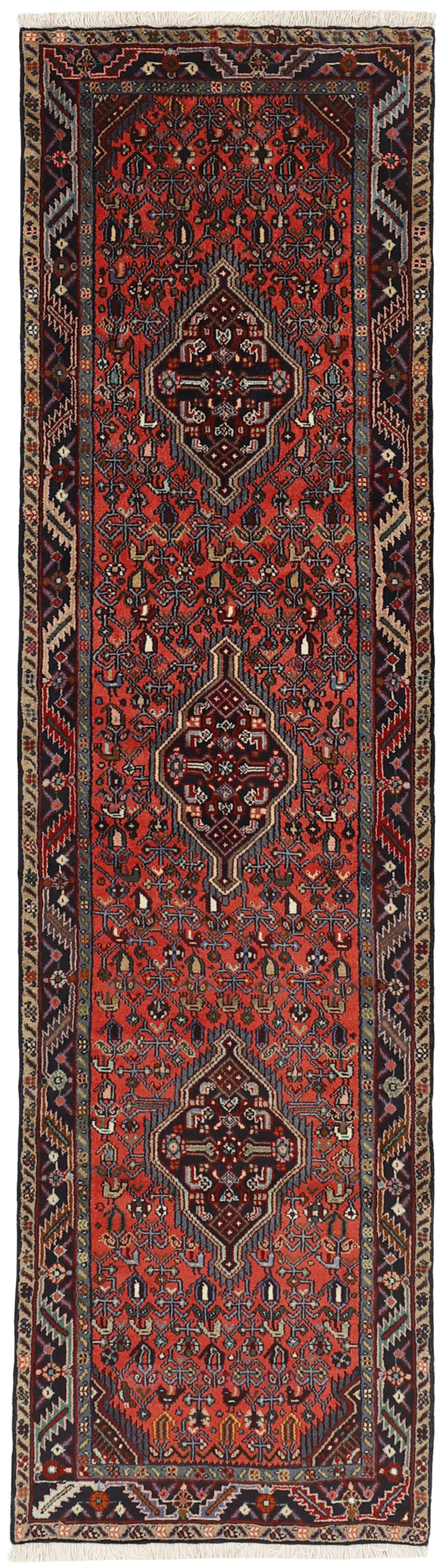AsadabadItem no.: 1514396 Size: 79 cm x 294 cmThis rug is from the district of Hamadan which is an important centre for the rug trade, as well as the most productive rug production area of Iran. Hamadan is a major city with hundreds of thousands of people. Like Ekbatan, it was a main city of the Achemenian kings. It has an indigenous Jewish population and numerous monuments, of which the most important are the tombs of Esther and Mordicai (central to Jewish pilgrims), and the tomb at Avicenna. Hamadan is a provincial capitol. Two types of rugs are knotted. One is the so-called “city rug”, also known as the Shahrbaff. The production is modern and largely state controlled. The village production, however, is much more important; Hamadan is a market city for many rug producing villages that each has its own pattern. Most prominent are Borchalu, Tuserkman, Memraban, Khamseh, Begardeh, Enjilas, Hosseinabad, and Zandjan. There is a wide range of patterns but the quality is very consistent. The colours are strong, and often plant colours. The patterns are daring, although random, and Hosseinabad and Enjilas in particular are known for through going patterns. The rugs are usually not much bigger than 3 by 2 metres.