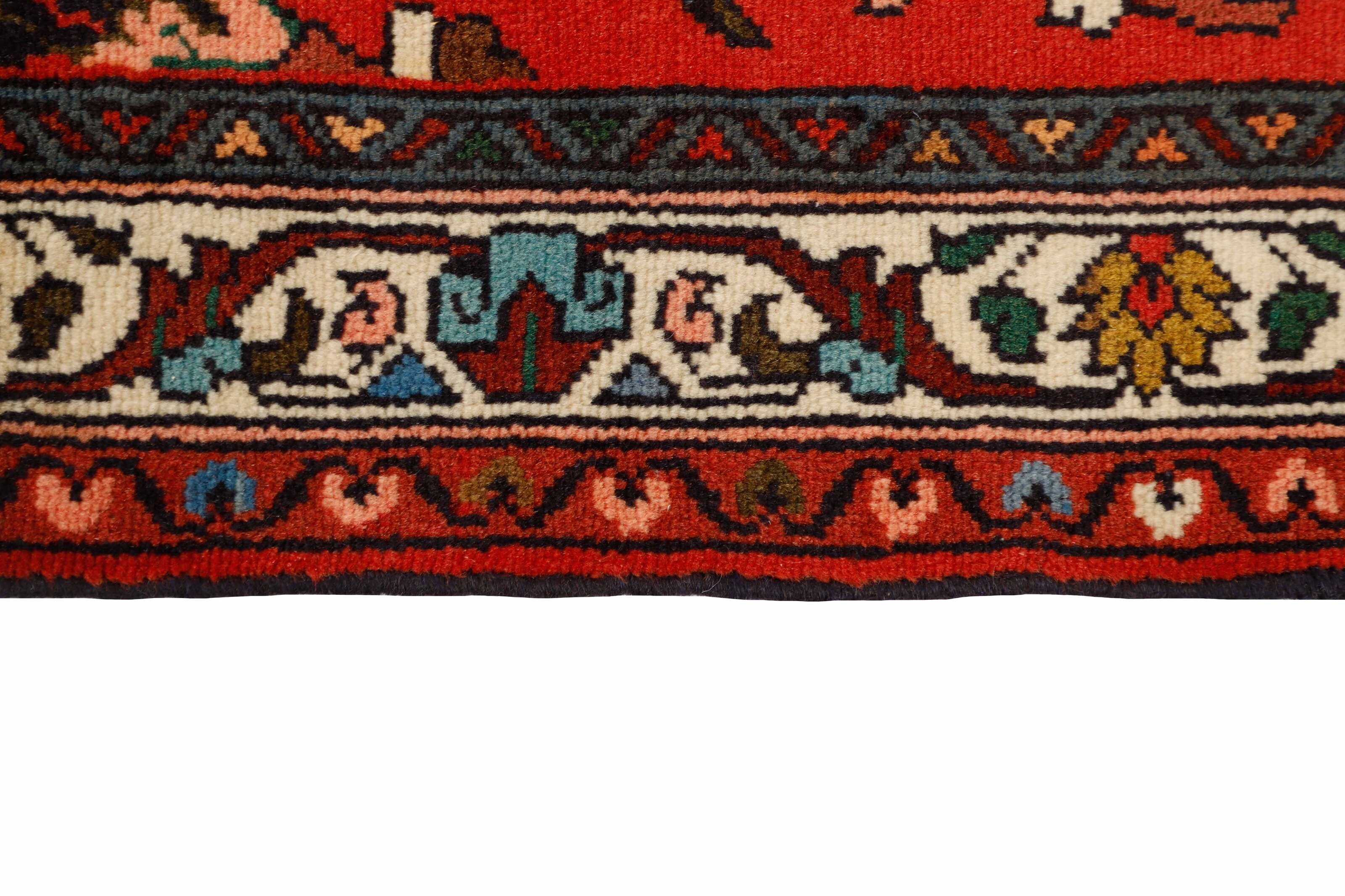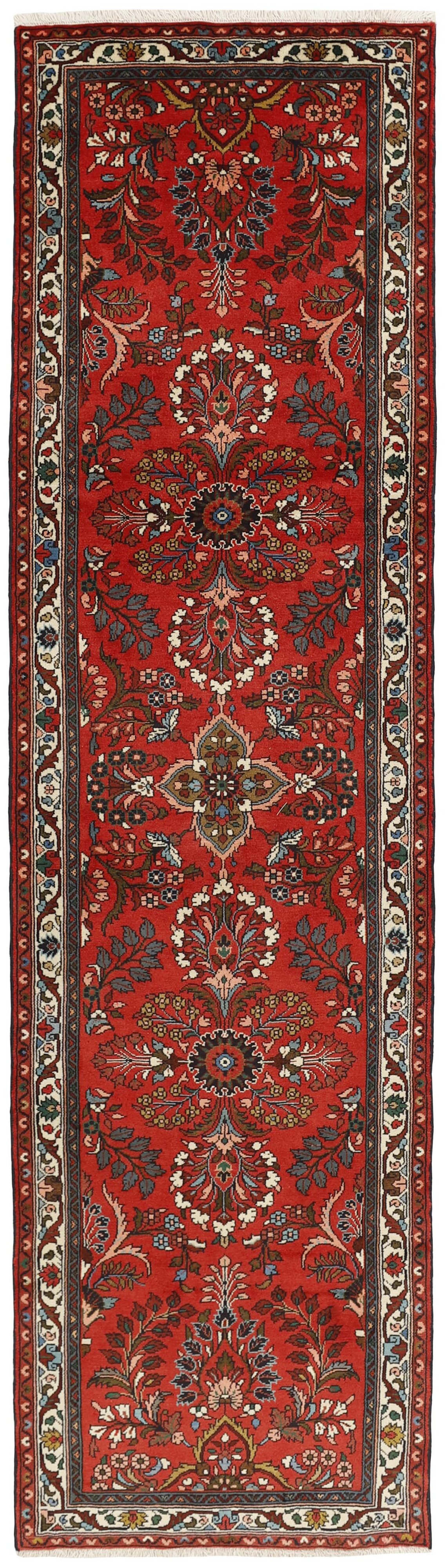 AsadabadItem no.: 1514402 Size: 83 cm x 302 cmThis rug is from the district of Hamadan which is an important centre for the rug trade, as well as the most productive rug production area of Iran. Hamadan is a major city with hundreds of thousands of people. Like Ekbatan, it was a main city of the Achemenian kings. It has an indigenous Jewish population and numerous monuments, of which the most important are the tombs of Esther and Mordicai (central to Jewish pilgrims), and the tomb at Avicenna. Hamadan is a provincial capitol. Two types of rugs are knotted. One is the so-called “city rug”, also known as the Shahrbaff. The production is modern and largely state controlled. The village production, however, is much more important; Hamadan is a market city for many rug producing villages that each has its own pattern. Most prominent are Borchalu, Tuserkman, Memraban, Khamseh, Begardeh, Enjilas, Hosseinabad, and Zandjan. There is a wide range of patterns but the quality is very consistent. The colours are strong, and often plant colours. The patterns are daring, although random, and Hosseinabad and Enjilas in particular are known for through going patterns. The rugs are usually not much bigger than 3 by 2 metres.