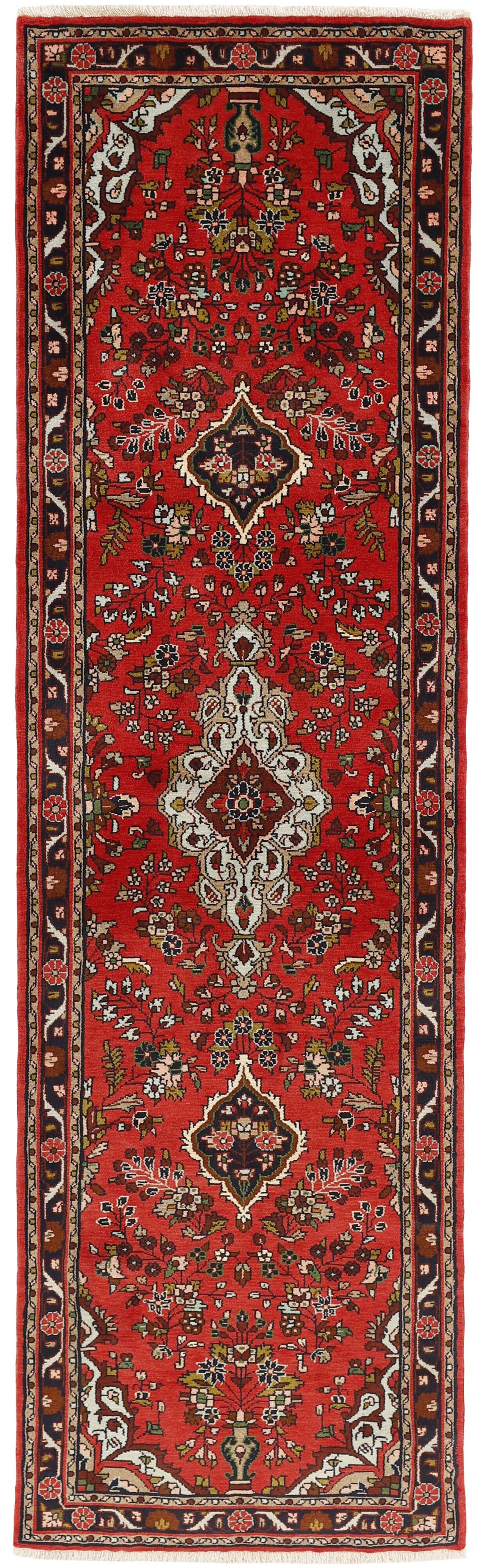 AsadabadItem no.: 1514409 Size: 82 cm x 289 cmThis rug is from the district of Hamadan which is an important centre for the rug trade, as well as the most productive rug production area of Iran. Hamadan is a major city with hundreds of thousands of people. Like Ekbatan, it was a main city of the Achemenian kings. It has an indigenous Jewish population and numerous monuments, of which the most important are the tombs of Esther and Mordicai (central to Jewish pilgrims), and the tomb at Avicenna. Hamadan is a provincial capitol. Two types of rugs are knotted. One is the so-called “city rug”, also known as the Shahrbaff. The production is modern and largely state controlled. The village production, however, is much more important; Hamadan is a market city for many rug producing villages that each has its own pattern. Most prominent are Borchalu, Tuserkman, Memraban, Khamseh, Begardeh, Enjilas, Hosseinabad, and Zandjan. There is a wide range of patterns but the quality is very consistent. The colours are strong, and often plant colours. The patterns are daring, although random, and Hosseinabad and Enjilas in particular are known for through going patterns. The rugs are usually not much bigger than 3 by 2 metres.