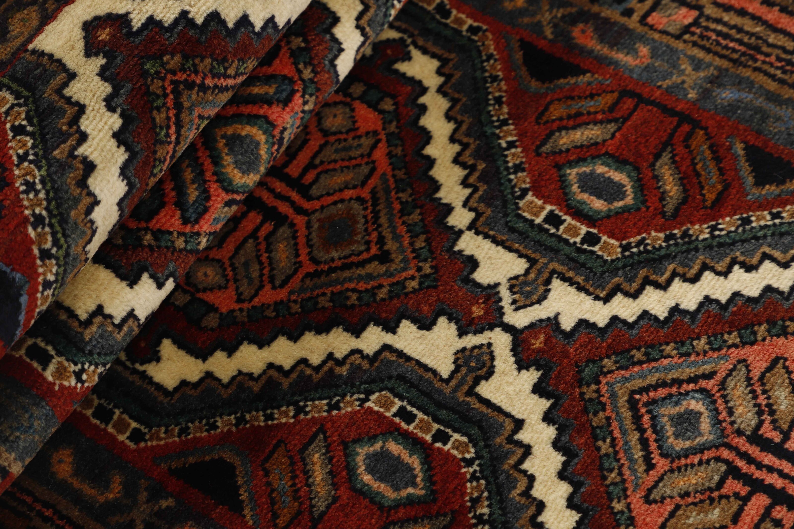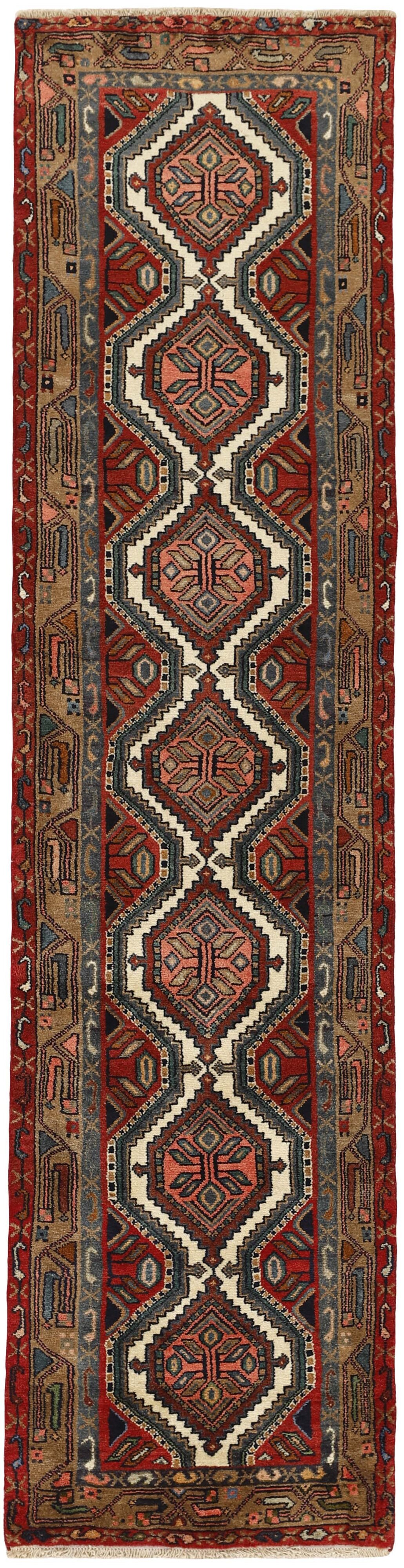 AsadabadItem no.: 1514414 Size: 75 cm x 303 cmThis rug is from the district of Hamadan which is an important centre for the rug trade, as well as the most productive rug production area of Iran. Hamadan is a major city with hundreds of thousands of people. Like Ekbatan, it was a main city of the Achemenian kings. It has an indigenous Jewish population and numerous monuments, of which the most important are the tombs of Esther and Mordicai (central to Jewish pilgrims), and the tomb at Avicenna. Hamadan is a provincial capitol. Two types of rugs are knotted. One is the so-called “city rug”, also known as the Shahrbaff. The production is modern and largely state controlled. The village production, however, is much more important; Hamadan is a market city for many rug producing villages that each has its own pattern. Most prominent are Borchalu, Tuserkman, Memraban, Khamseh, Begardeh, Enjilas, Hosseinabad, and Zandjan. There is a wide range of patterns but the quality is very consistent. The colours are strong, and often plant colours. The patterns are daring, although random, and Hosseinabad and Enjilas in particular are known for through going patterns. The rugs are usually not much bigger than 3 by 2 metres.