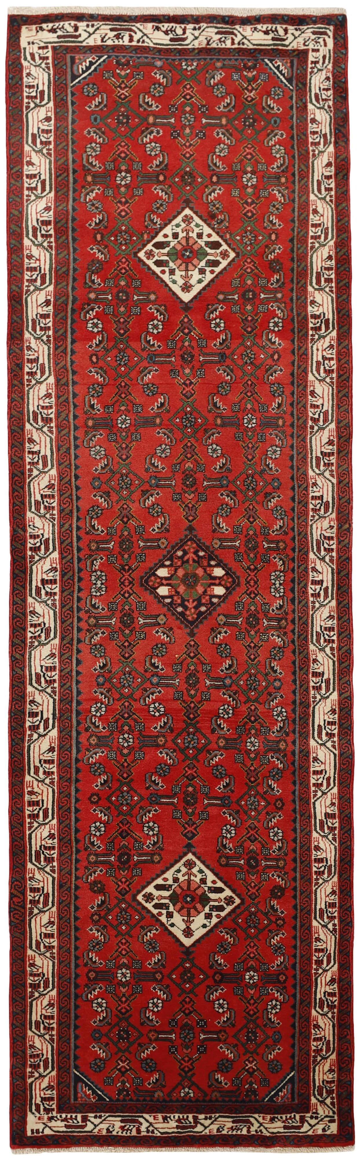 AsadabadItem no.: 1514425 Size: 88 cm x 291 cmThis rug is from the district of Hamadan which is an important centre for the rug trade, as well as the most productive rug production area of Iran. Hamadan is a major city with hundreds of thousands of people. Like Ekbatan, it was a main city of the Achemenian kings. It has an indigenous Jewish population and numerous monuments, of which the most important are the tombs of Esther and Mordicai (central to Jewish pilgrims), and the tomb at Avicenna. Hamadan is a provincial capitol. Two types of rugs are knotted. One is the so-called “city rug”, also known as the Shahrbaff. The production is modern and largely state controlled. The village production, however, is much more important; Hamadan is a market city for many rug producing villages that each has its own pattern. Most prominent are Borchalu, Tuserkman, Memraban, Khamseh, Begardeh, Enjilas, Hosseinabad, and Zandjan. There is a wide range of patterns but the quality is very consistent. The colours are strong, and often plant colours. The patterns are daring, although random, and Hosseinabad and Enjilas in particular are known for through going patterns. The rugs are usually not much bigger than 3 by 2 metres.