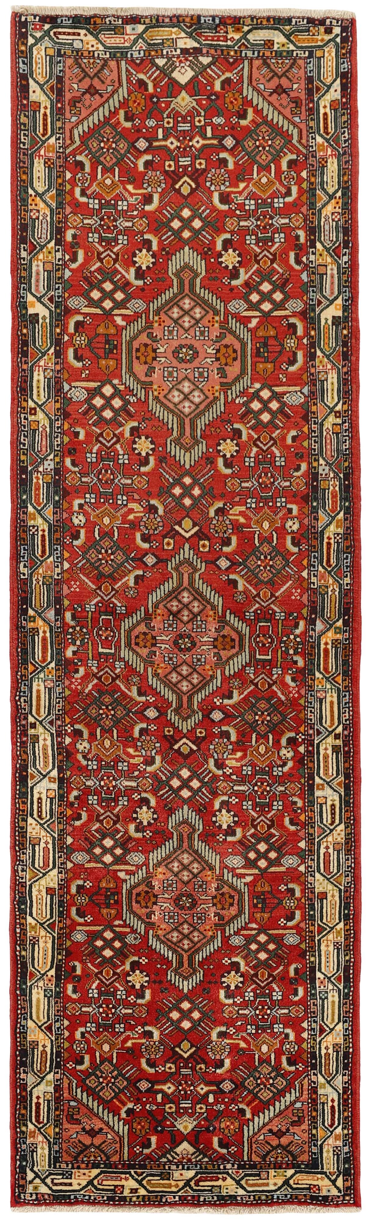 AsadabadItem no.: 1514439 Size: 80 cm x 277 cmThis rug is from the district of Hamadan which is an important centre for the rug trade, as well as the most productive rug production area of Iran. Hamadan is a major city with hundreds of thousands of people. Like Ekbatan, it was a main city of the Achemenian kings. It has an indigenous Jewish population and numerous monuments, of which the most important are the tombs of Esther and Mordicai (central to Jewish pilgrims), and the tomb at Avicenna. Hamadan is a provincial capitol. Two types of rugs are knotted. One is the so-called “city rug”, also known as the Shahrbaff. The production is modern and largely state controlled. The village production, however, is much more important; Hamadan is a market city for many rug producing villages that each has its own pattern. Most prominent are Borchalu, Tuserkman, Memraban, Khamseh, Begardeh, Enjilas, Hosseinabad, and Zandjan. There is a wide range of patterns but the quality is very consistent. The colours are strong, and often plant colours. The patterns are daring, although random, and Hosseinabad and Enjilas in particular are known for through going patterns. The rugs are usually not much bigger than 3 by 2 metres.