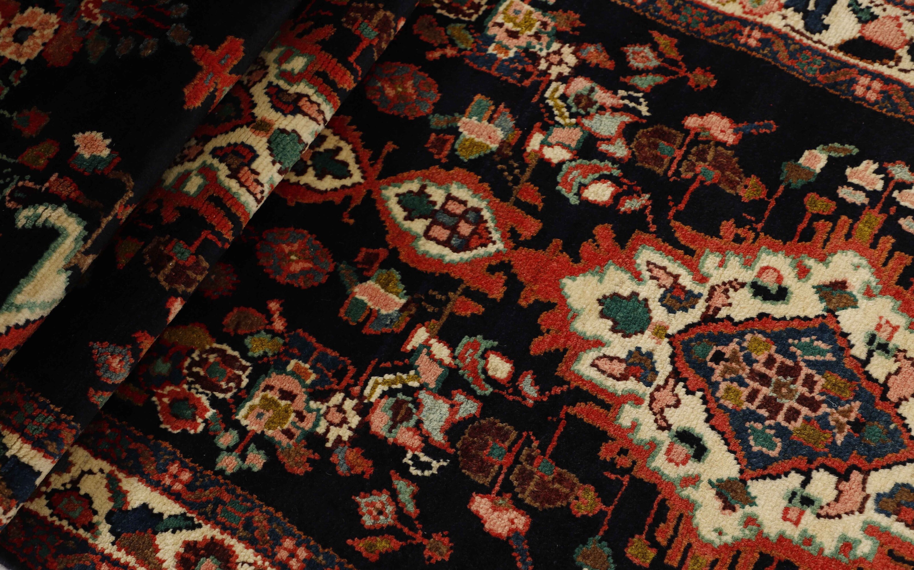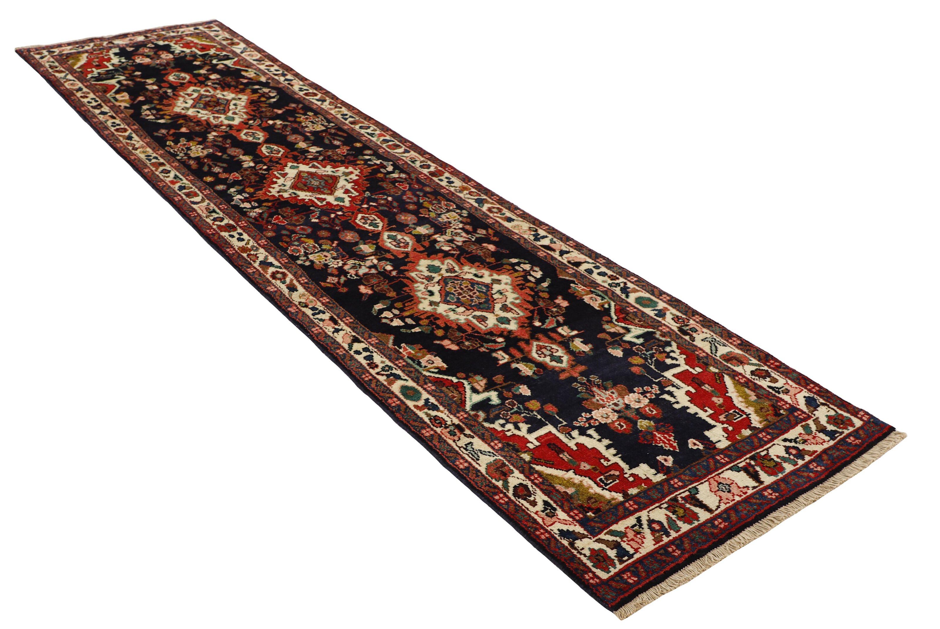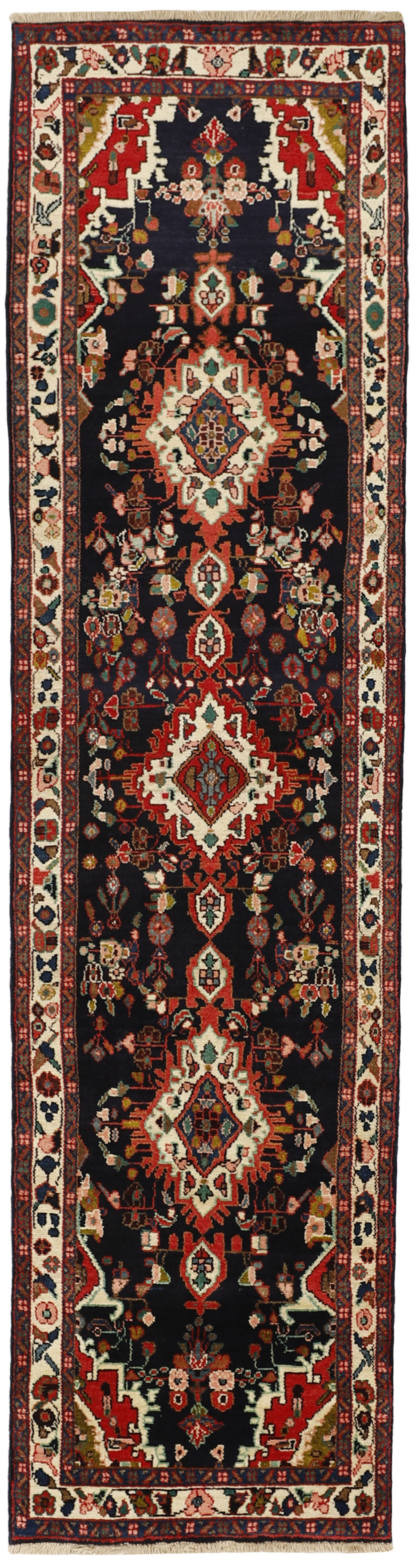 AsadabadItem no.: 1514445 Size: 82 cm x 328 cmThis rug is from the district of Hamadan which is an important centre for the rug trade, as well as the most productive rug production area of Iran. Hamadan is a major city with hundreds of thousands of people. Like Ekbatan, it was a main city of the Achemenian kings. It has an indigenous Jewish population and numerous monuments, of which the most important are the tombs of Esther and Mordicai (central to Jewish pilgrims), and the tomb at Avicenna. Hamadan is a provincial capitol. Two types of rugs are knotted. One is the so-called “city rug”, also known as the Shahrbaff. The production is modern and largely state controlled. The village production, however, is much more important; Hamadan is a market city for many rug producing villages that each has its own pattern. Most prominent are Borchalu, Tuserkman, Memraban, Khamseh, Begardeh, Enjilas, Hosseinabad, and Zandjan. There is a wide range of patterns but the quality is very consistent. The colours are strong, and often plant colours. The patterns are daring, although random, and Hosseinabad and Enjilas in particular are known for through going patterns. The rugs are usually not much bigger than 3 by 2 metres.